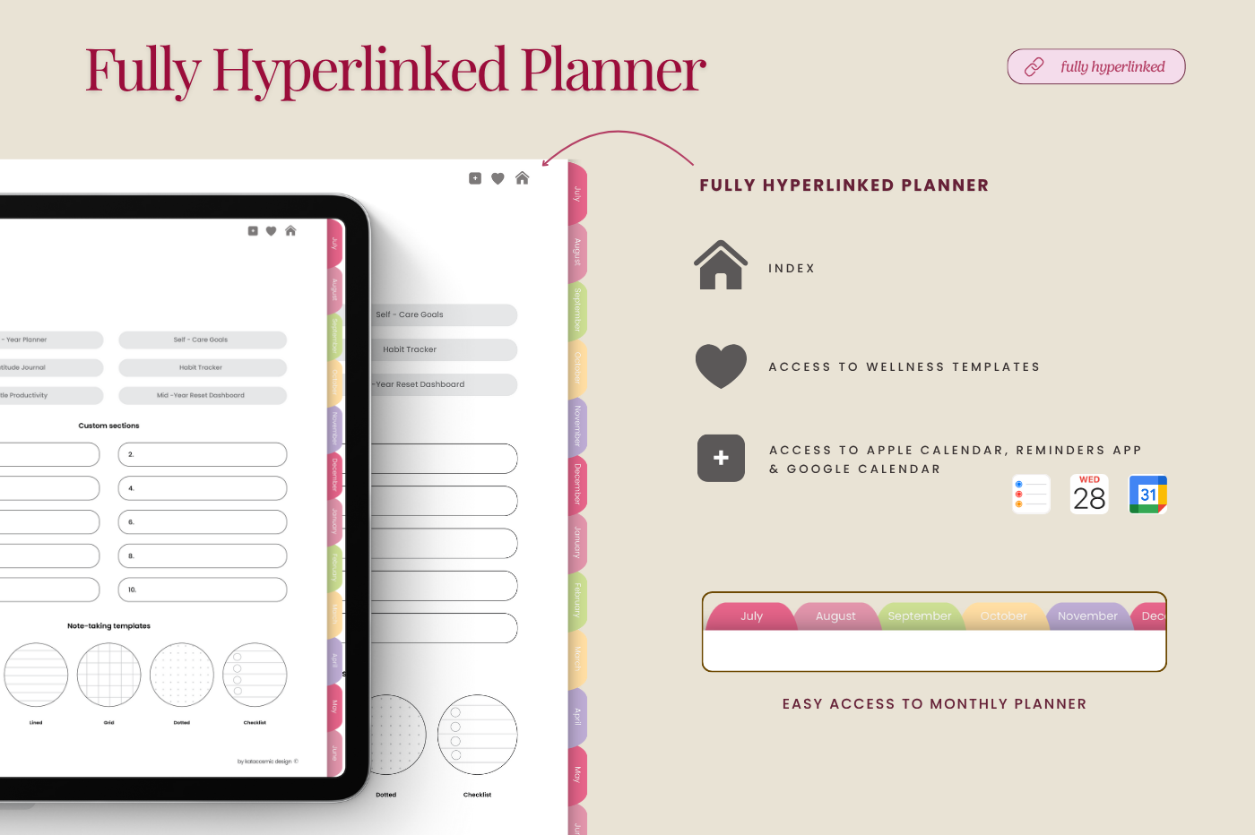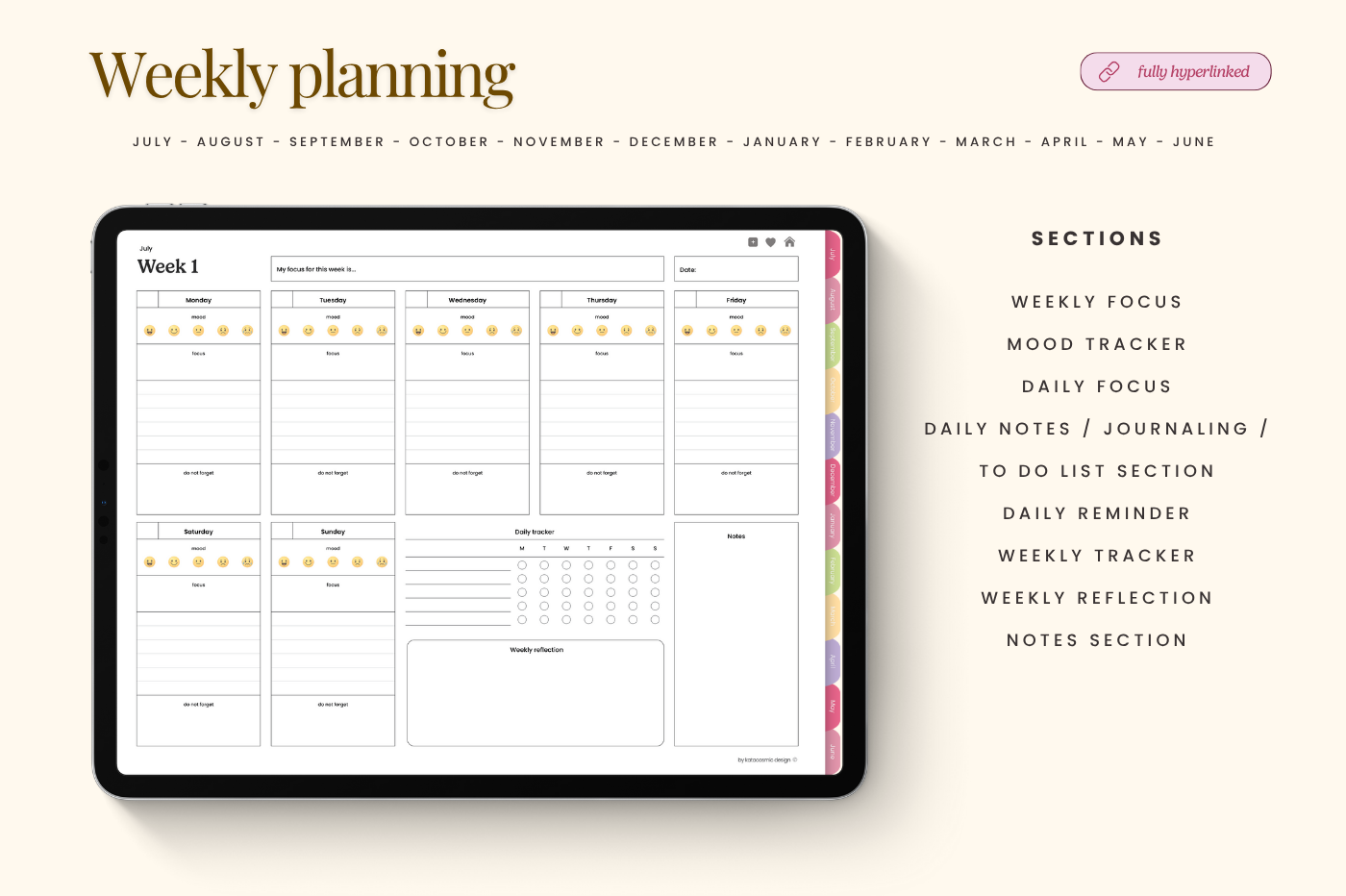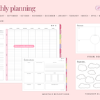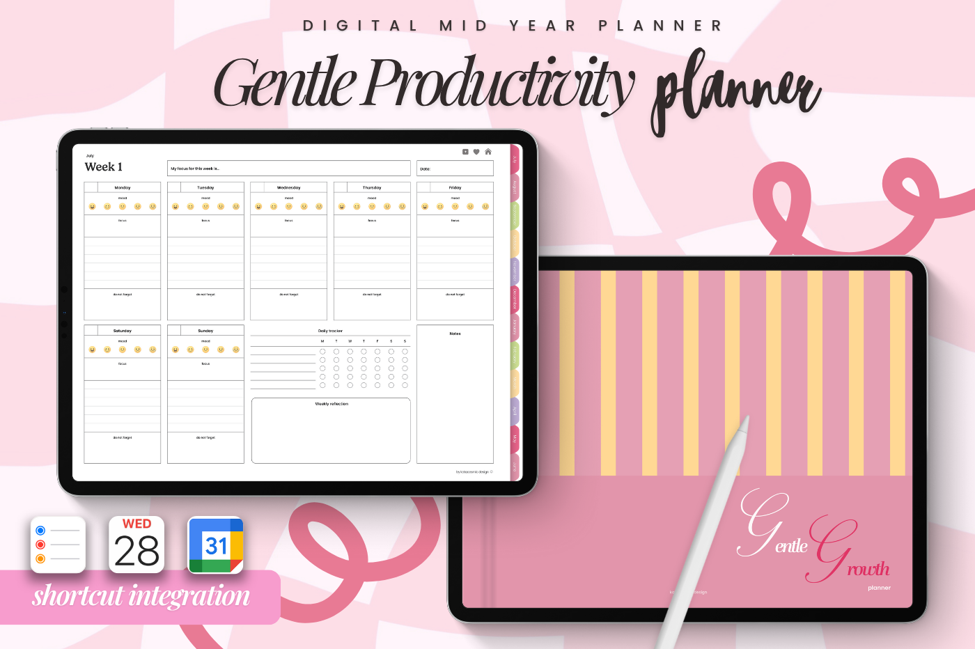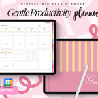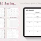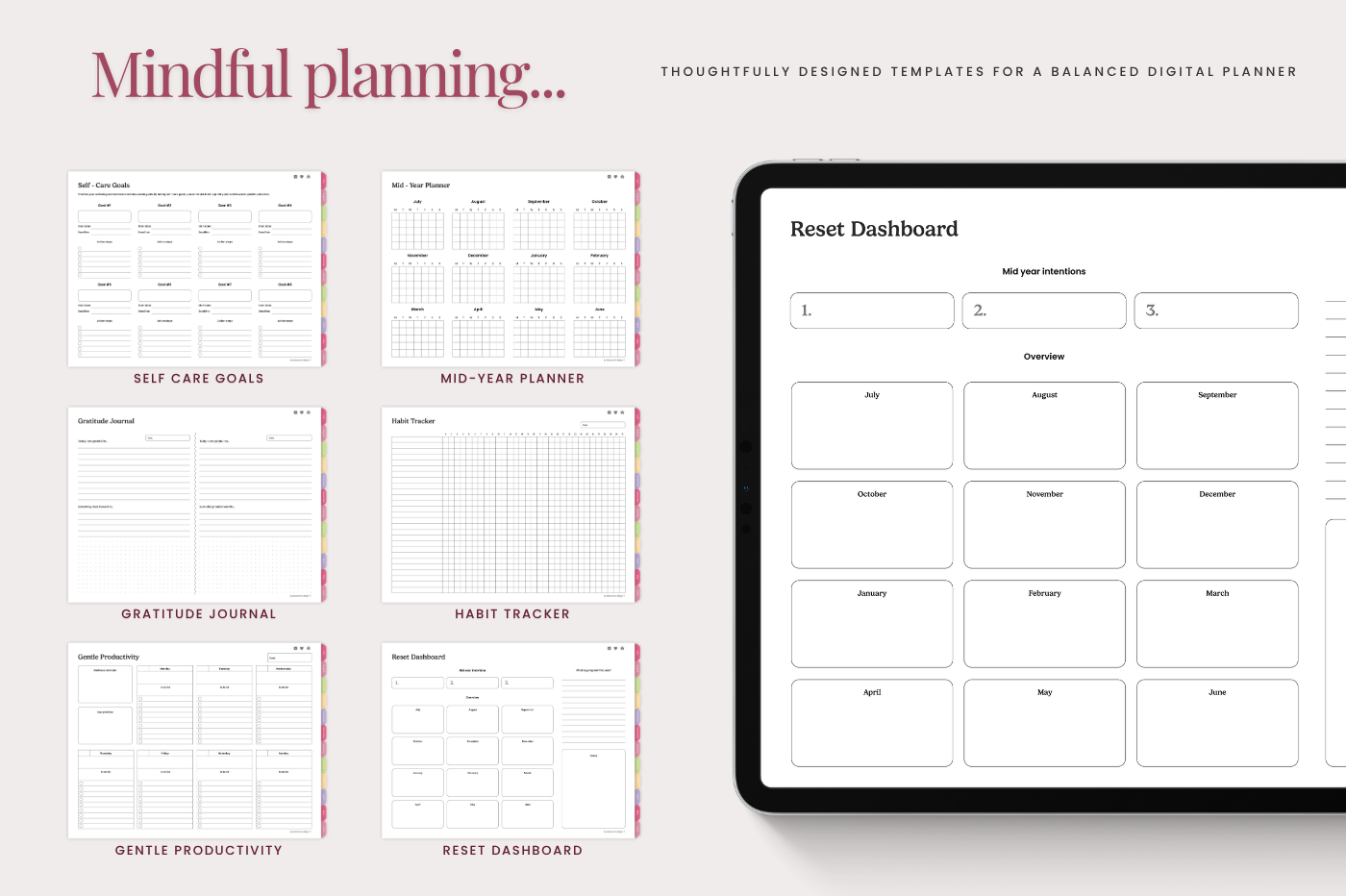 A mid-year planner that combines monthly/weekly templates with vision boards, thought clouds, reflections, and wellness tools for gentle productivity. Perfect for ADHD or anyone seeking balance, its soothing, flexible design fosters focus, reduces stress, and supports sustainable well-being.