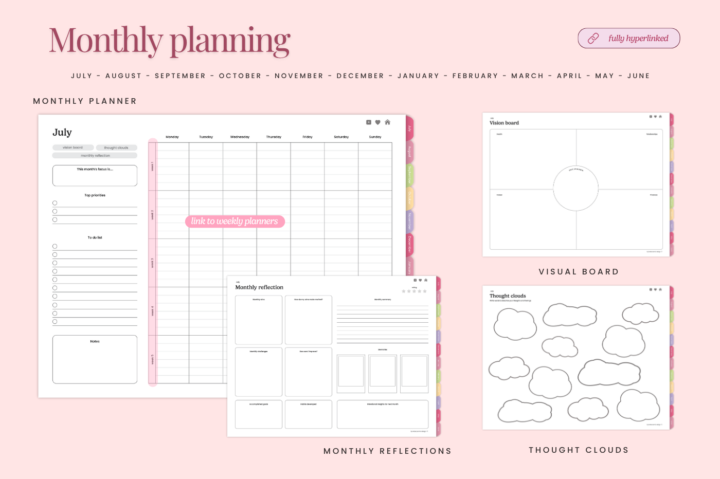 Mid-year planner with monthly vision boards, thought clouds, and reflections for goal-setting and gentle productivity.