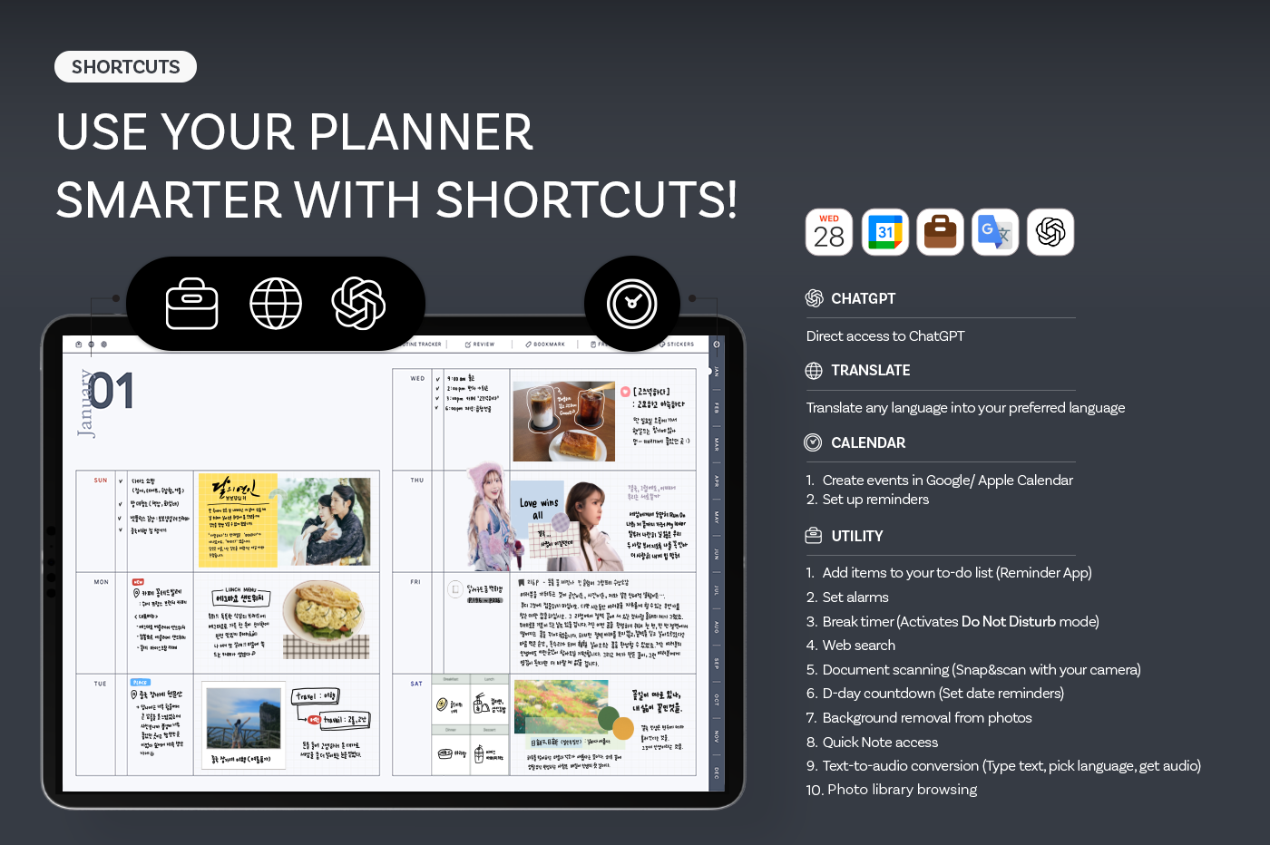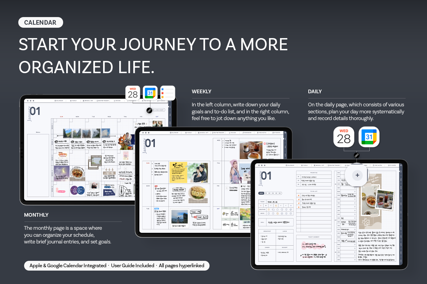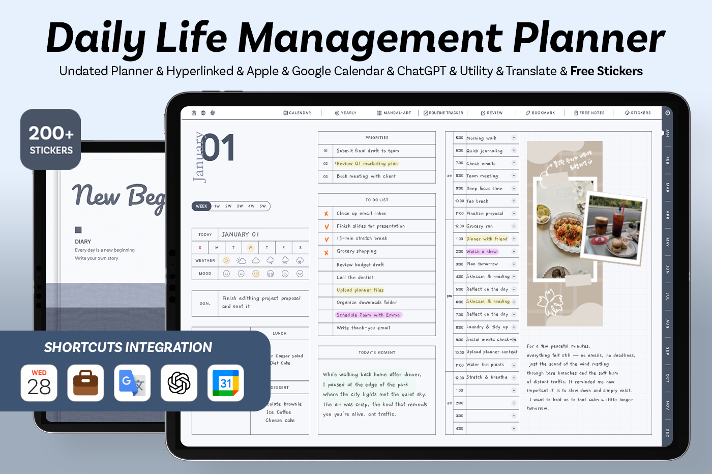 An undated all-in-one diary designed for daily journaling, schedule management, and goal setting. [Page Composition] - User Guide - Apple & Google Calendar Integration - Shortcuts Integration (Utility, Google Translate, ChatGPT) - Sunday Start - Hyperlinks - Calendar - Yearly / Monthly / Weekly / Daily Plans - Mandal-art - Routine Tracker - Review - Bookmarks - Notes (6) - Sticker Pages