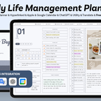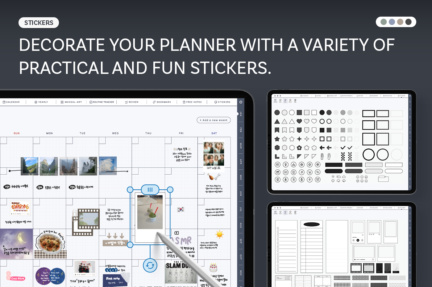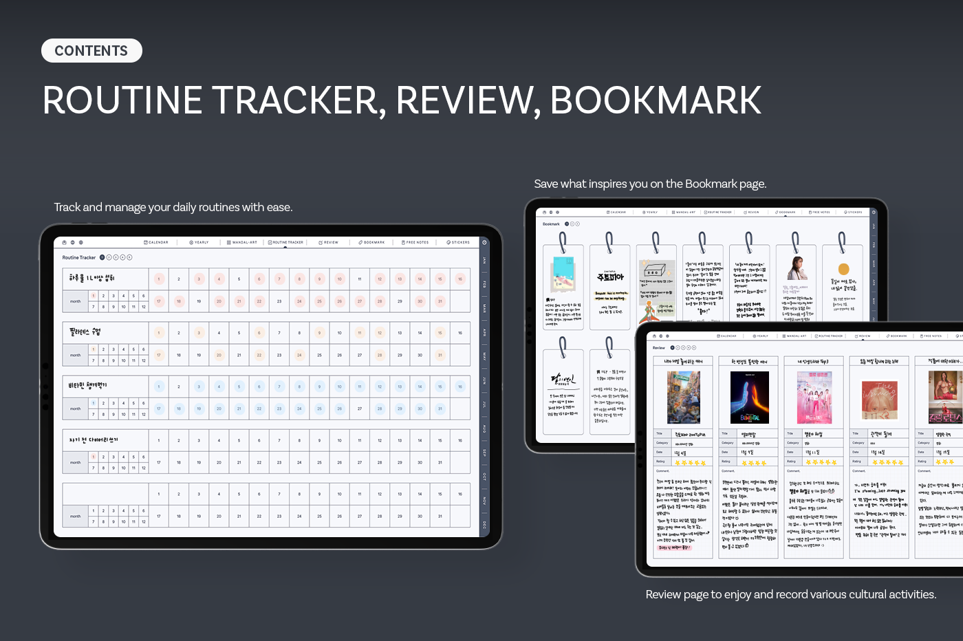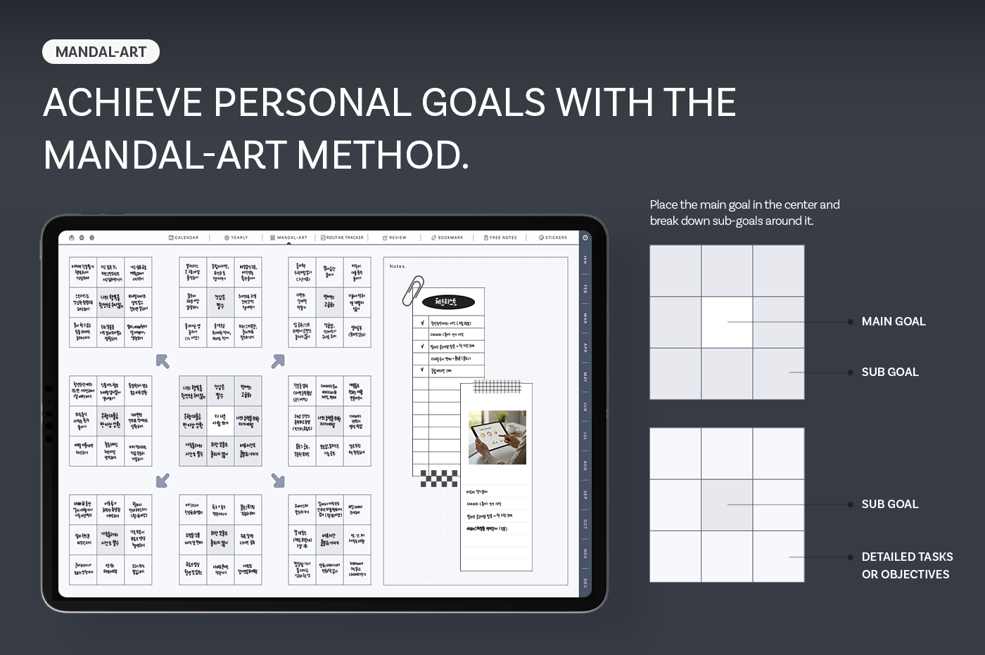 An undated all-in-one diary designed for daily journaling, schedule management, and goal setting. [Page Composition] - User Guide - Apple & Google Calendar Integration - Shortcuts Integration (Utility, Google Translate, ChatGPT) - Sunday Start - Hyperlinks - Calendar - Yearly / Monthly / Weekly / Daily Plans - Mandal-art - Routine Tracker - Review - Bookmarks - Notes (6) - Sticker Pages
