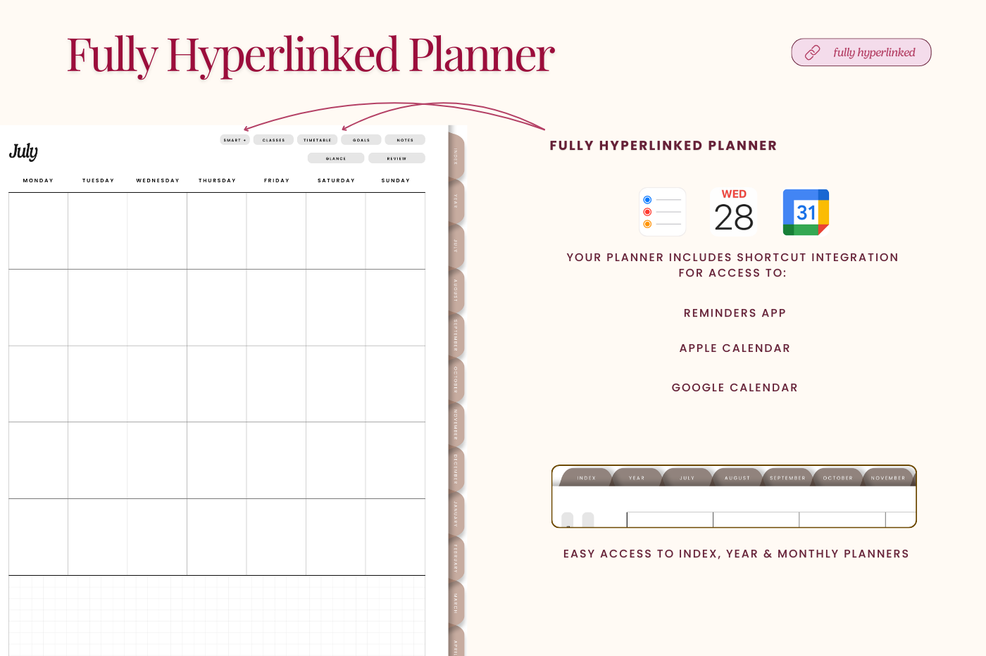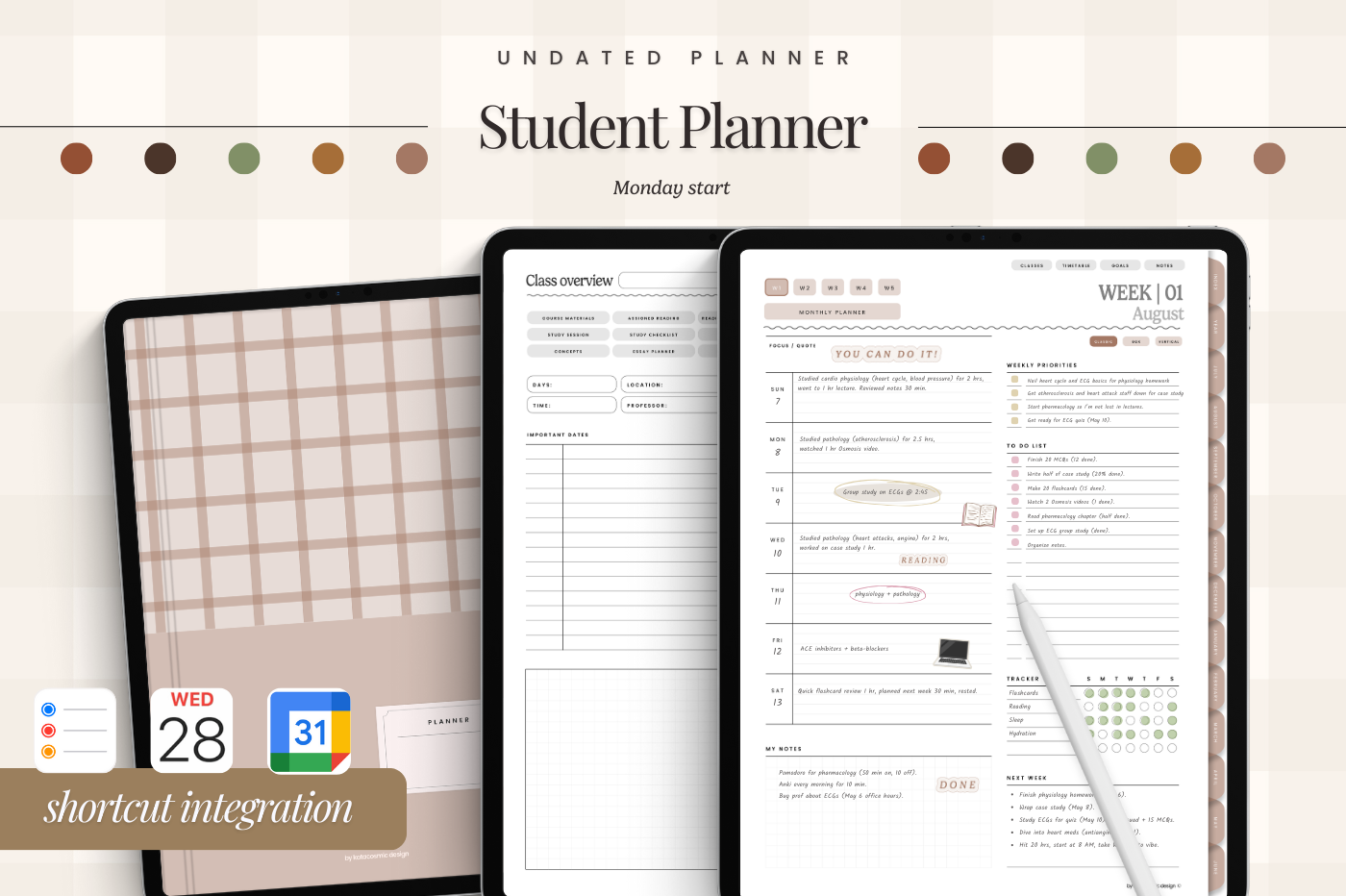 Stay on top of your schedule with a planner that goes beyond dates—it helps you stay focused, productive, and in control. Designed for students and lifelong learners, it combines scheduling, assignment tracking, and goal-setting in one place. Integrated with Apple Calendar, Google Calendar, and the Reminders app, your tasks and deadlines sync seamlessly, making it the perfect tool to stay organized and achieve your goals.