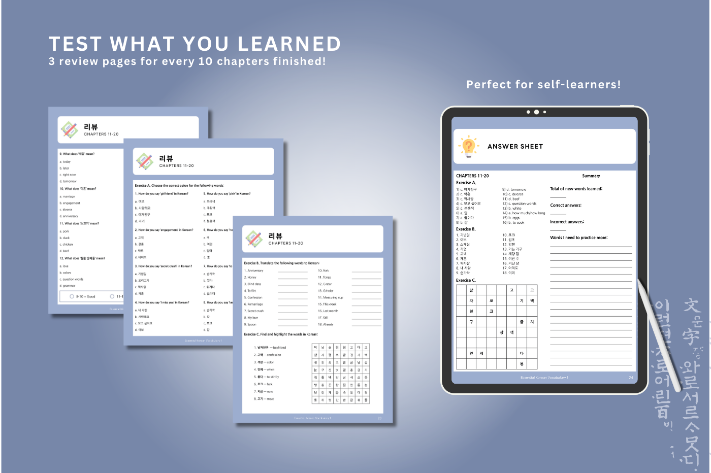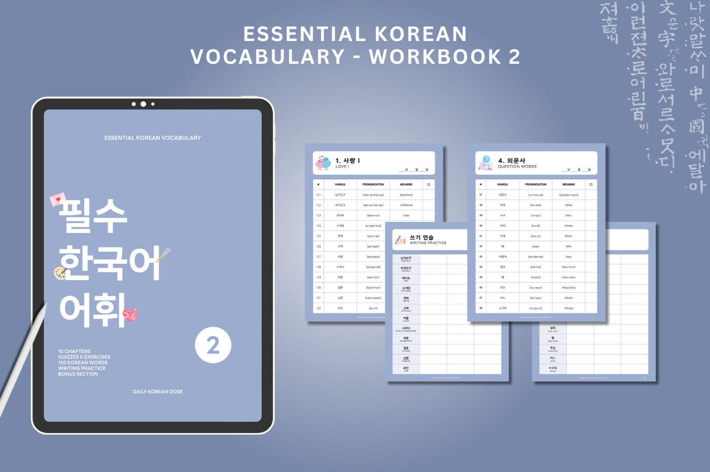Boost your Hangul handwriting skills through fun and practical exercises while learning 120 Korean words!
