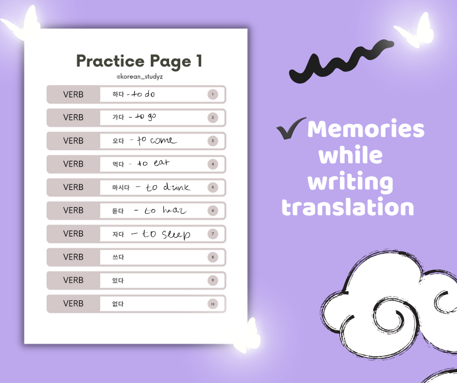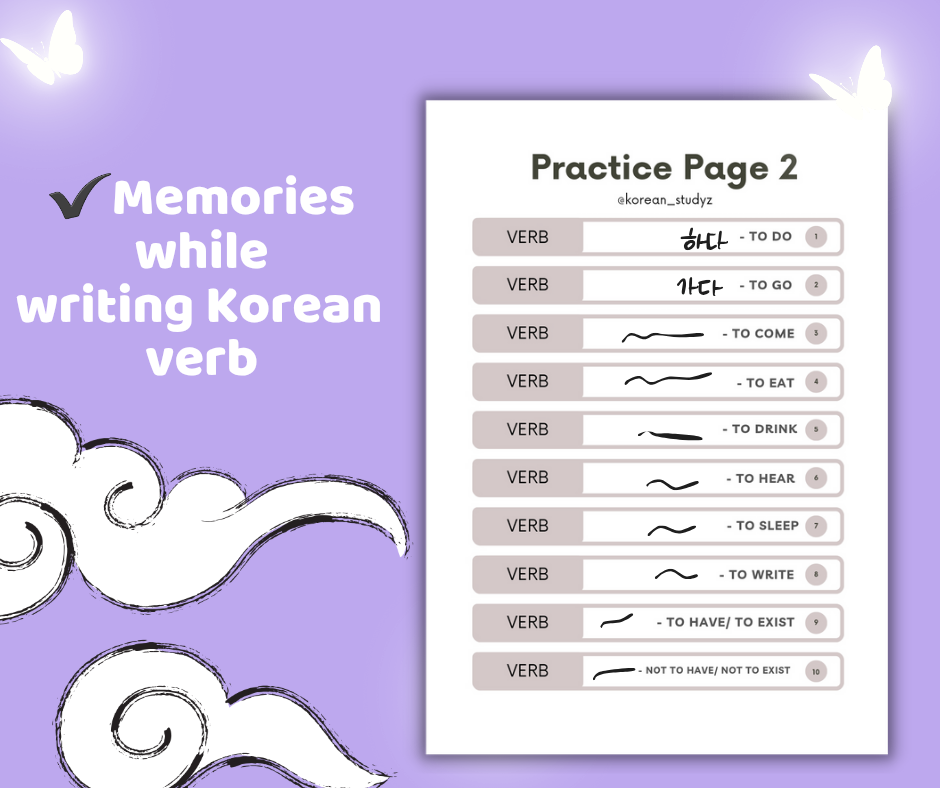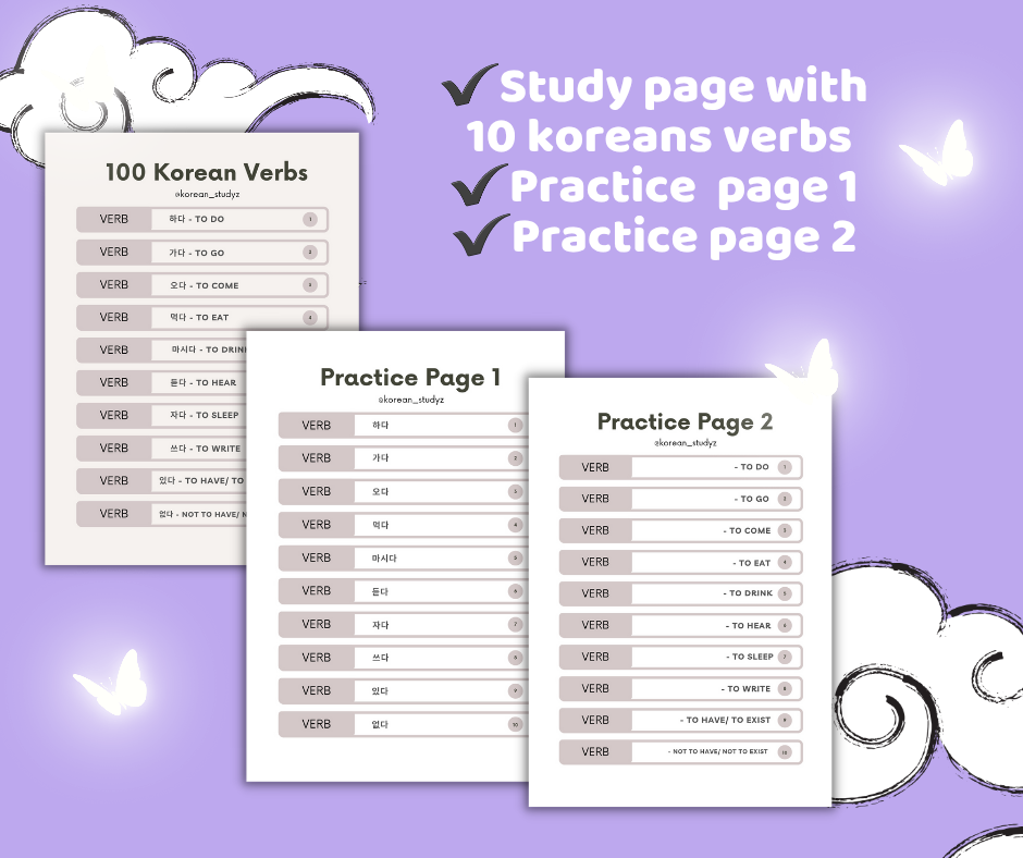 These Korean Verb Worksheets are designed to help learners build a strong vocabulary foundation by learning 100 of the most common and useful Korean verbs. Perfect for beginners and intermediate learners, these worksheets make studying simple, structured, and effective. đ Whatâs Inside: 100 essential Korean verbs with English meanings Two Writing practice pages to strengthen memory Easy-to-follow format for self-study or classroom use đ With these worksheets, youâll memories verbs very fast