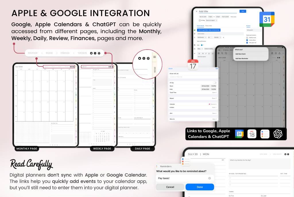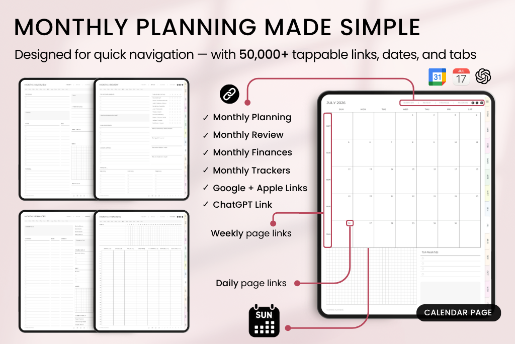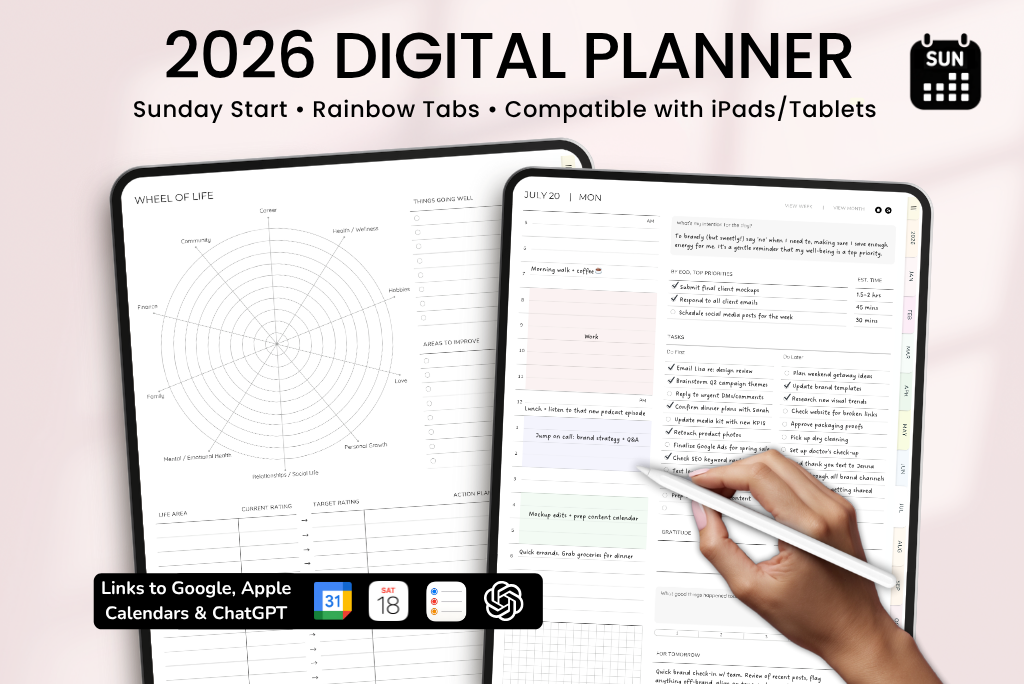 This is one of my most detailed digital planners, made to help you stay on top of daily life—productivity, work, goals, health, finances, fitness, wellness, self-care, lifestyle, notes, and more. It comes with a Sunday-start calendar, connects with Apple & Google Calendar, and includes a direct ChatGPT link for smart planning support.