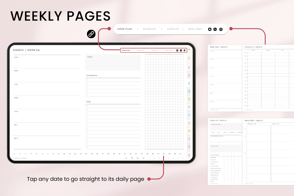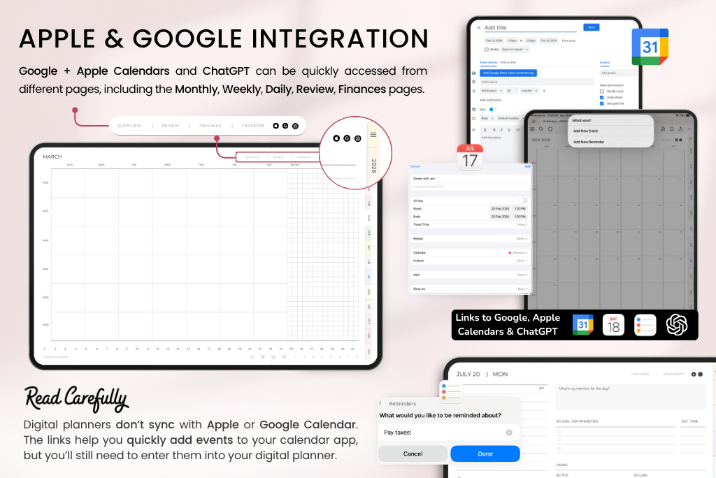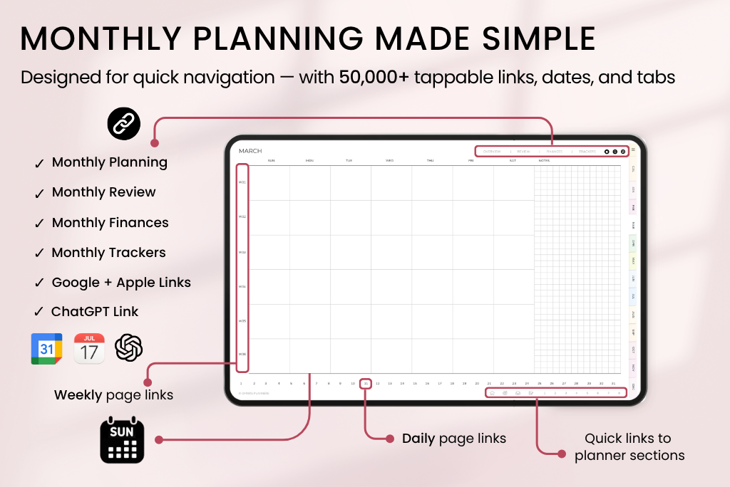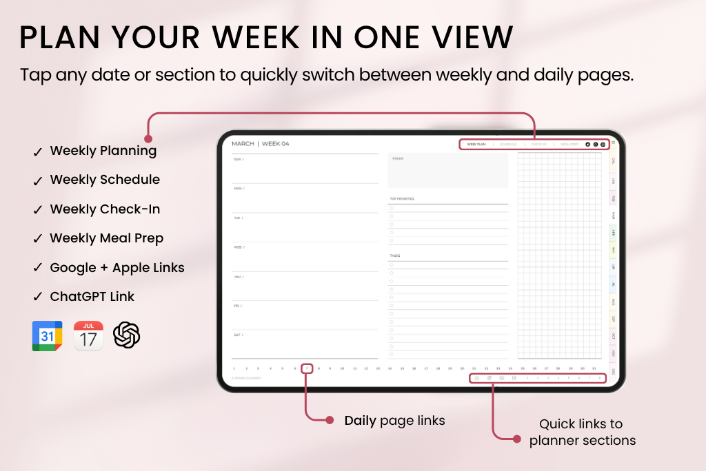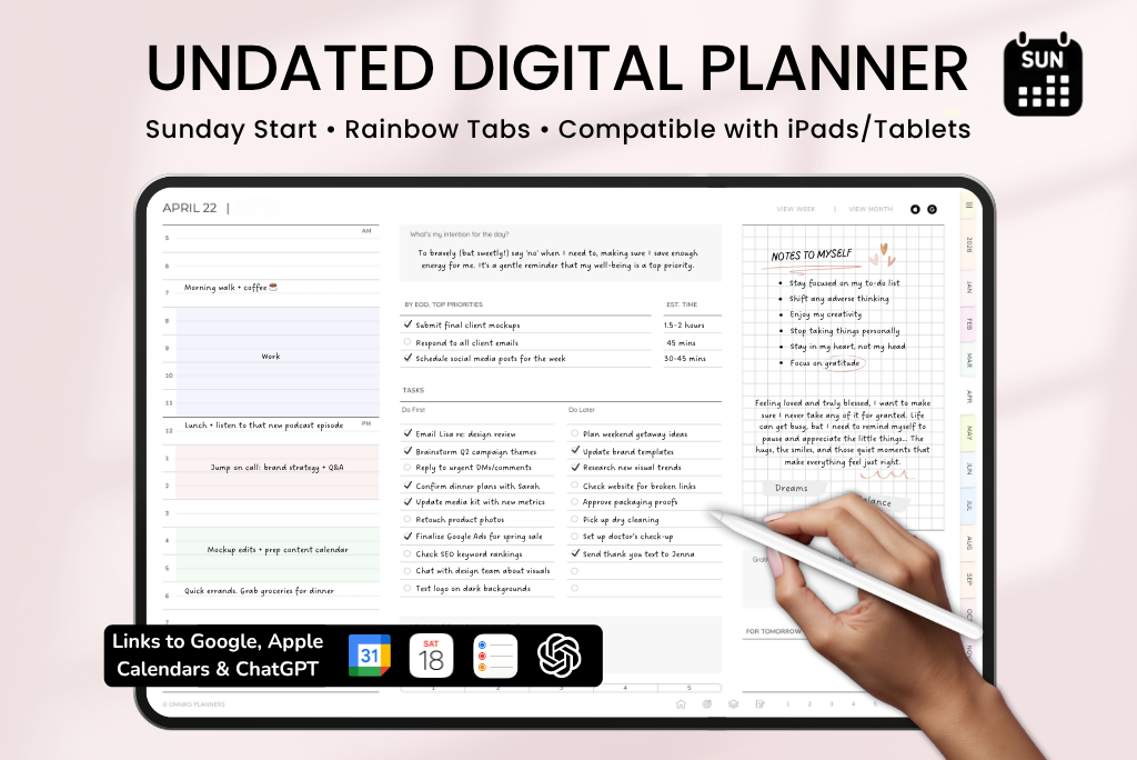 This undated digital planner includes all the same templates as the dated version—covering productivity, goals, health, finances, fitness, and self-care. Since it’s undated, you can start anytime and plan at your own pace. It comes with a Sunday-start calendar, syncs with Apple & Google Calendar, and includes a direct ChatGPT link for smart planning support.
