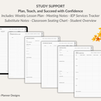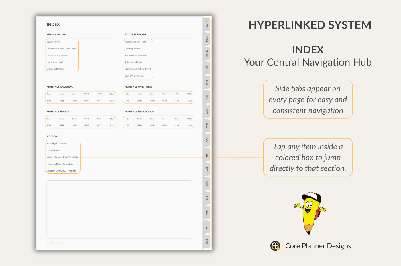 This Teacher Digital Planner is dated from July 2025 to June 2026, featuring a fully hyperlinked layout designed for lesson planning, classroom organization, and student records. Highlights • Dated July 2025 – June 2026 (365 daily pages) • Teaching tools: Weekly Lesson Plan · Meeting Notes · IEP Services Tracker · Substitute Notes · Classroom Seating Chart · Student Overview • Hyperlinked yearly, monthly, weekly, daily pages • Works with Apple Pencil & stylus