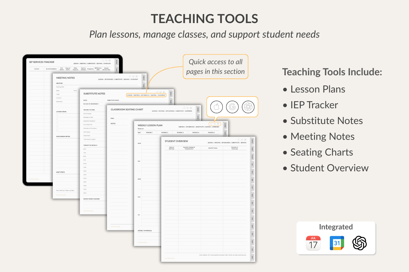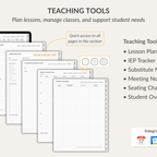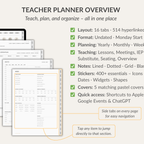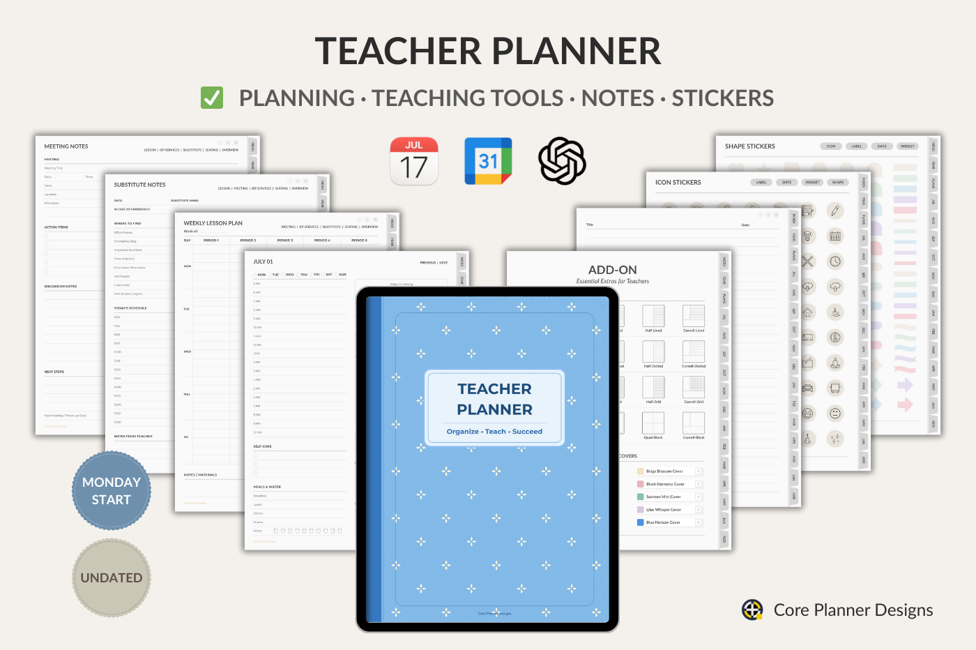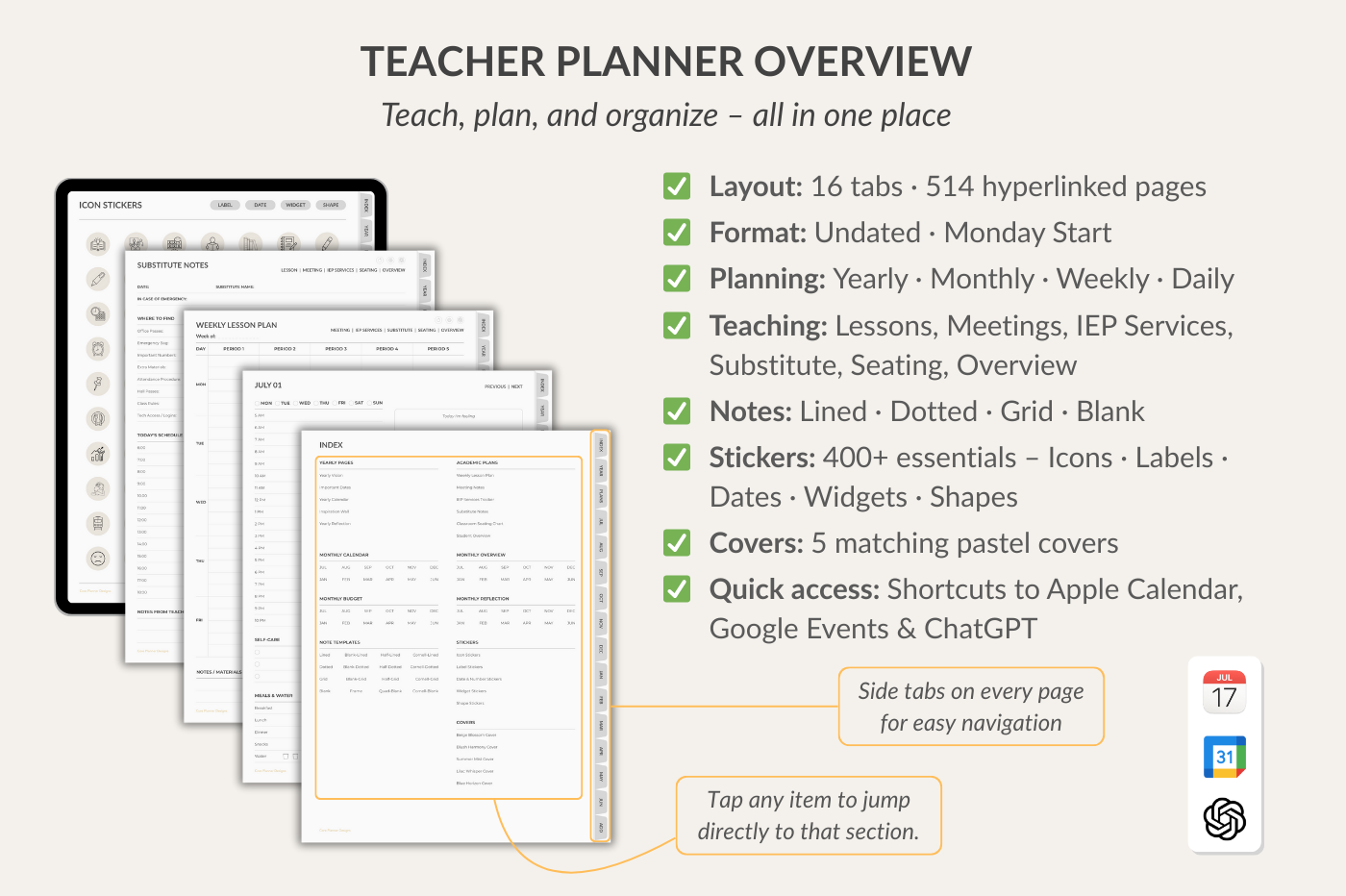 Reusable Teacher Planner with Monday start, designed to help teachers plan lessons and manage classrooms throughout the academic year (July–June). Use it year after year with flexible yearly, monthly, weekly, and daily layouts. Includes tools such as Lesson Plan, Student Overview, Seating Chart, IEP Tracker, Meeting Notes, and Sub Notes, plus note templates, stickers, and pastel covers. Fully hyperlinked with quick access to Apple Calendar, Google Events, and ChatGPT.