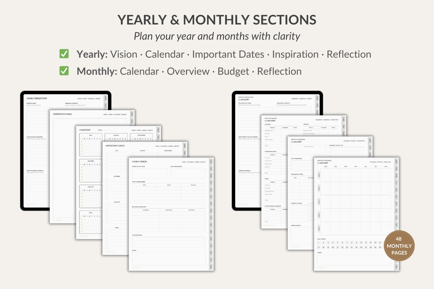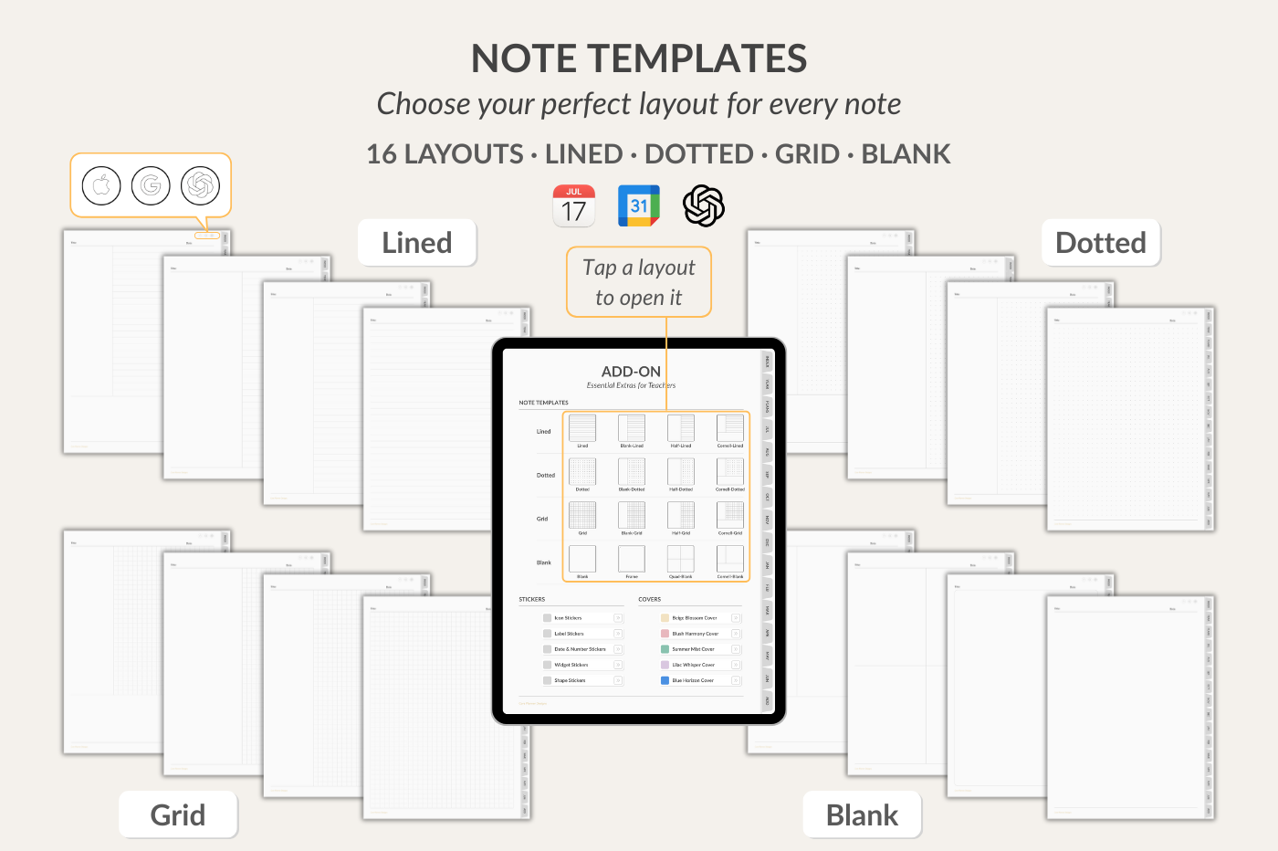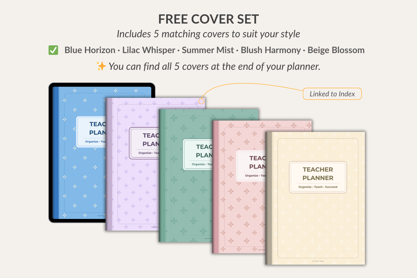 Reusable Teacher Planner with Monday start, designed to help teachers plan lessons and manage classrooms throughout the academic year (July–June). Use it year after year with flexible yearly, monthly, weekly, and daily layouts. Includes tools such as Lesson Plan, Student Overview, Seating Chart, IEP Tracker, Meeting Notes, and Sub Notes, plus note templates, stickers, and pastel covers. Fully hyperlinked with quick access to Apple Calendar, Google Events, and ChatGPT.
