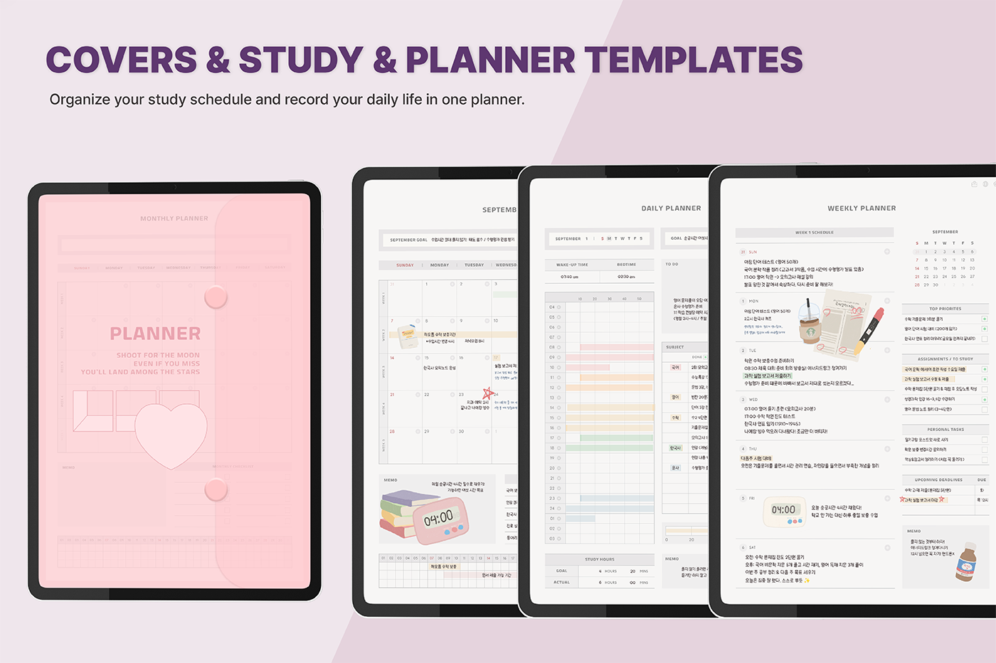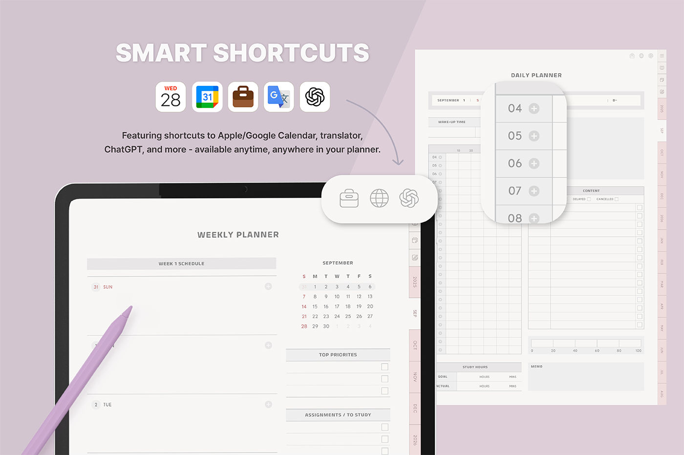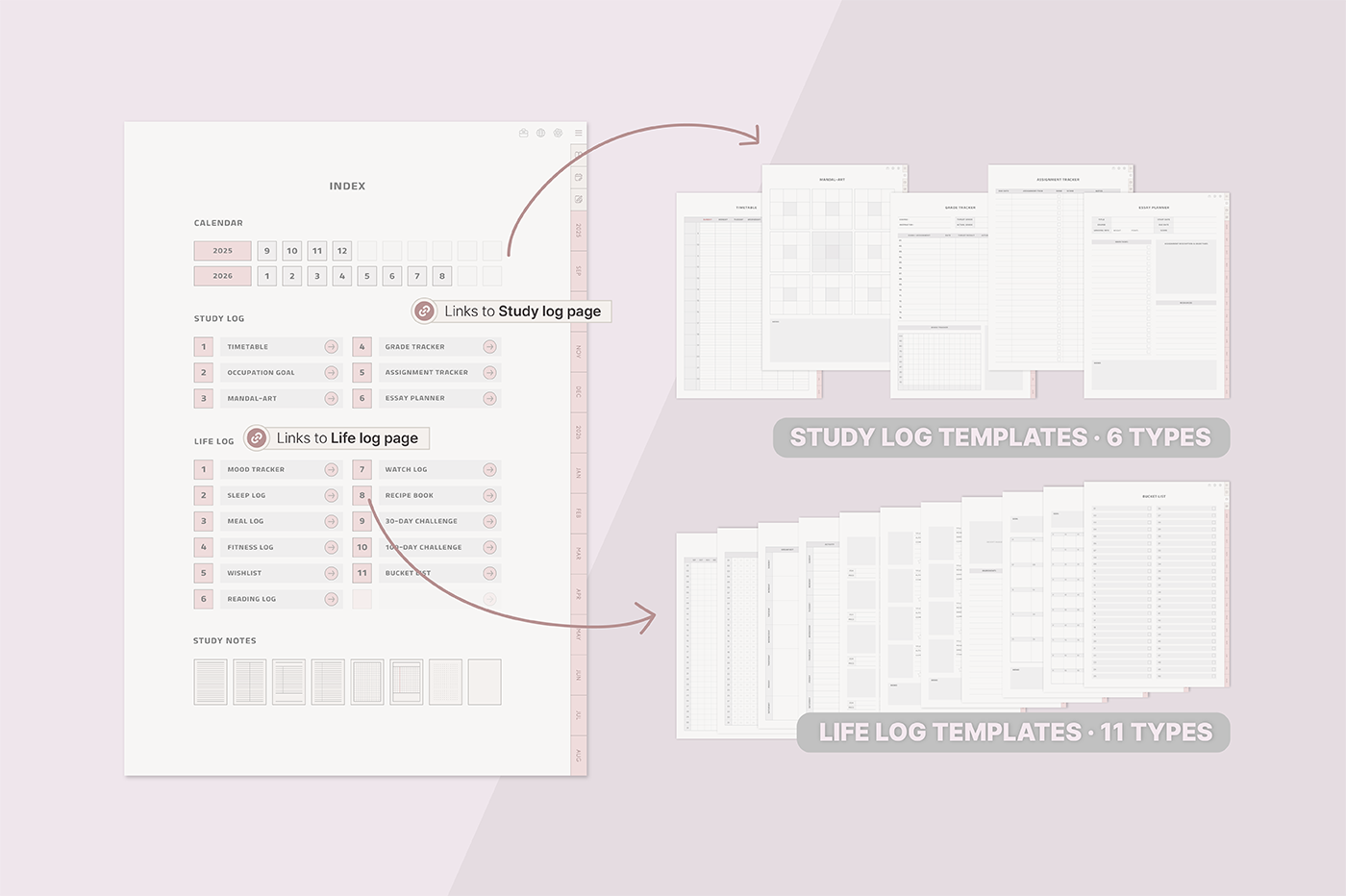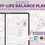[Page Composition] - User Guide - 2025.09 - 2026.08 - Apple & Google Calendar integration - Shortcuts integration (Utility, Google Traslate, ChatGPT) - Calendar - Monthly / Weekly / Daily Plans - Study Log : Timetable, Occupation Goal, Mandal-art, Grade Tracker, Assignment Tracker, Essay Planner - Life Log : Mood / Sleep / Meal / Fitness Log, Wishlist. Reading Log, 30-Day / 100-Day Challenge, etc. - Notes (8 types)