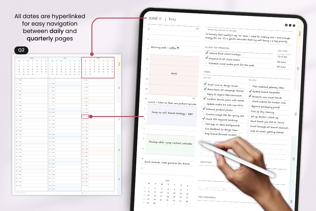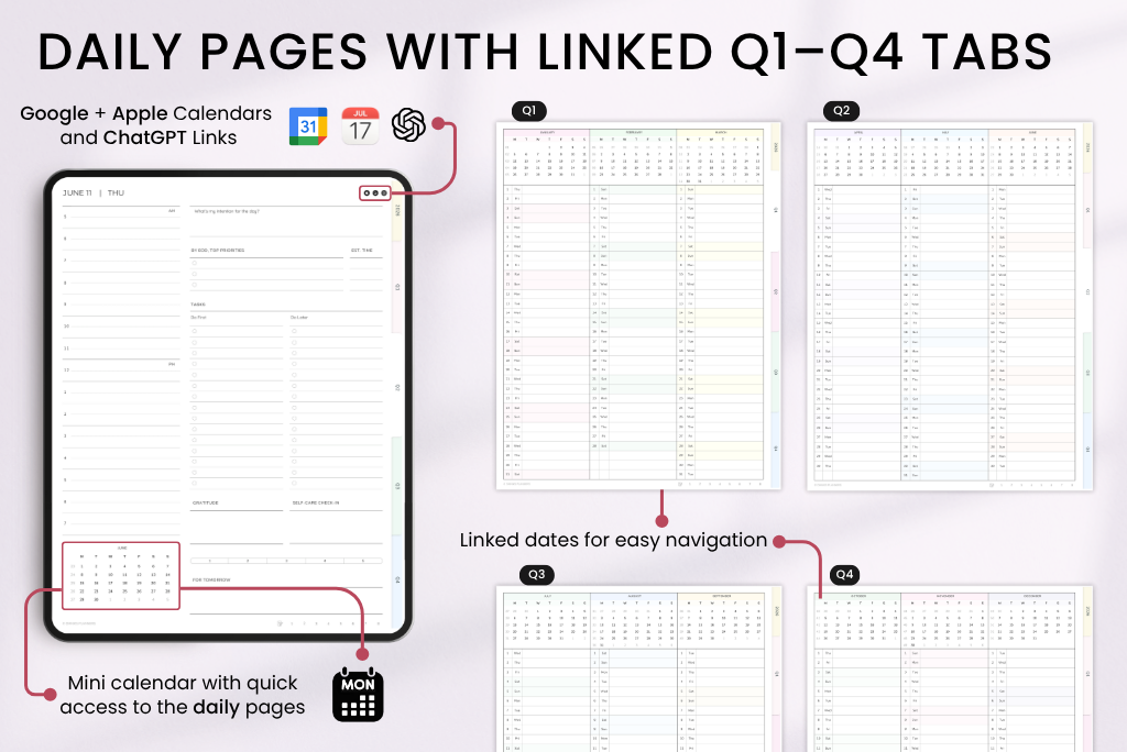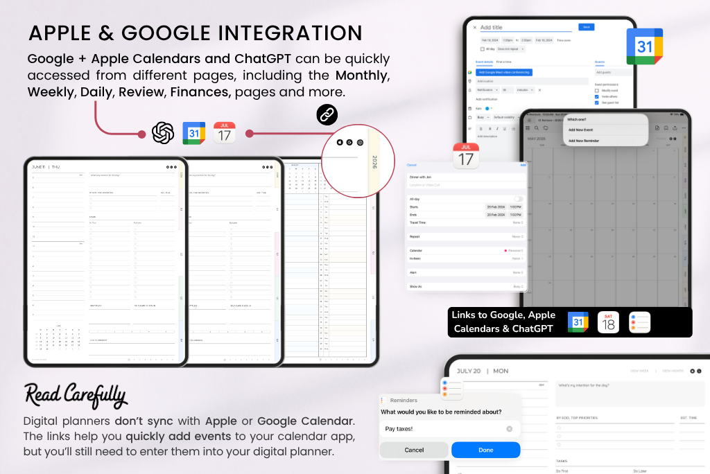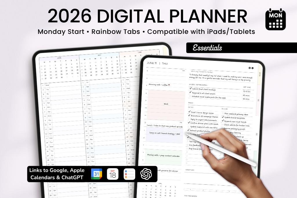 This 2026 Essentials Digital Planner is a simple, streamlined option for anyone who prefers a lighter setup. It includes daily pages and monthly overviews for easy planning, plus 8 notebook dividers and note pages for brainstorming, jotting things down, or even casual scribbles. It comes with a Monday-start calendar, syncs with Apple and Google Calendar, and includes a direct ChatGPT link for smart planning support.