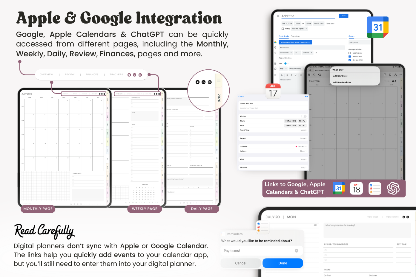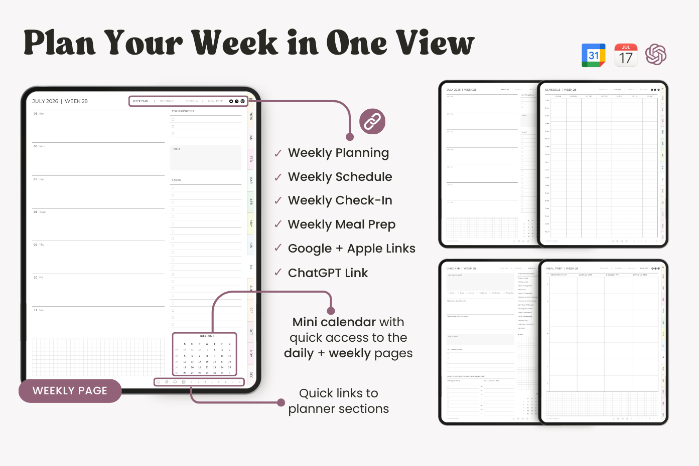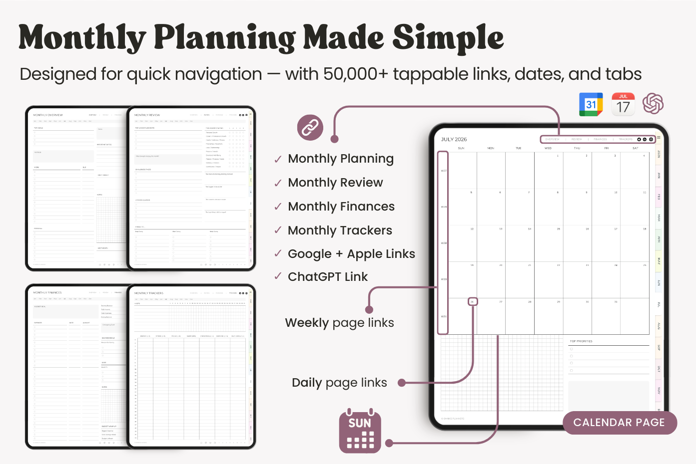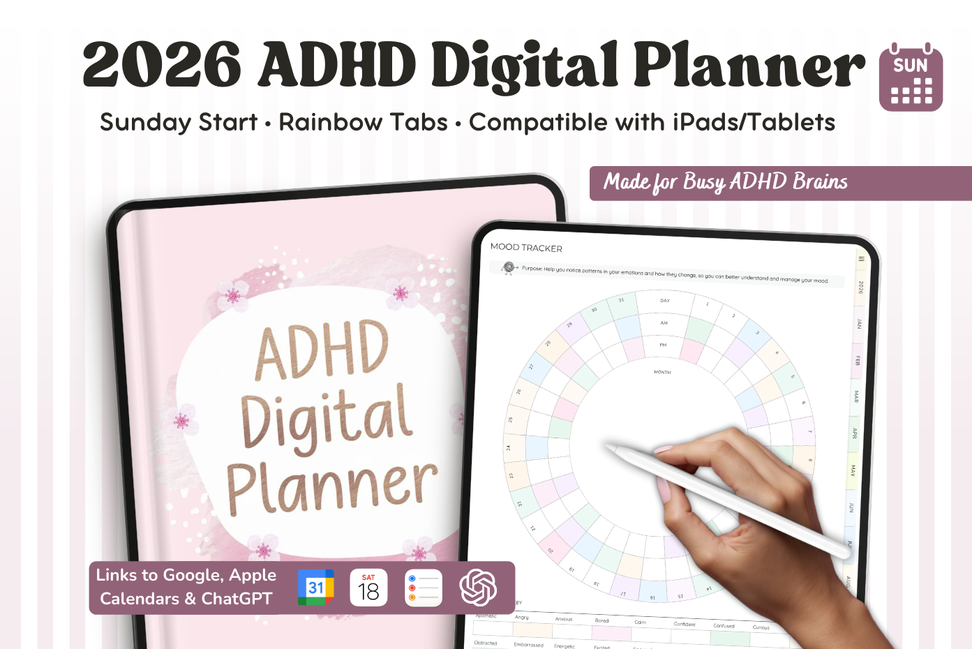This 2026 ADHD planner is made to support the way your brain works. It includes simple, practical templates to help with focus, memory, and balance, all laid out in a way that keeps things clear and less overwhelming. It comes with a Sunday-start calendar, Apple and Google Calendar integration, and a direct ChatGPT link for extra planning help when you need it.