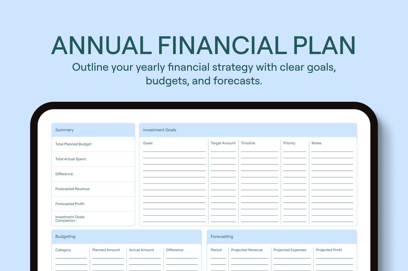 Use this template to set your budget,track spending,and plan investments. Get a clear view of your finances so you can stay focused on your goals all year.