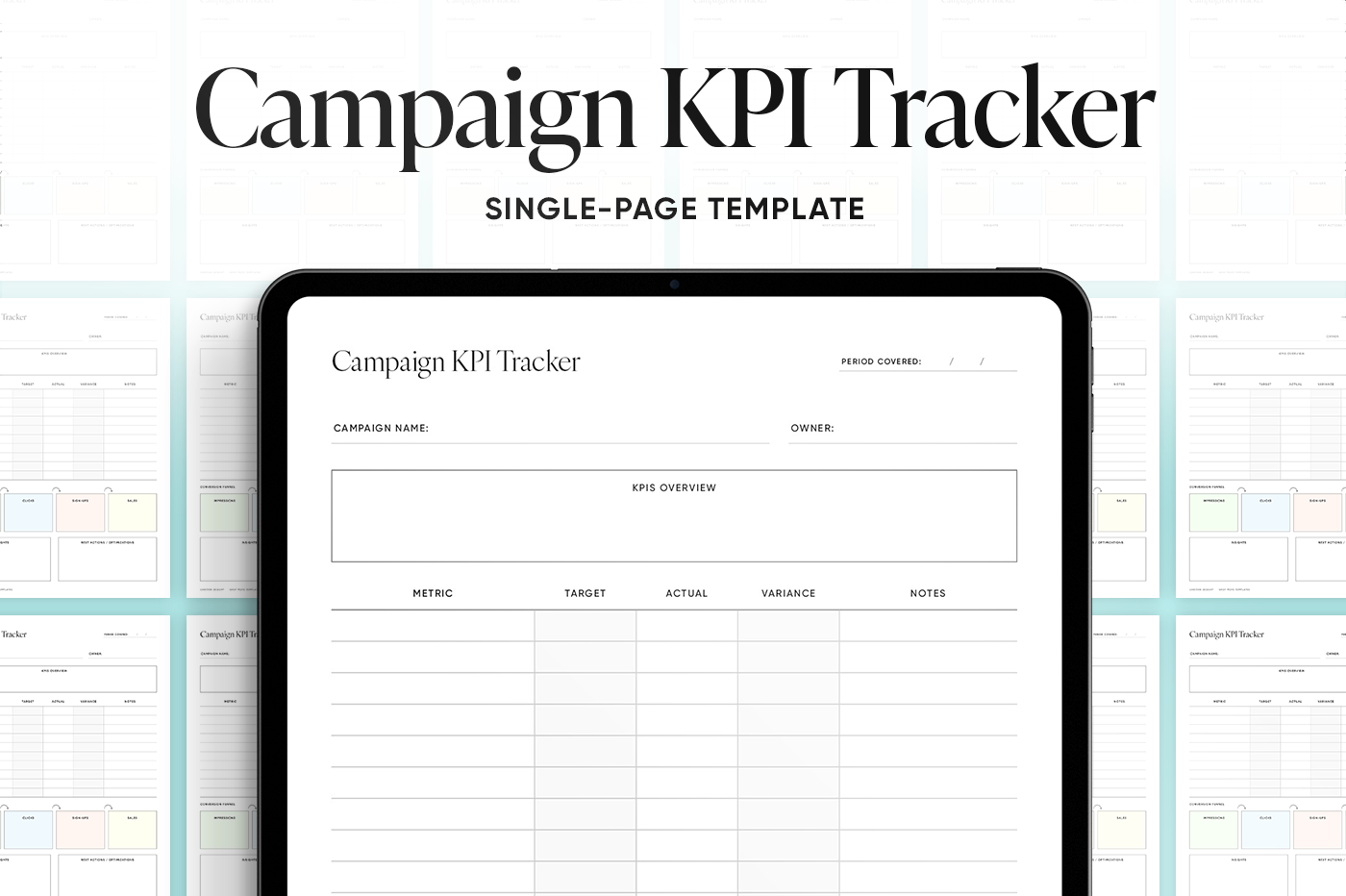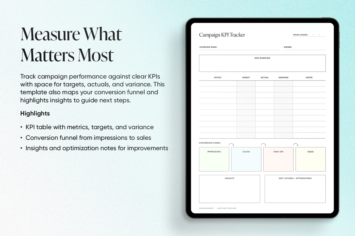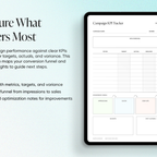 Track campaign performance against clear KPIs with space for targets,actuals,and variance. This template also maps your conversion funnel and highlights insights to guide next steps.