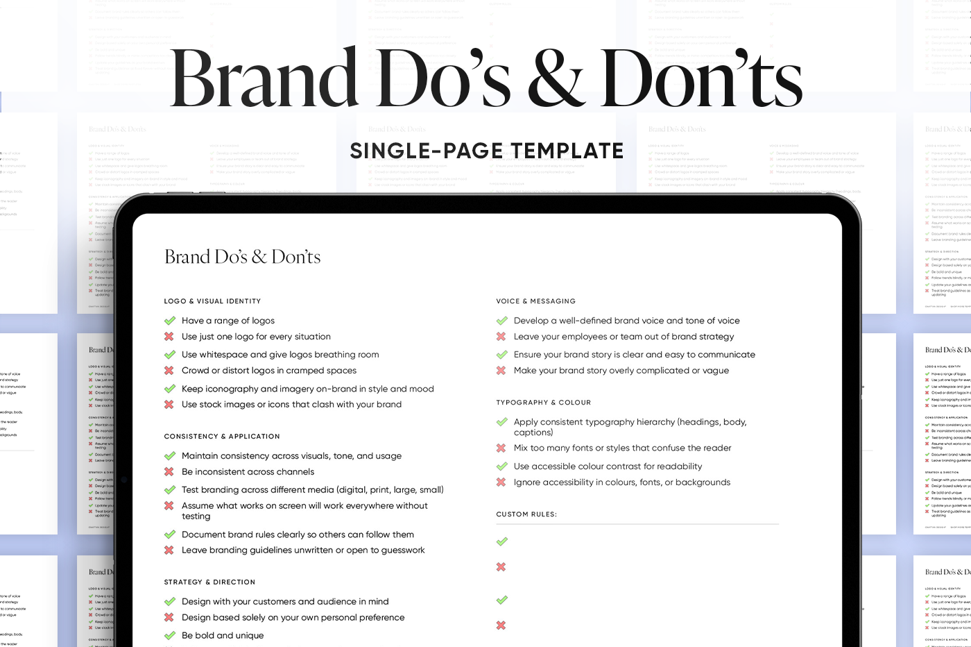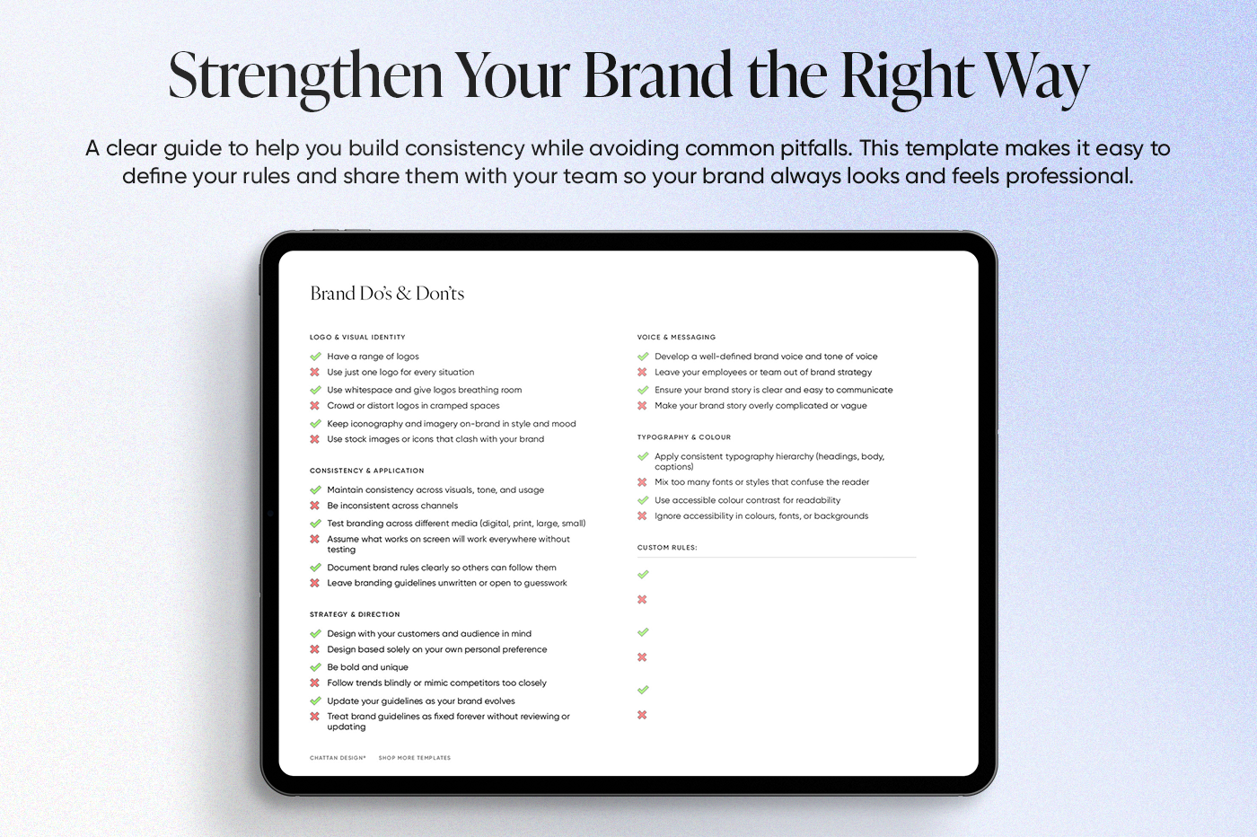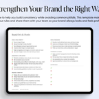 A clear guide to help you build consistency while avoiding common pitfalls. This template makes it easy to define your rules and share them with your team so your brand always looks and feels professional.