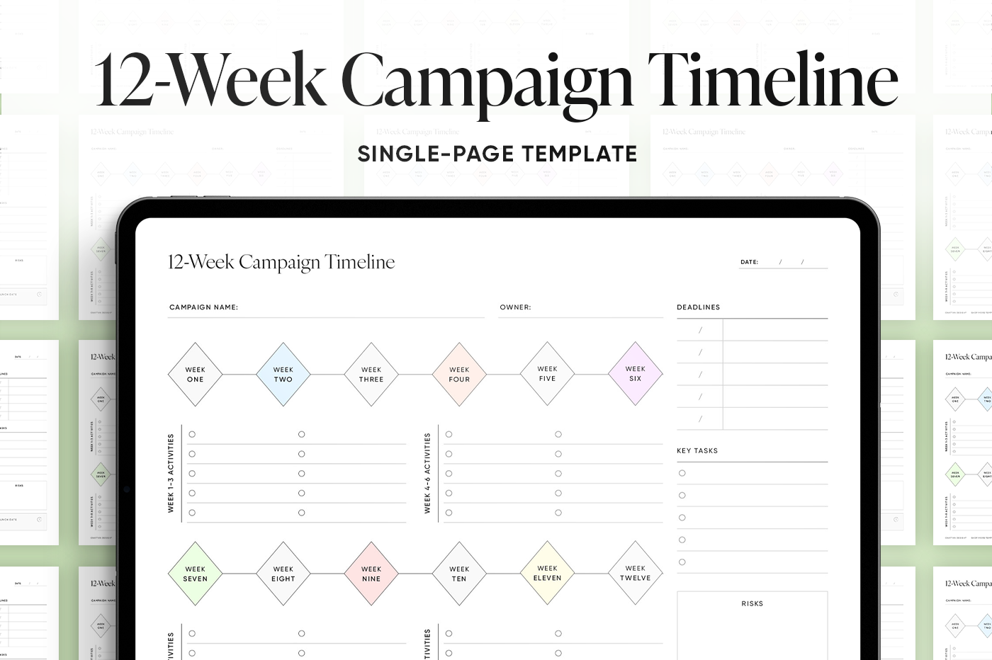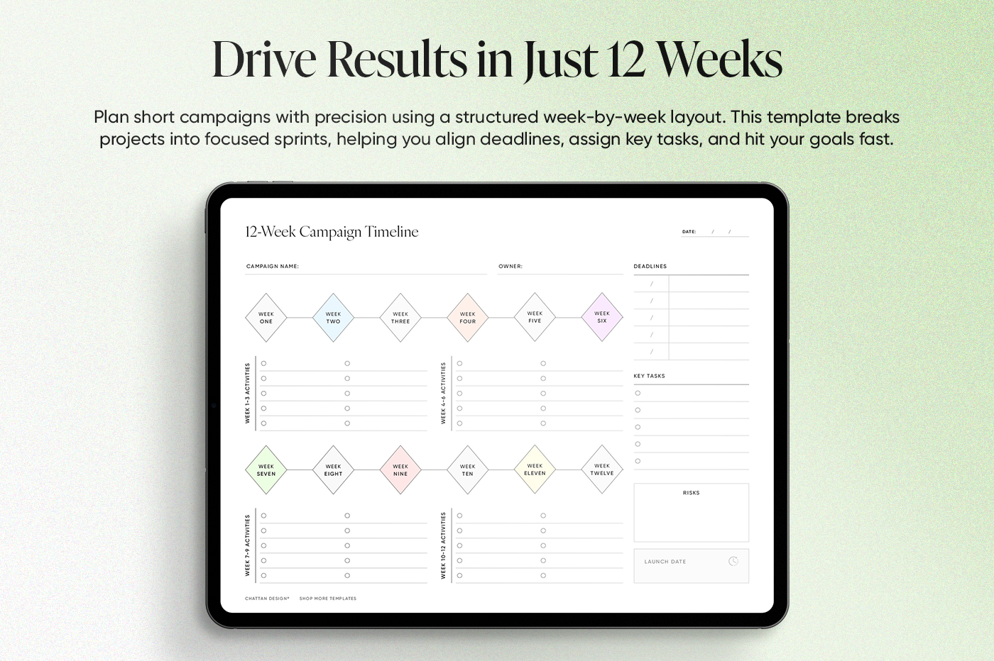 Plan short campaigns with precision using a structured week-by-week layout. This template breaks projects into focused sprints,helping you align deadlines,assign key tasks,and hit your goals fast.