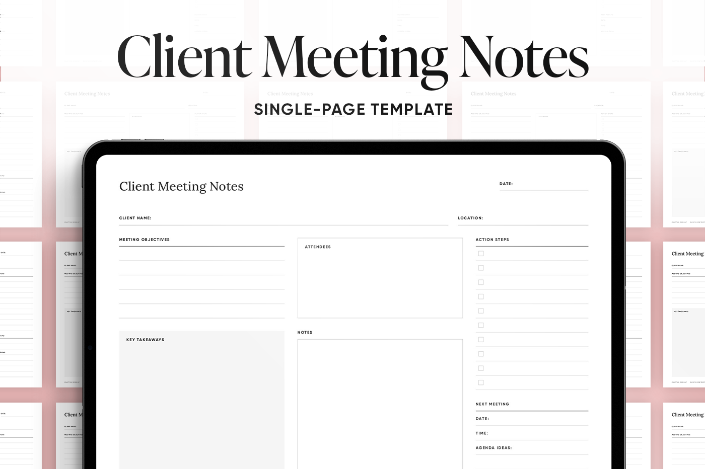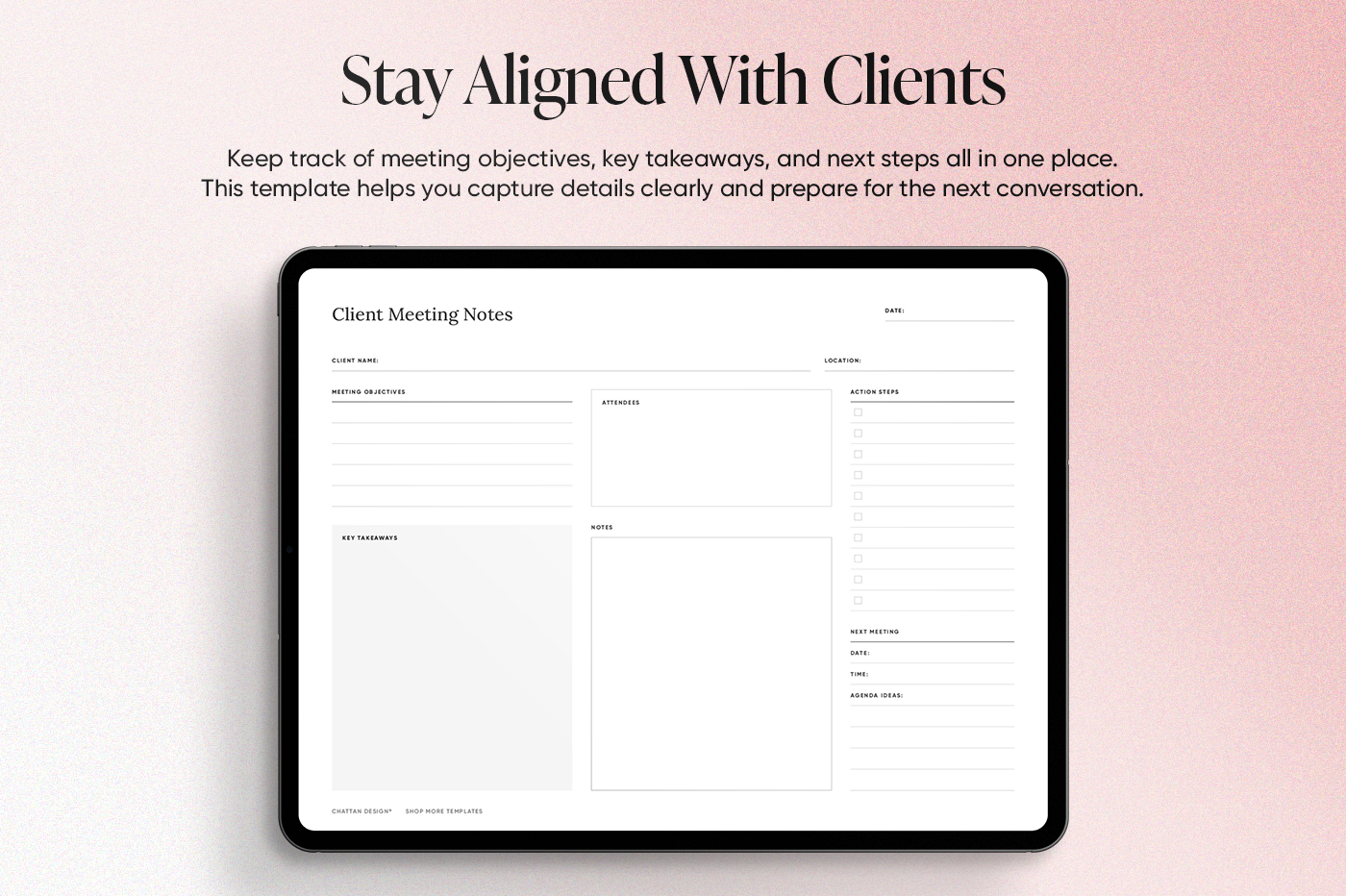 Keep track of meeting objectives,key takeaways,and next steps all in one place. This template helps you capture details clearly and prepare for the next conversation.