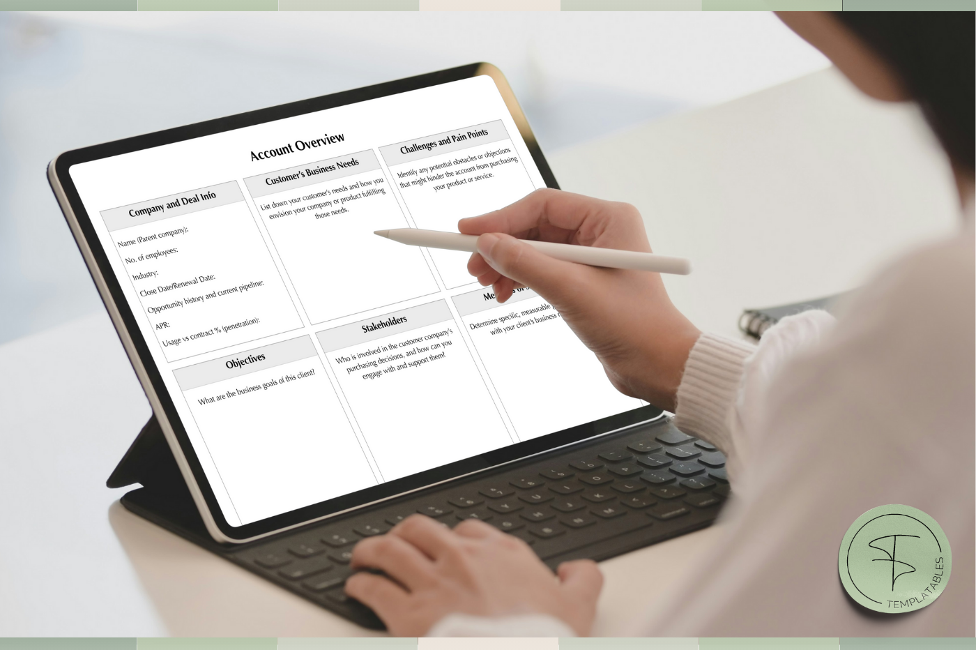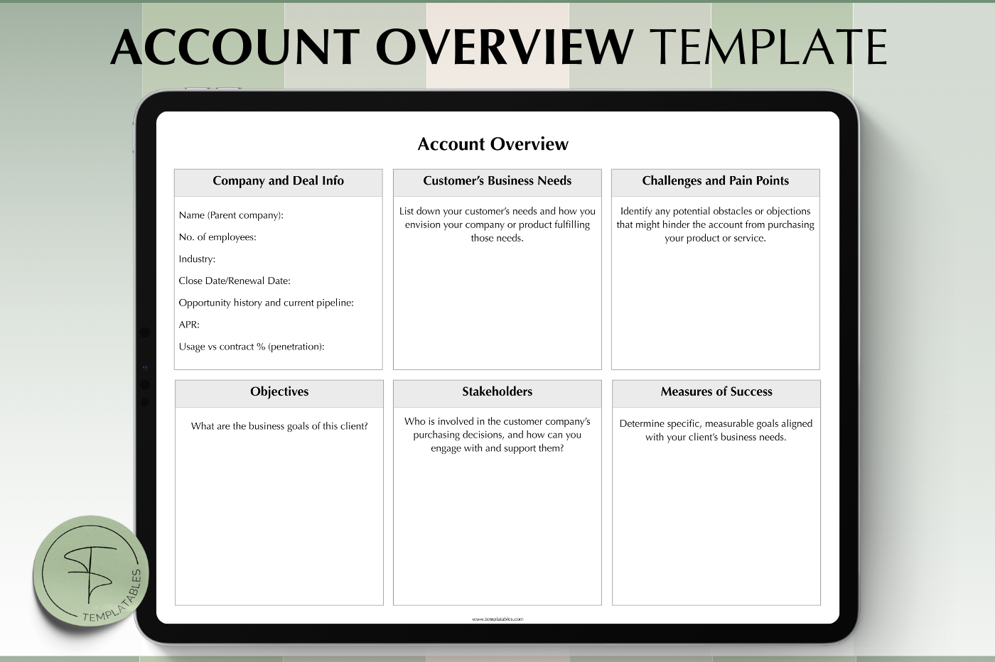 Capture key account details,goals and notes in one place. ✨Want more? We have a whole selection of templates and digital stationary for you! Check our shop on Marketplace for more @templatables 🫶 🙌