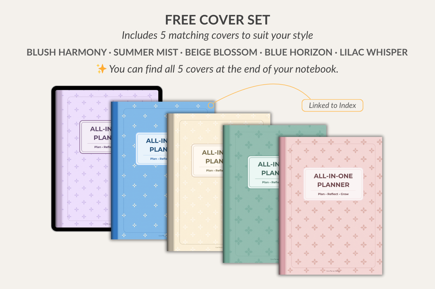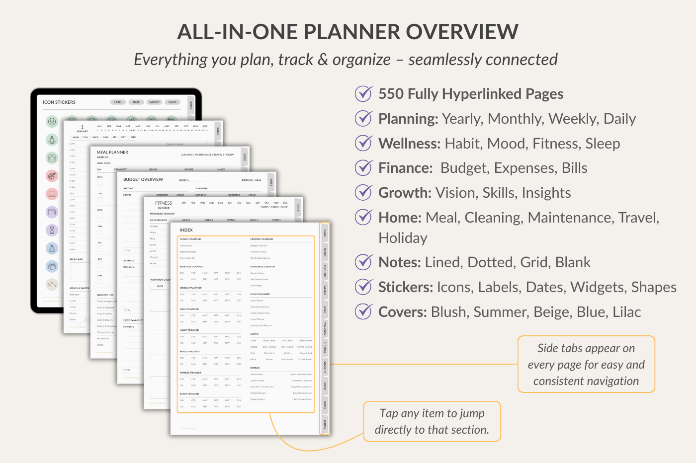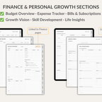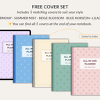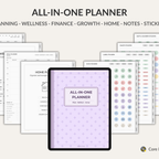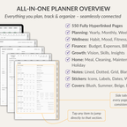 All-in-One Planner for GoodNotes – organize, plan, and manage every part of your life in one fully connected planner. With yearly, monthly, weekly and daily layouts, plus lifestyle pages for habits, fitness, mood, sleep, budget, expenses, bills, meal planning, cleaning, maintenance, travel and holiday organization. This 550-page hyperlinked planner also comes with 16 note templates, 300+ stickers, 5 pastel covers, and can be reused year after year for flexible, long-term planning.