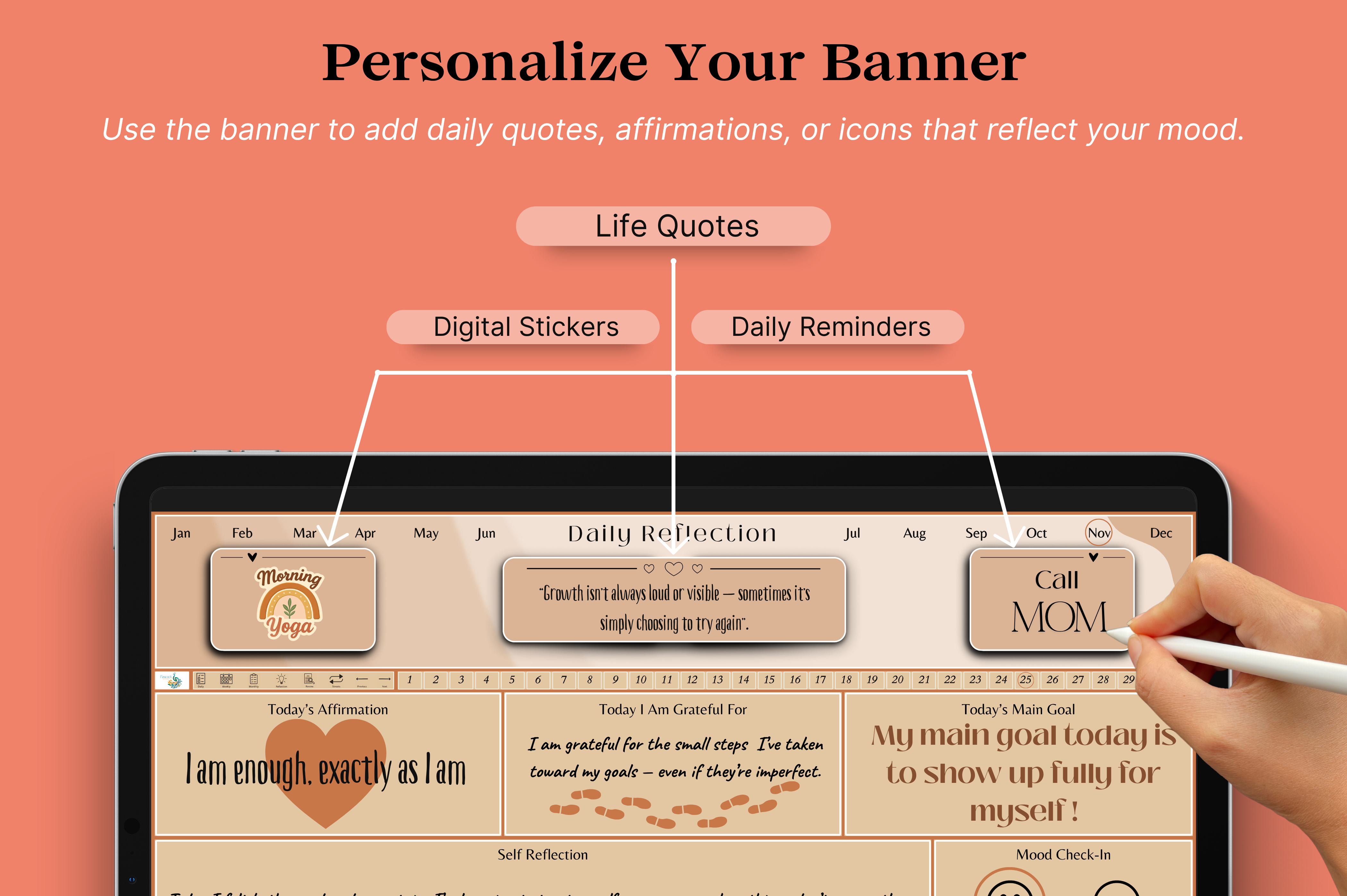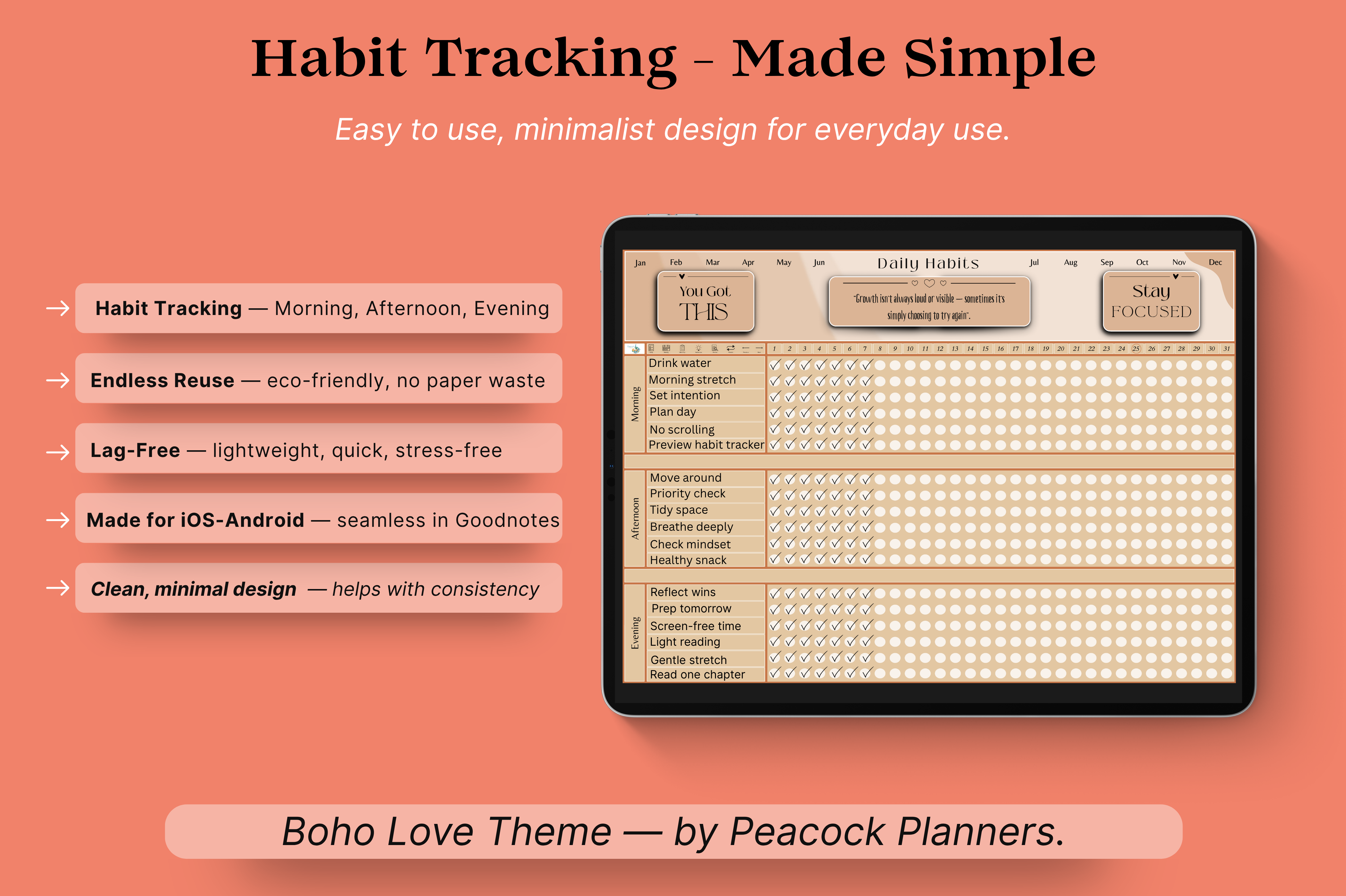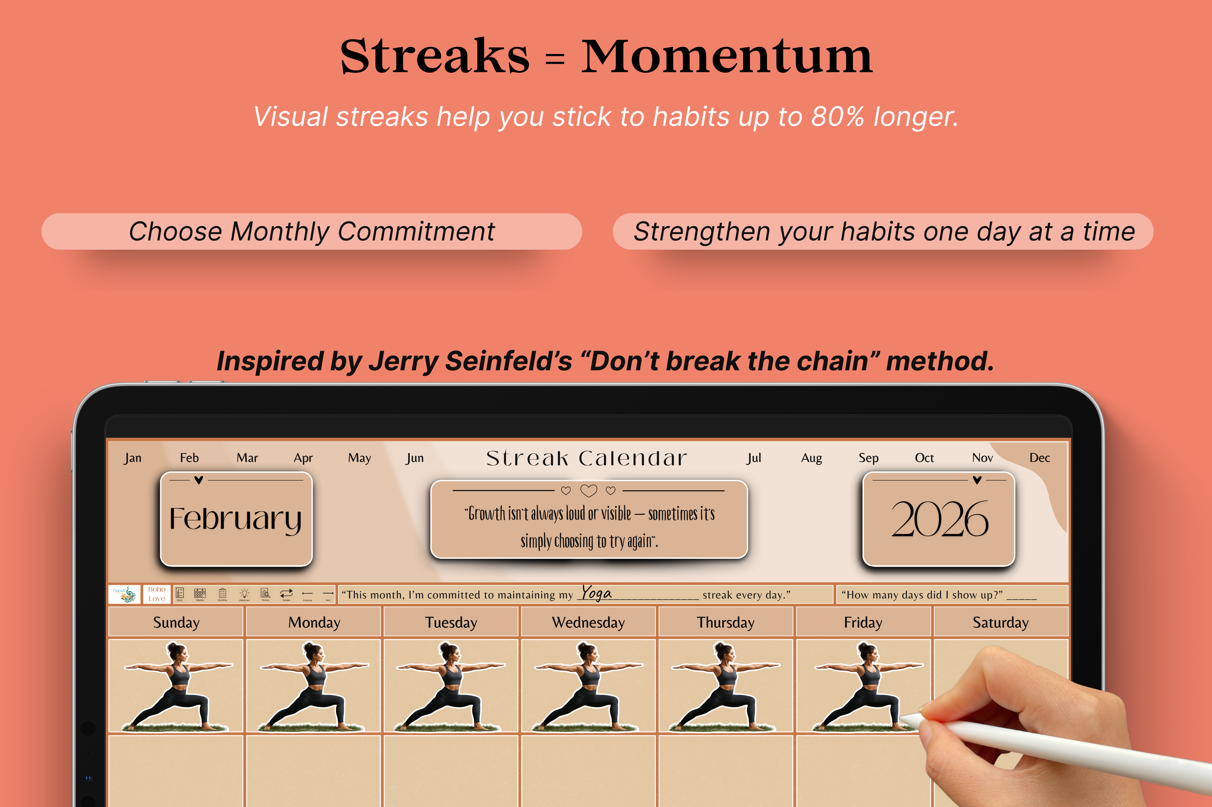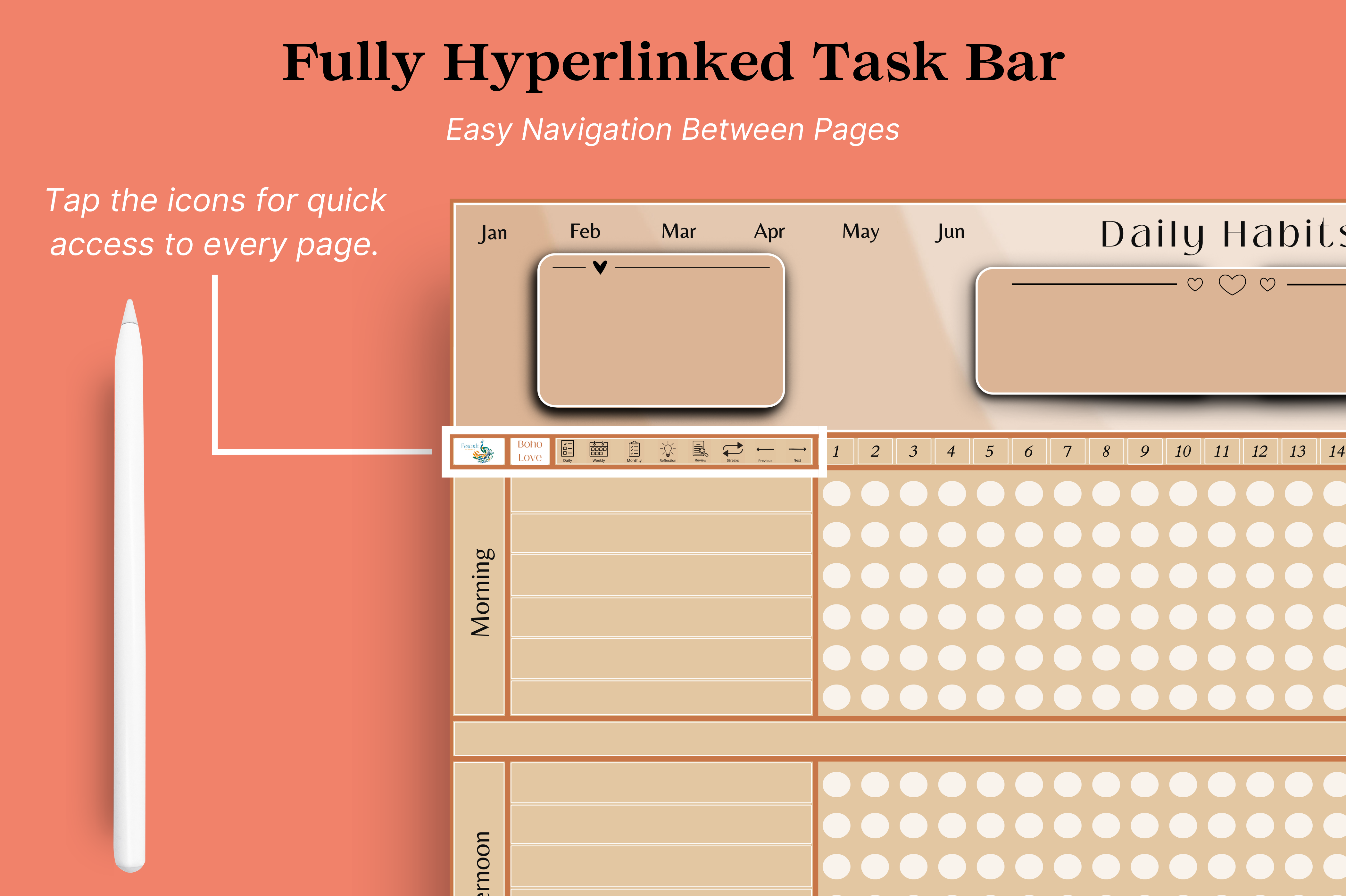 Build better habits with this 10-page fully hyperlinked tracker made for daily consistency and progress. Includes daily, weekly, and monthly layouts, a streak calendar, review page, and a reflection sheet you can duplicate anytime. Simple to use and designed to help you stay on track, one small step at a time.