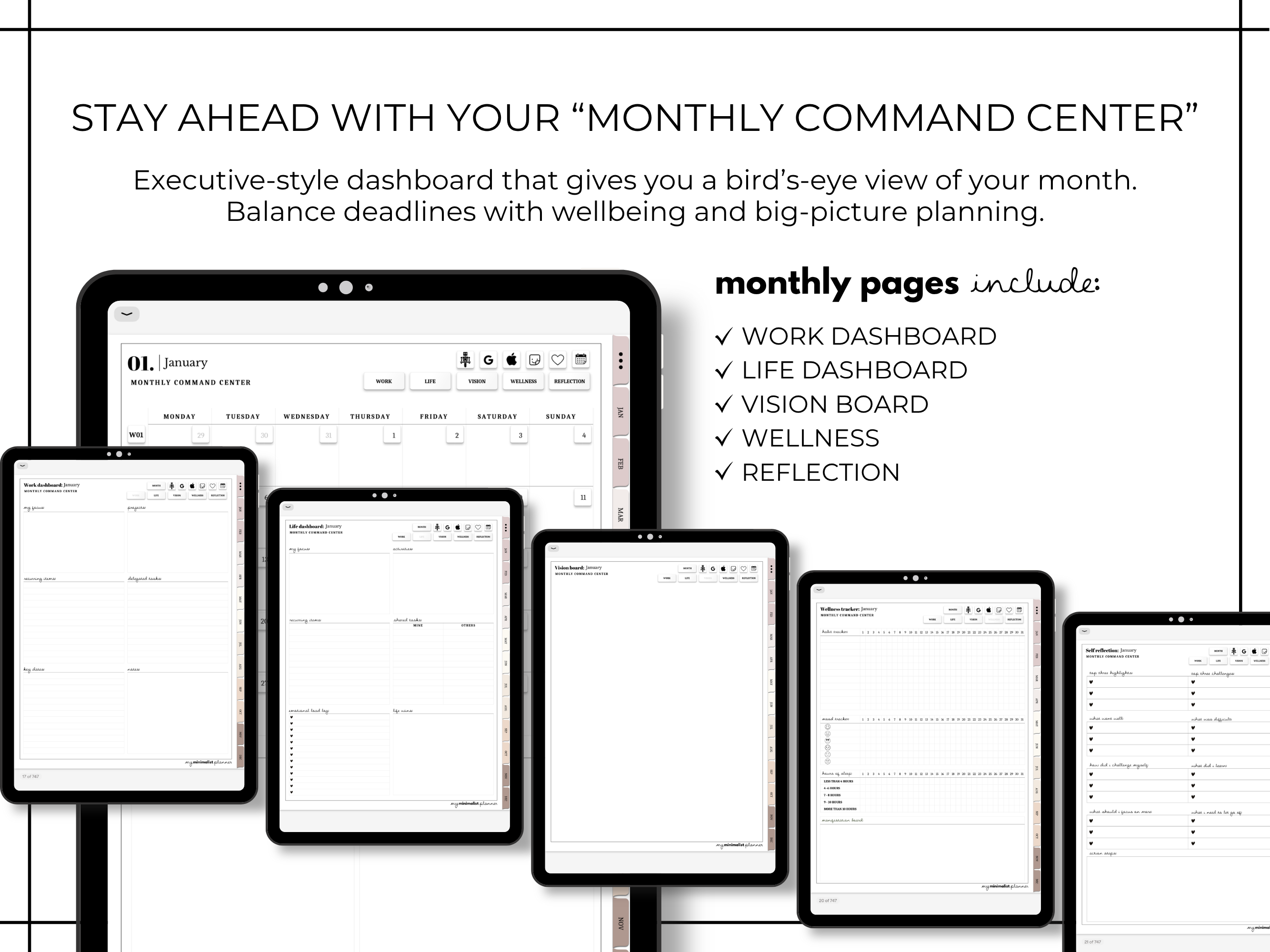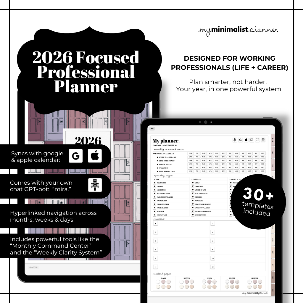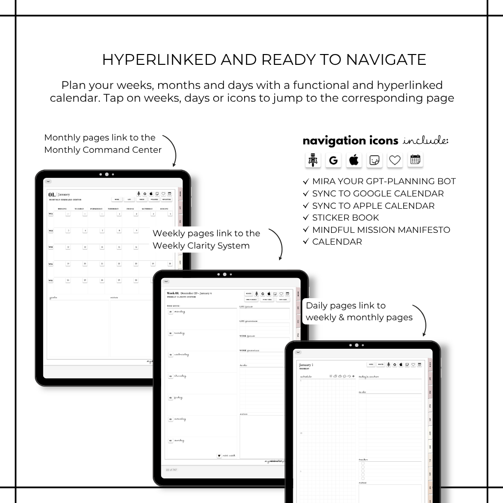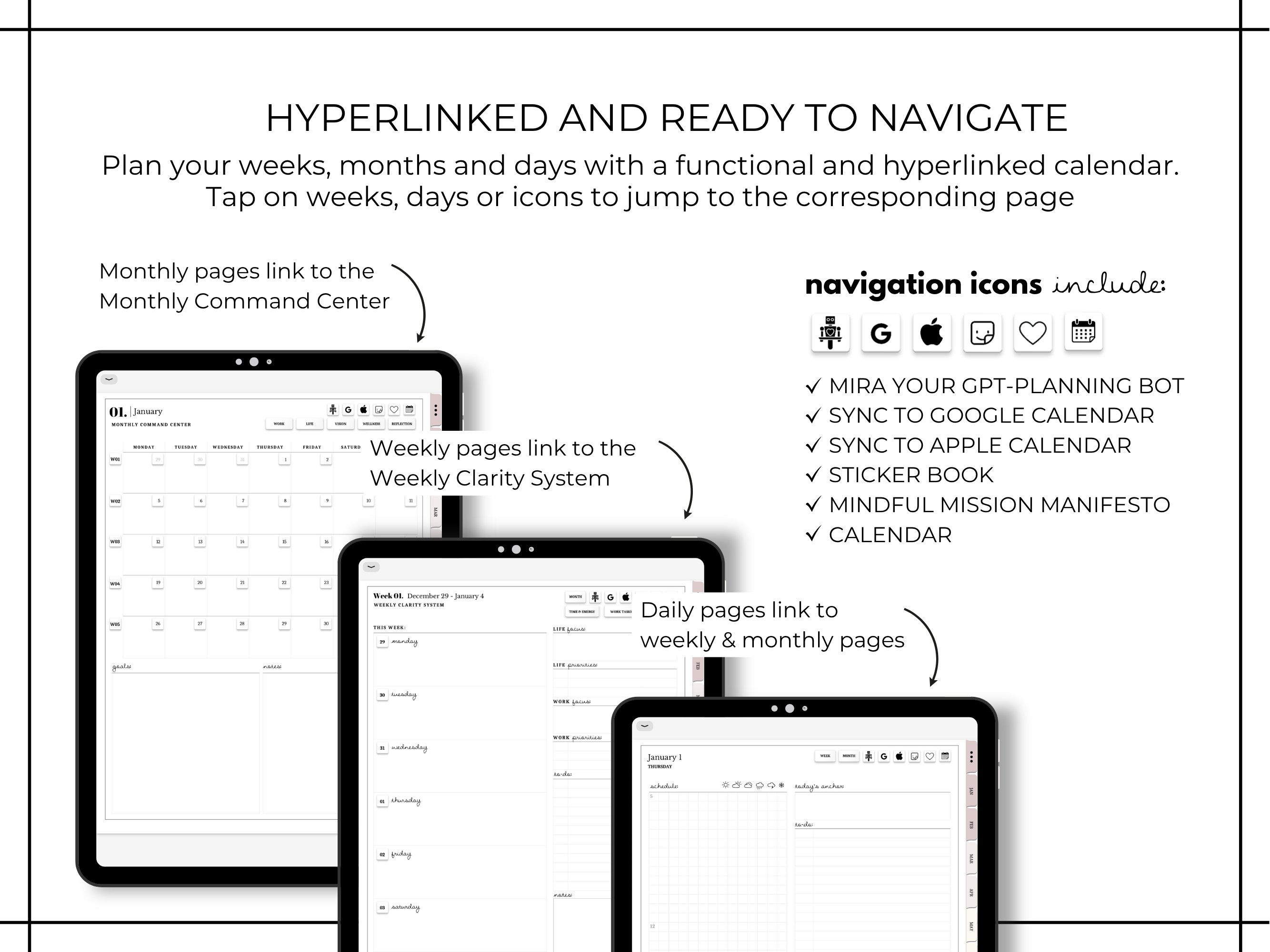 This 2026 digital planner is your streamlined HQ for managing ambitious goals and everyday tasks. Designed for focused professionals, it features a powerful Monthly Command Center and Weekly Clarity System to help you lead with intention. Navigate effortlessly in Goodnotes with hyperlinked yearly, monthly, weekly, and daily views. Includes 30 specialty templates for work, wellness, and life—including Project Planner, Networking Tracker, Meeting Notes, Working Out Logs & more. Sync with Apple & Google Calendar. Clean minimalist aesthetic matches our best-selling sticker packs (sold separately) to elevate your planning flow.