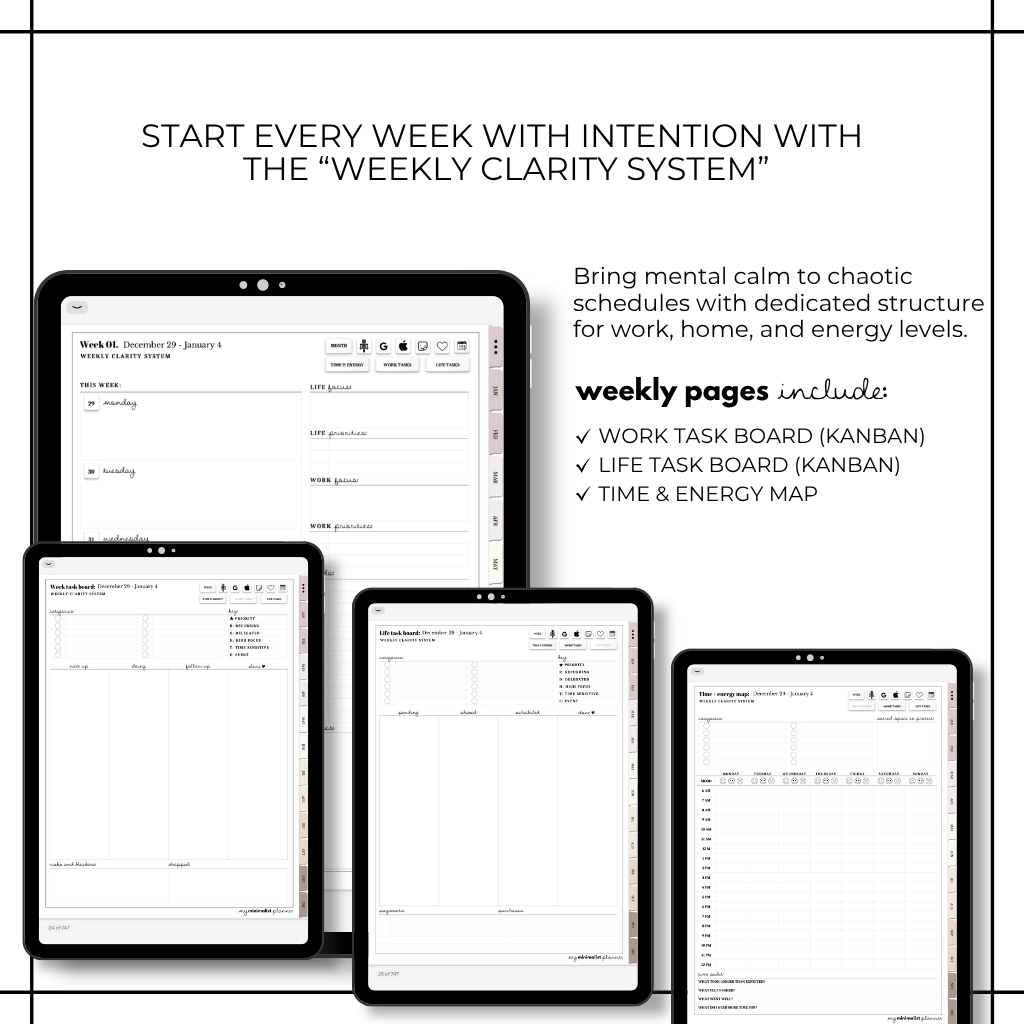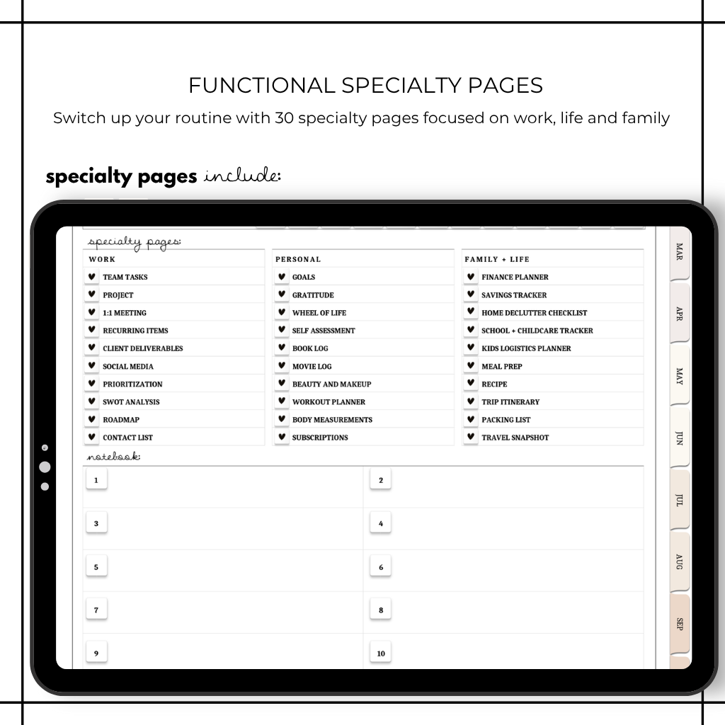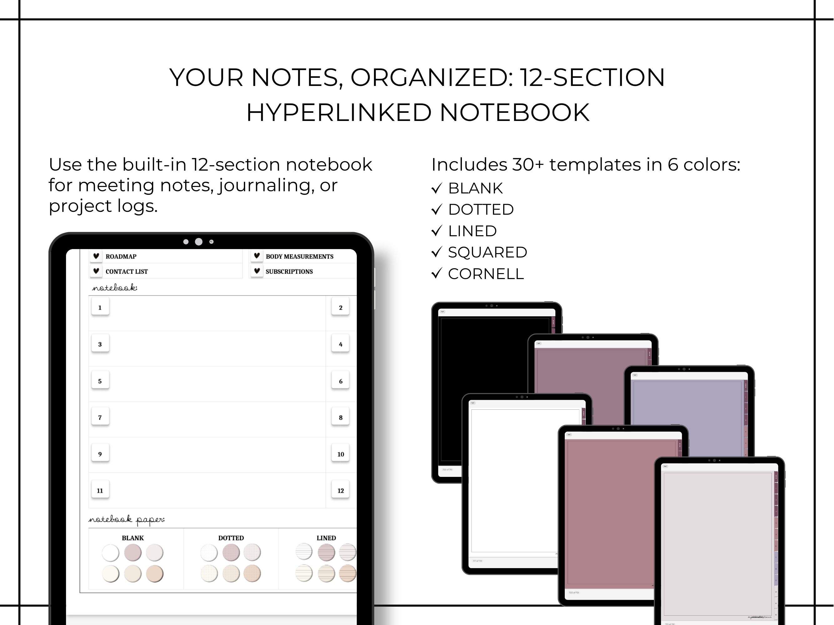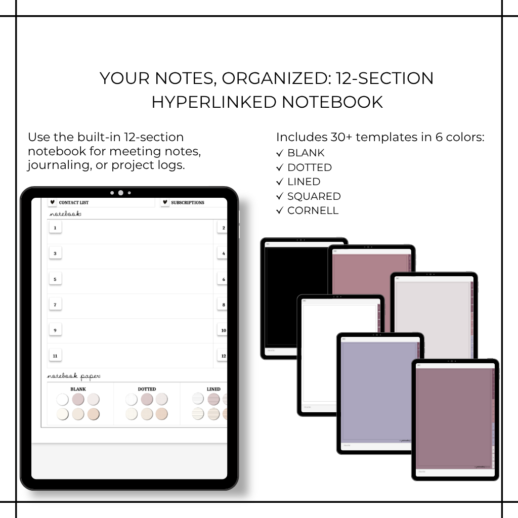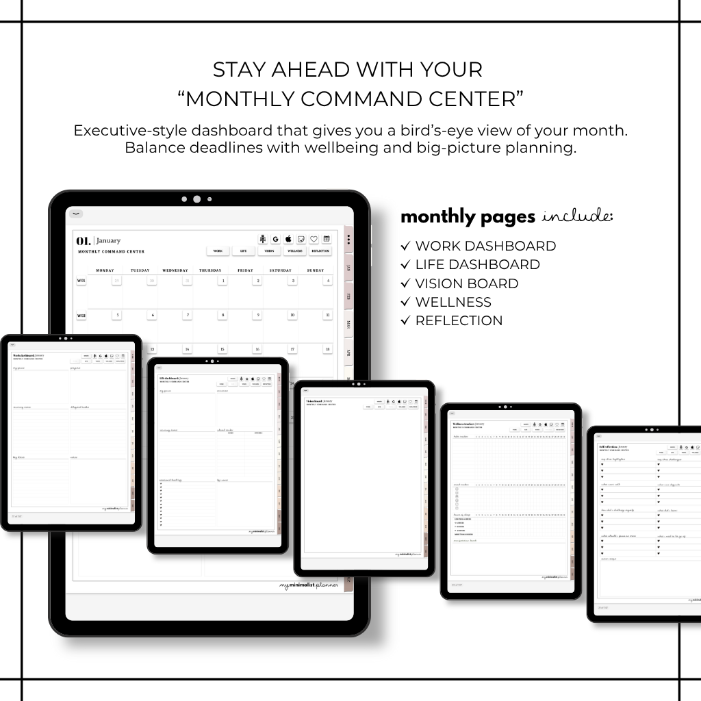 This 2026 digital planner is your streamlined HQ for managing ambitious goals and everyday tasks. Designed for focused professionals, it features a powerful Monthly Command Center and Weekly Clarity System to help you lead with intention. Navigate effortlessly in Goodnotes with hyperlinked yearly, monthly, weekly, and daily views. Includes 30 specialty templates for work, wellness, and life—including Project Planner, Networking Tracker, Meeting Notes, Working Out Logs & more. Sync with Apple & Google Calendar. Clean minimalist aesthetic matches our best-selling sticker packs (sold separately) to elevate your planning flow.
