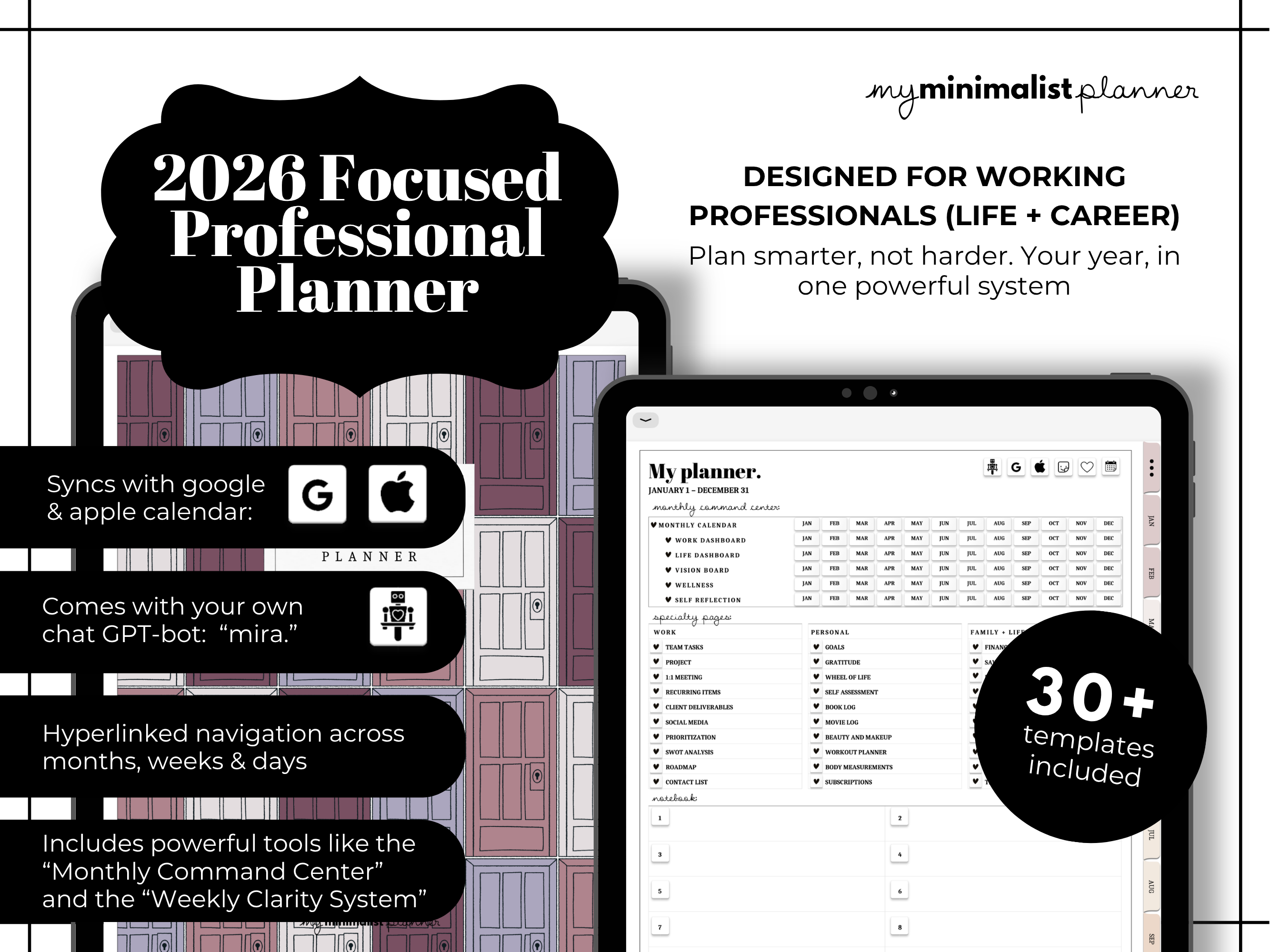 Welcome to My Minimalist Planner, your go-to digital planning solution, to help simplify your life and stay organized. Our sleek and user-friendly design allows you to seamlessly plan your days, weeks, and months ahead. With planners, journals, notebooks and stickers that are filled with helpful features and sync and GPT automations, our products are perfect for individuals looking to streamline their work or study schedules and boost their productivity.