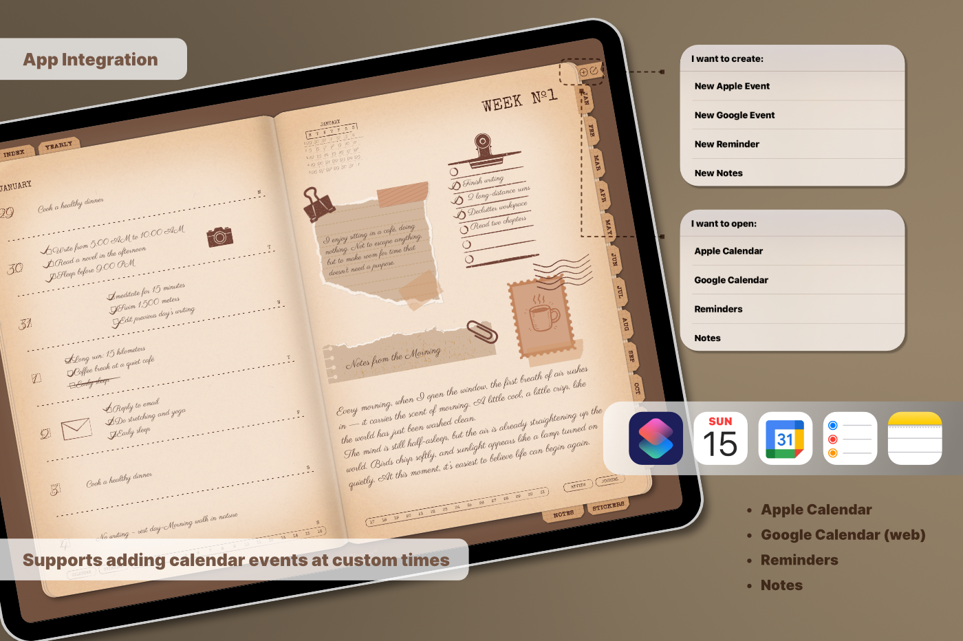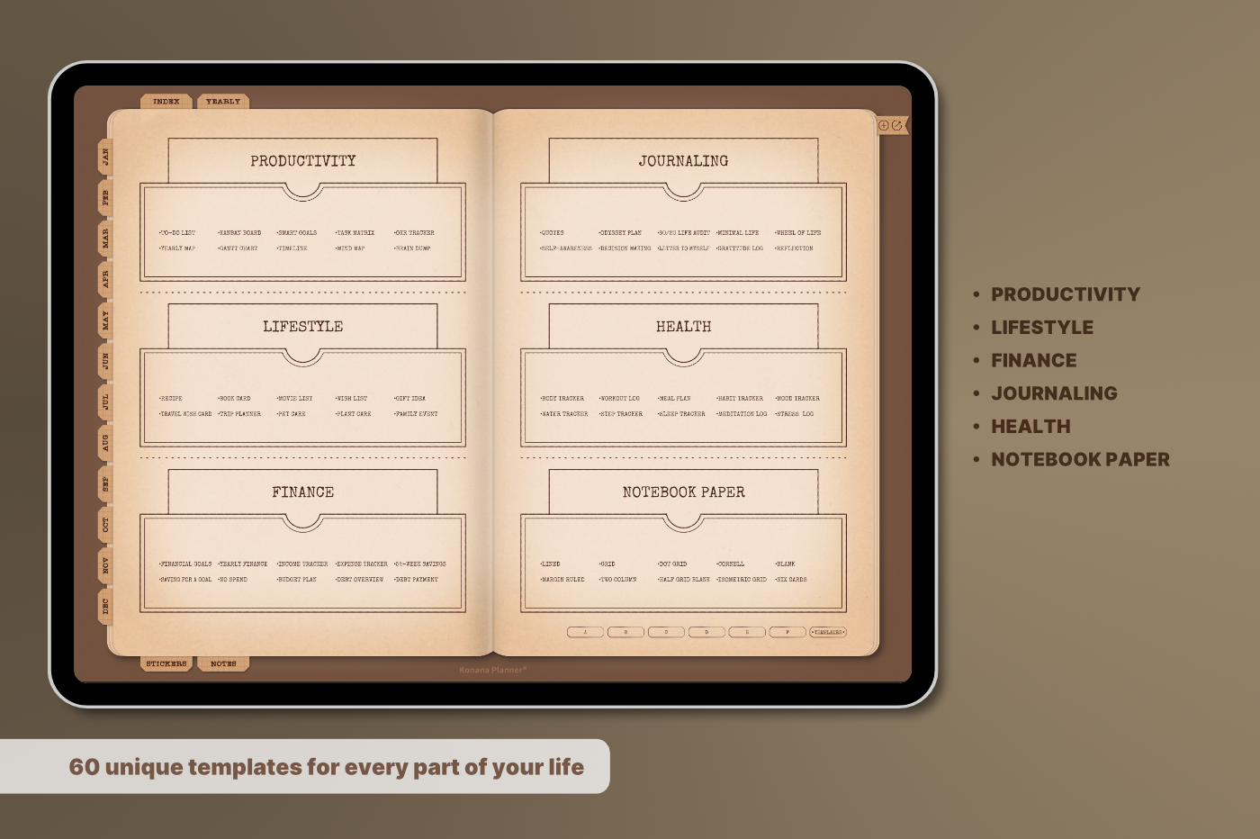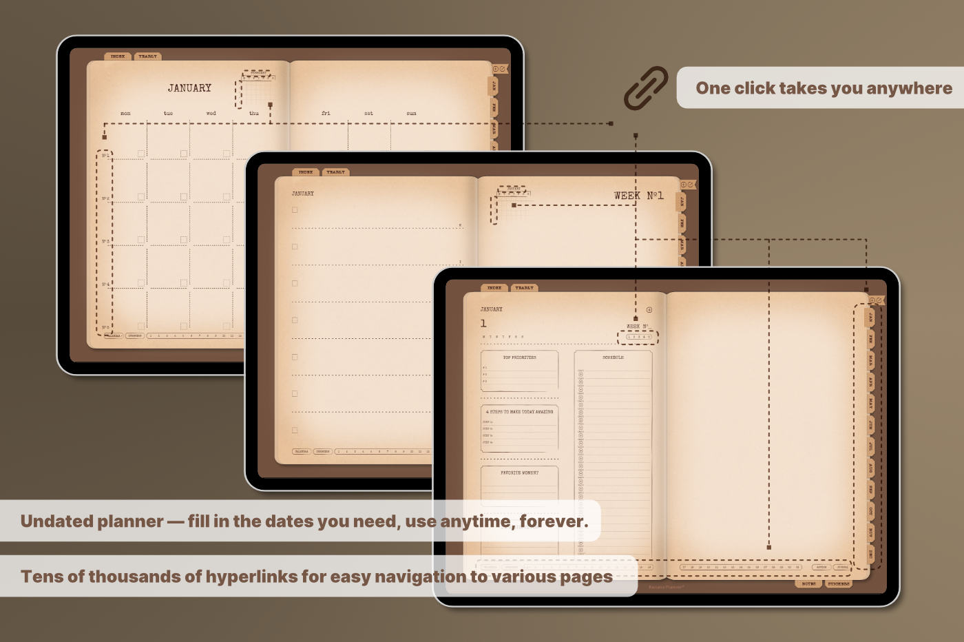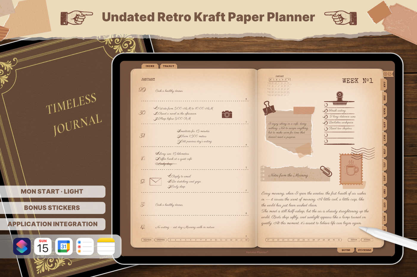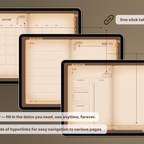 A must-have for anyone who enjoys the feel of real paper with seamless digital functionality. [Undated & Forever-Use]: Plan without limits—reuse year after year. [Hyperlinks]: Easily navigate to any page (For all devices). [App Integration]: Includes Apple & Google Calendar, Reminders, and Notes (For Apple devices). [Templates]: 60 versatile pages covering productivity, lifestyle, finance, journaling, health, and note-taking.