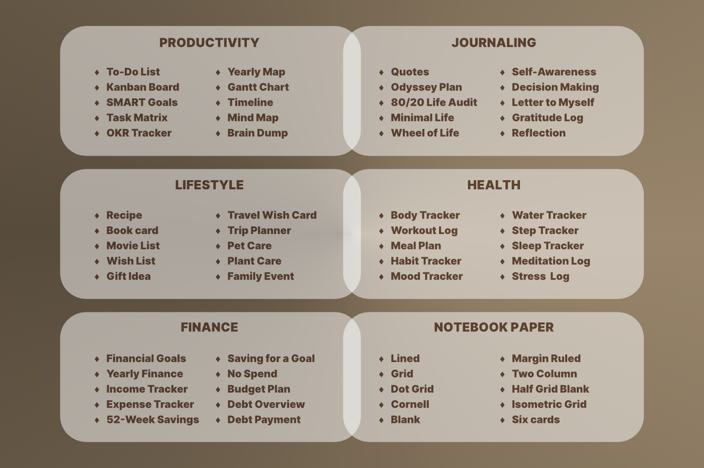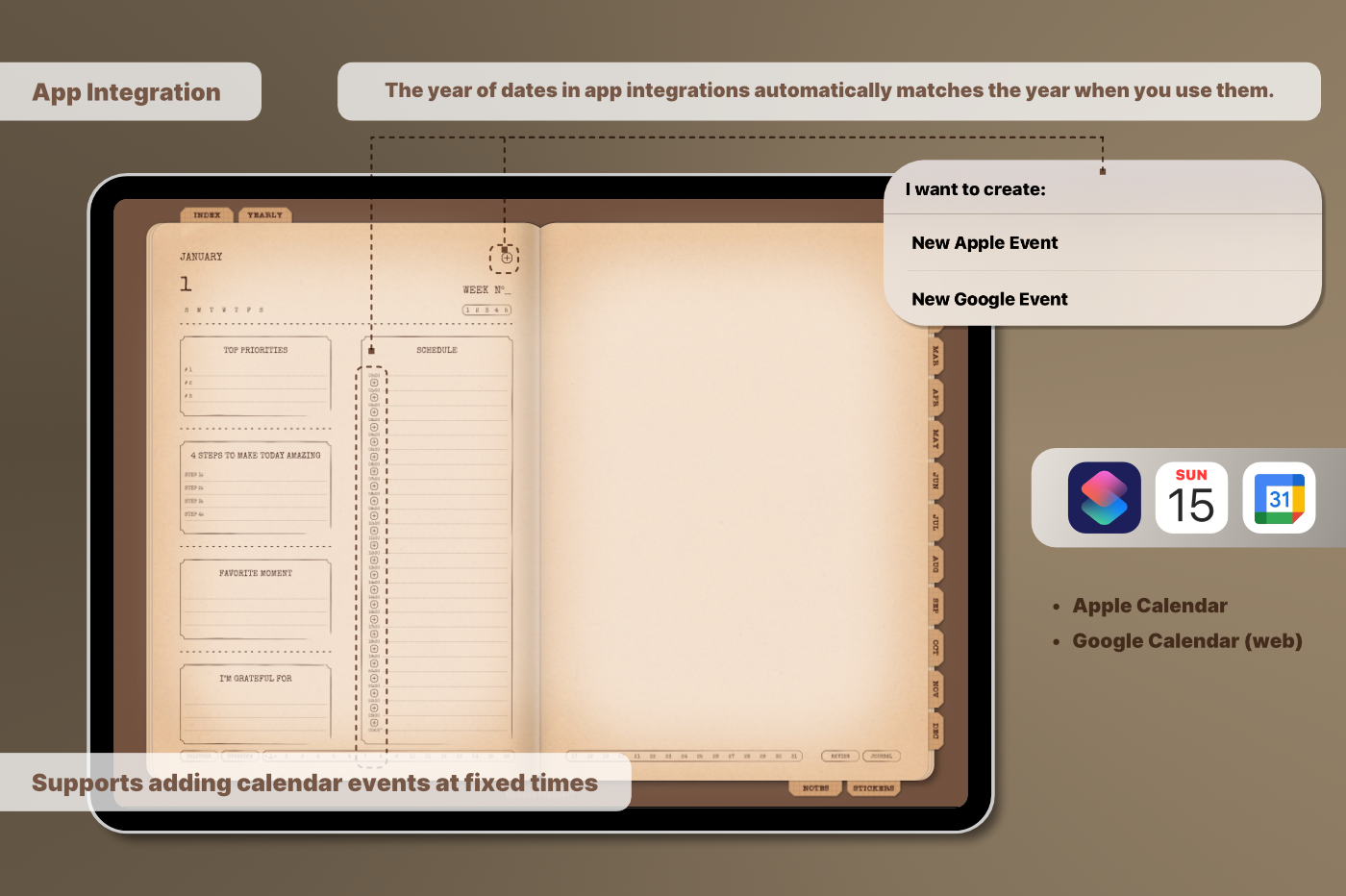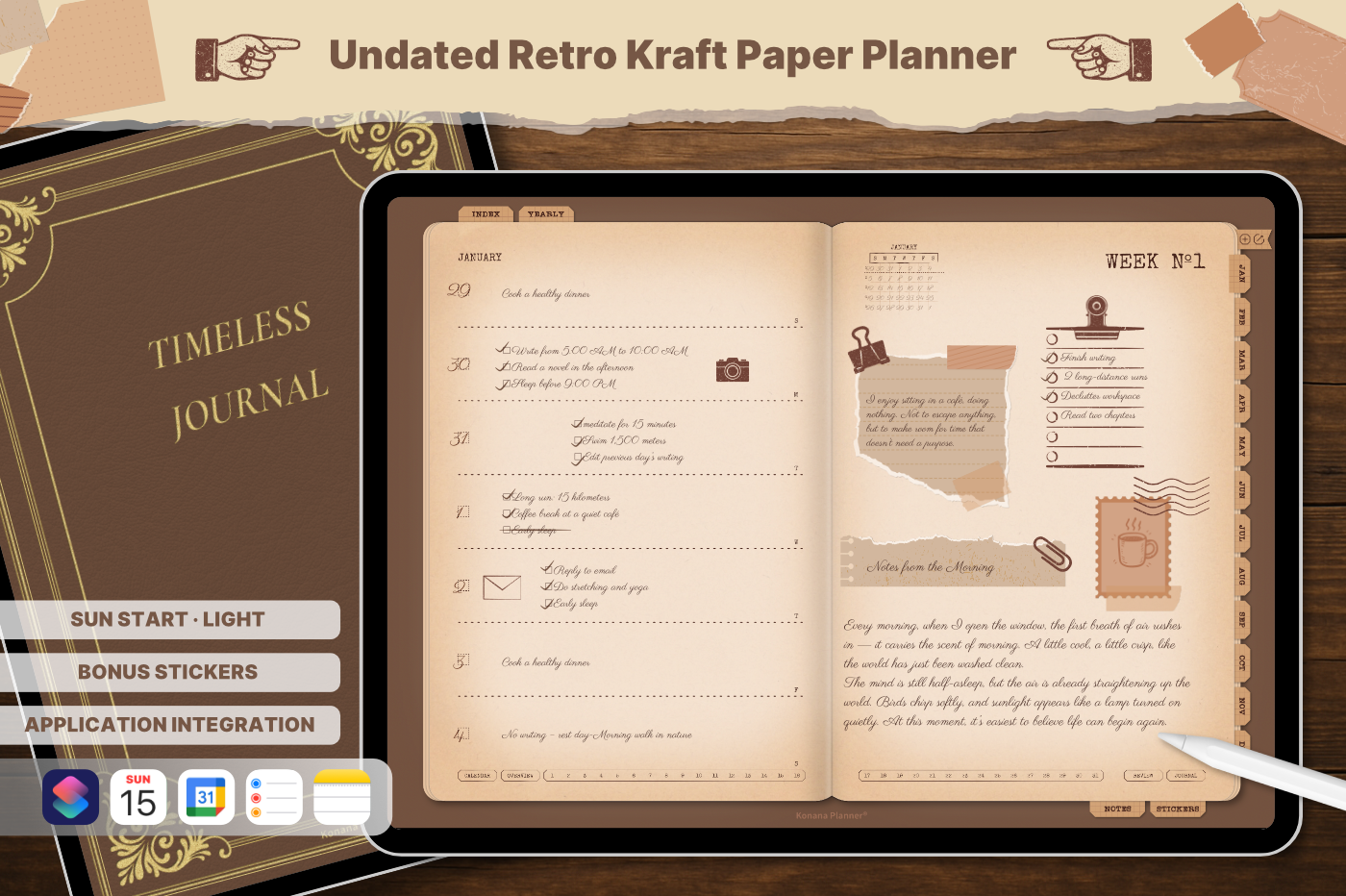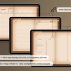 A must-have for anyone who enjoys the feel of real paper with seamless digital functionality. [Undated & Forever-Use]: Plan without limits—reuse year after year. [Hyperlinks]: Easily navigate to any page (For all devices). [App Integration]: Includes Apple & Google Calendar, Reminders, and Notes (For Apple devices). [Templates]: 60 versatile pages covering productivity, lifestyle, finance, journaling, health, and note-taking.