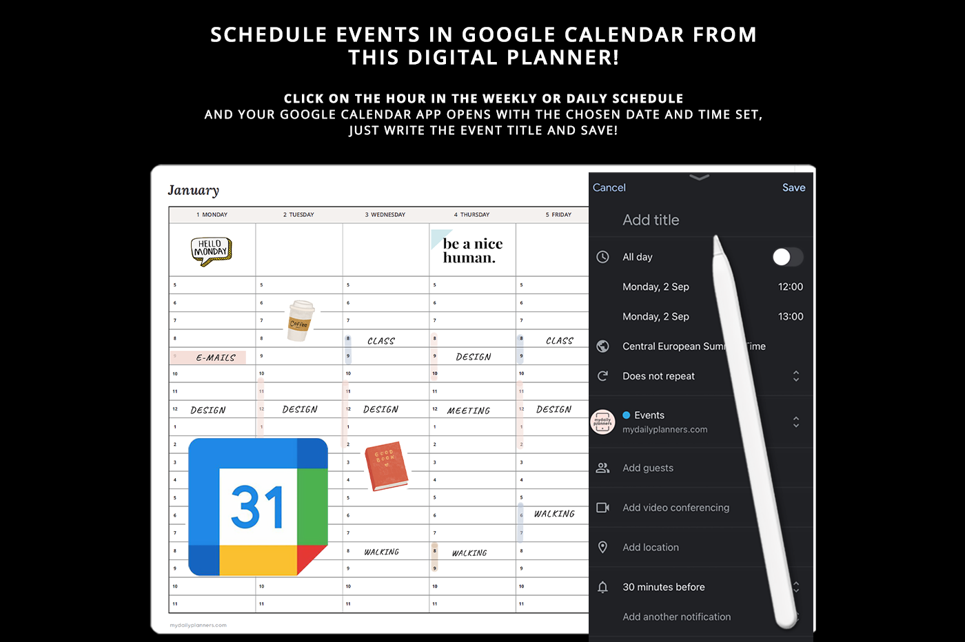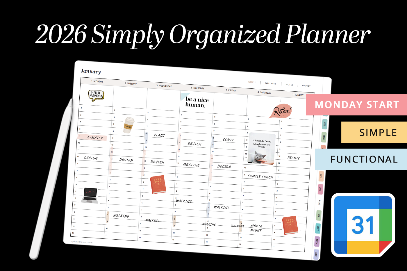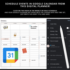 This digital planner includes hyperlinked monthly, weekly and daily planner, monthly budget, weekly wellness and weekly notes. Every day, week and month in the planner is clickable for easy navigation. Calendar widgets on weekly notes and daily pages are also hyperlinked so you can browse through this digital planner with ease. Includes links to Google Calendar for easy events scheduling.
