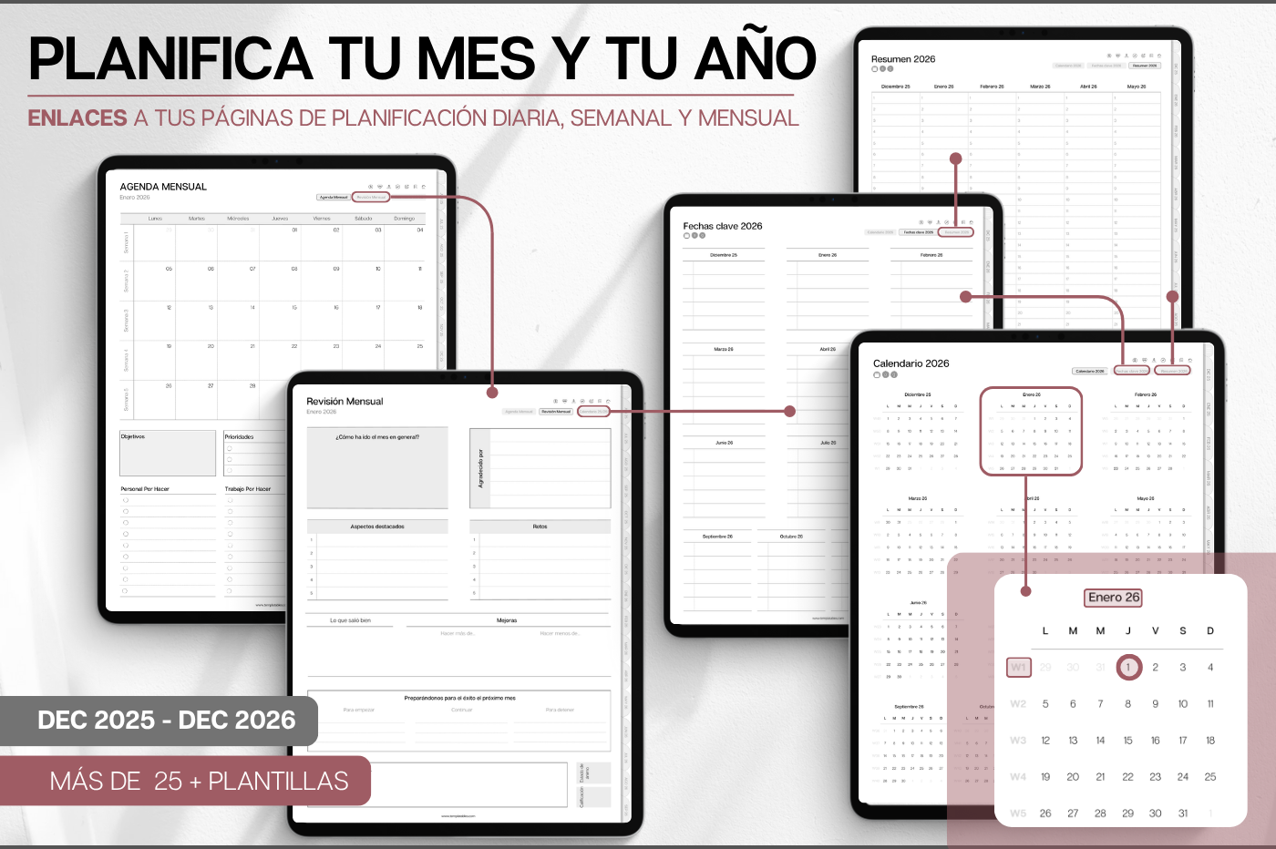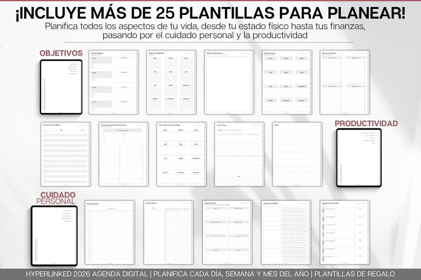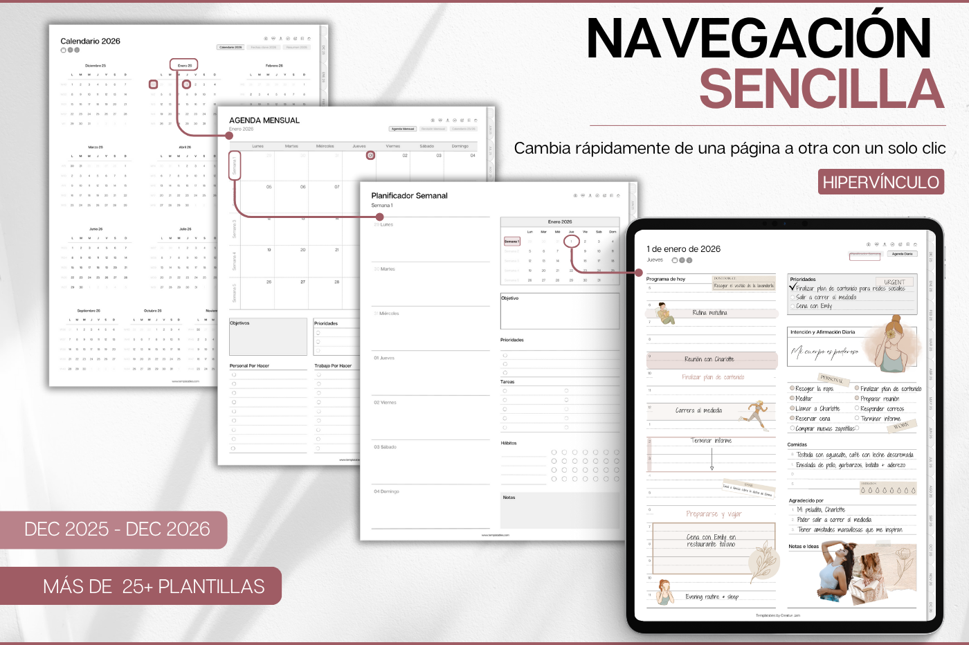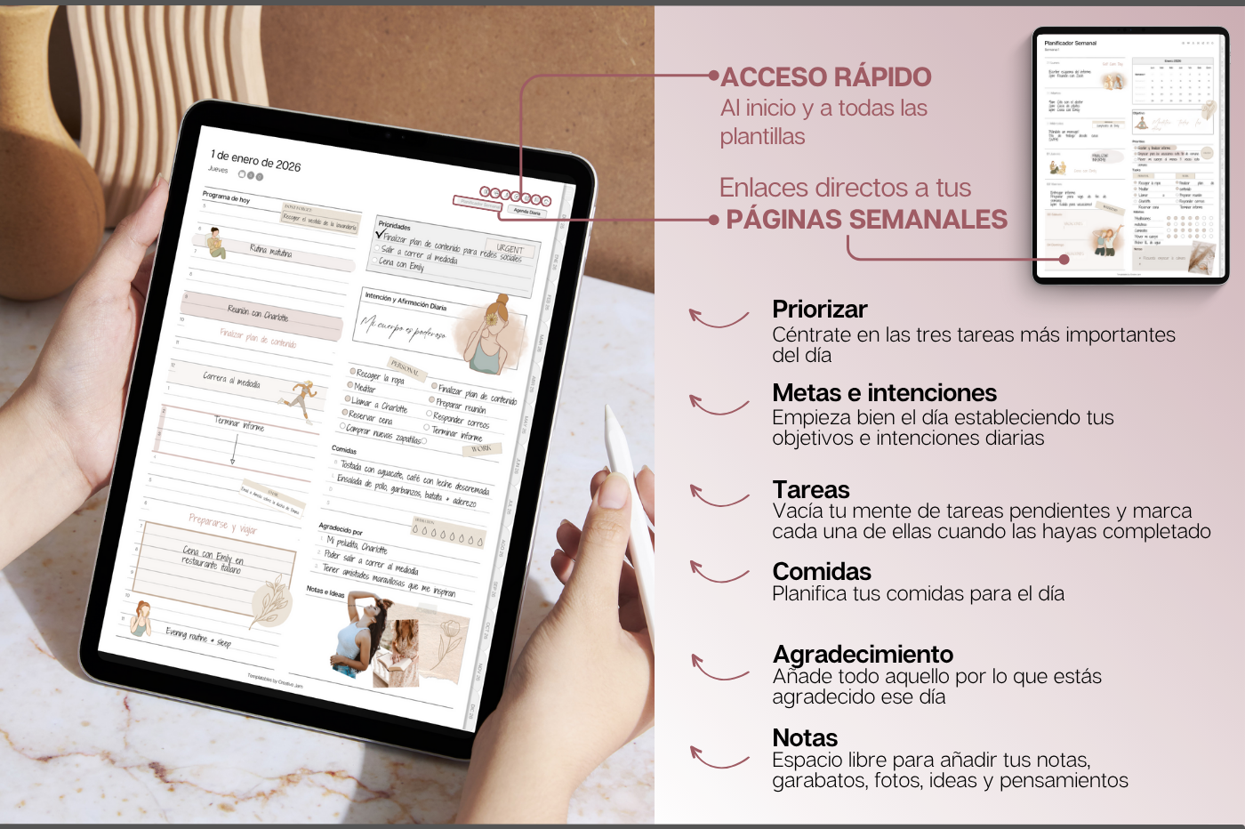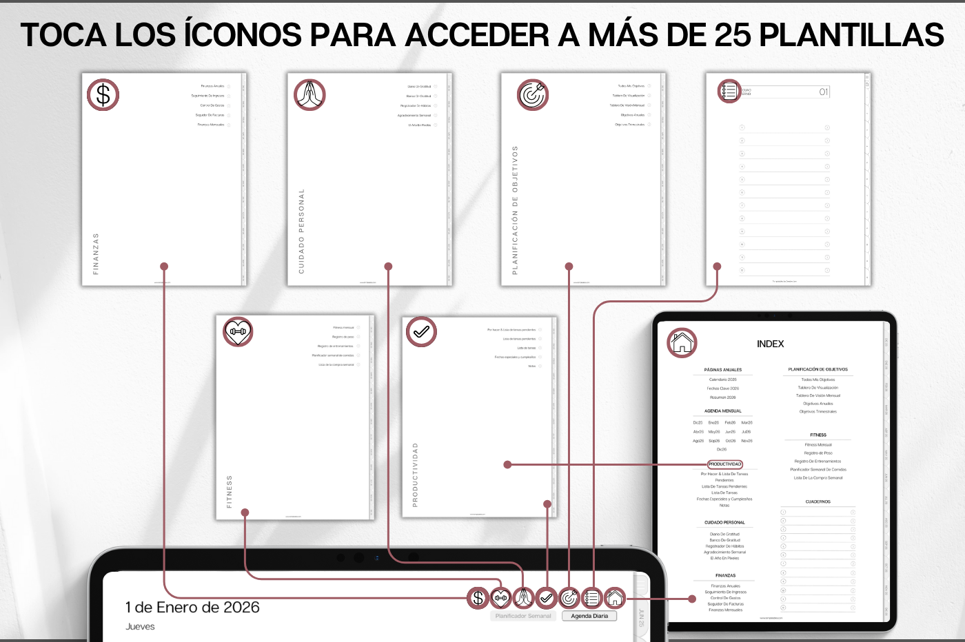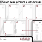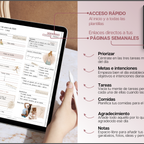 Plan, schedule and organize each day of the week and month with intention, using this daily planner in Spanish 🇪🇸 • Daily, weekly & monthly planners to help prioritize & organize • Time blocking for productivity • 100+ lifestyle planning templates, 12 notebooks and 40 page templates • 300+ bonus digital covers 🔗 Integration with Apple & Google Calendars, Chat GPT, MS Outllok, Apple Notes, Files, Mail & Reminders