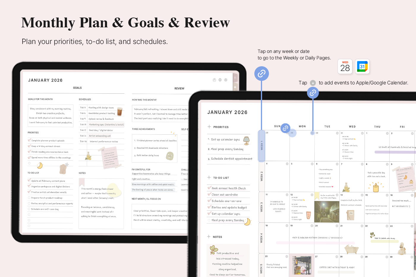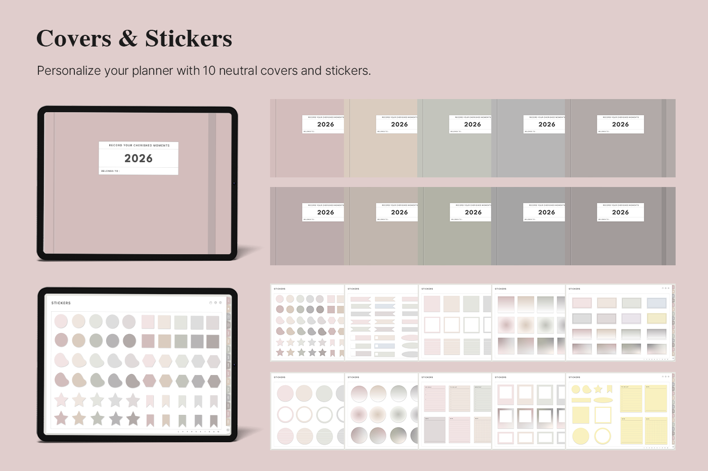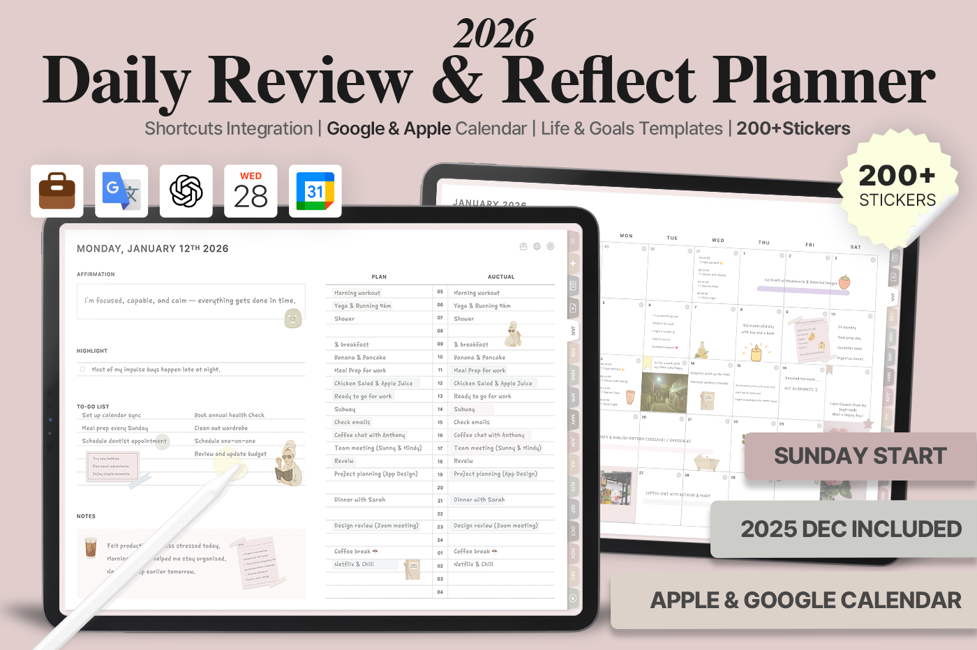 [Page Composition] - User Guide - Apple & Google Calendar Integration - Shortcuts Integration (Utility, Google Translate, ChatGPT) - Dec '25 Included - Covers (10) - Yearly / Monthly / Weekly / Daily Plans - Monthly Goals & Riview - Life : Journal, Reading Journal, Travel Plan, Monthly Budget, Meal / Workout Plan, Etc. - Note Binders (10) - Notes (10 types) - 200+ Stickers