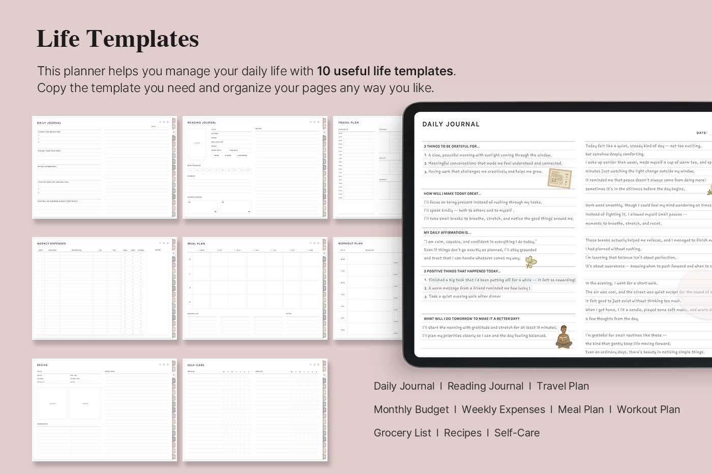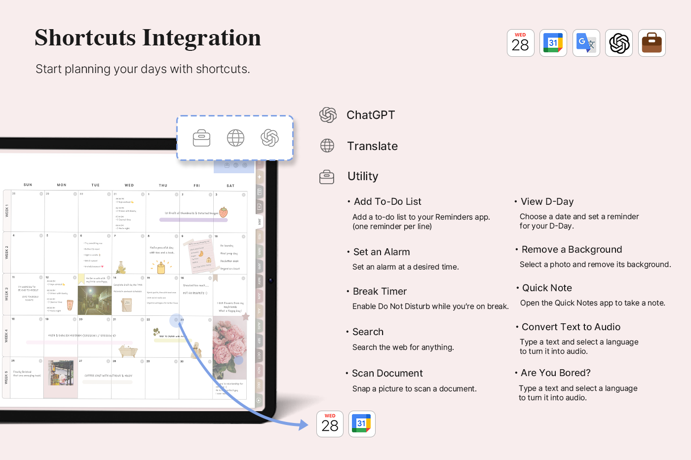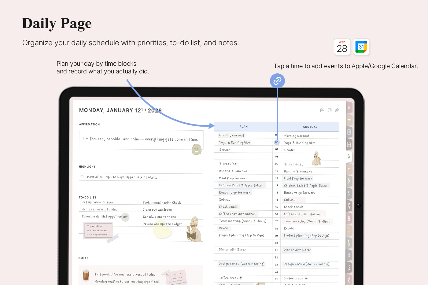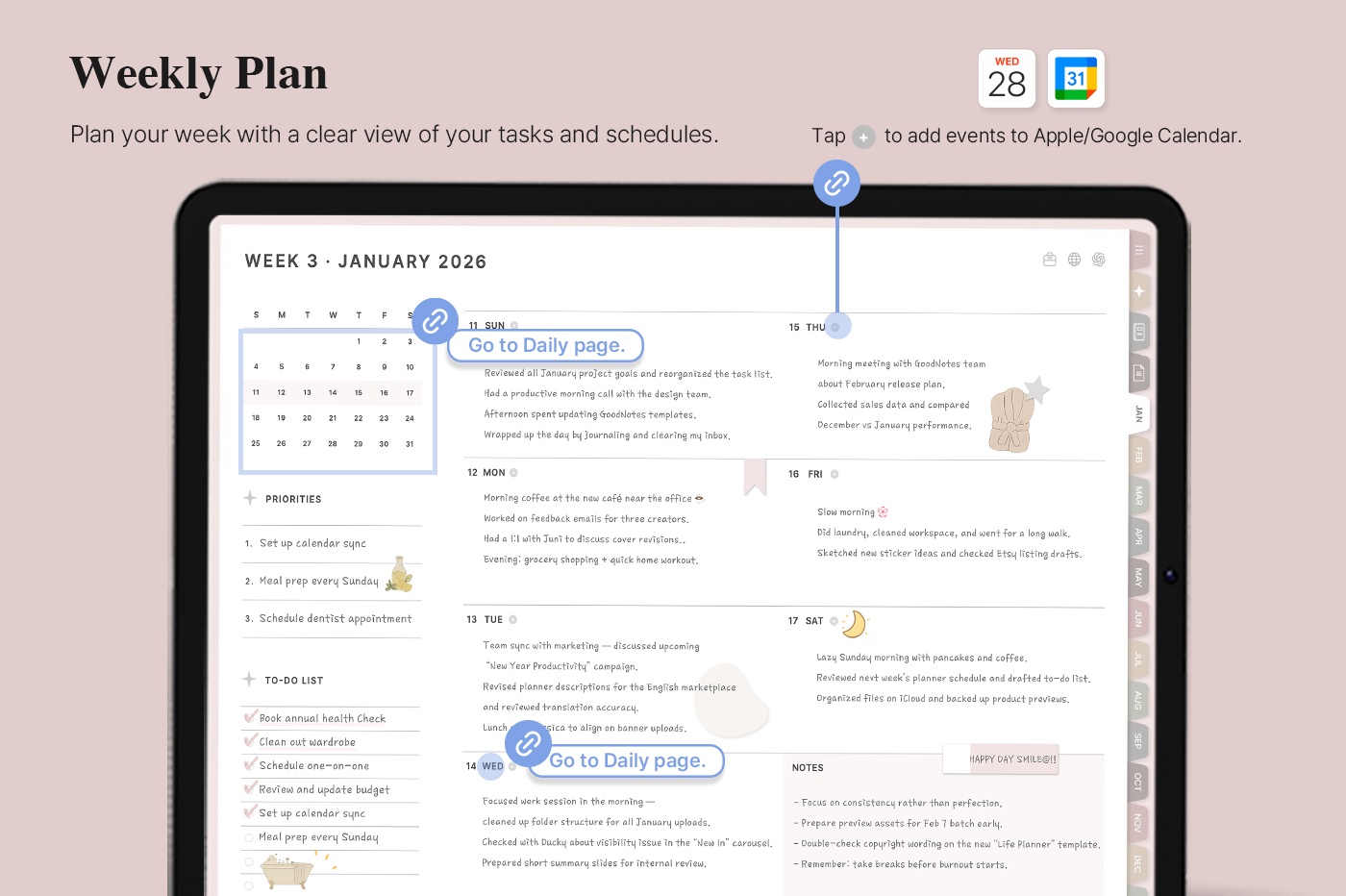 [Page Composition] - User Guide - Apple & Google Calendar Integration - Shortcuts Integration (Utility, Google Translate, ChatGPT) - Dec '25 Included - Covers (10) - Yearly / Monthly / Weekly / Daily Plans - Monthly Goals & Riview - Life : Journal, Reading Journal, Travel Plan, Monthly Budget, Meal / Workout Plan, Etc. - Note Binders (10) - Notes (10 types) - 200+ Stickers