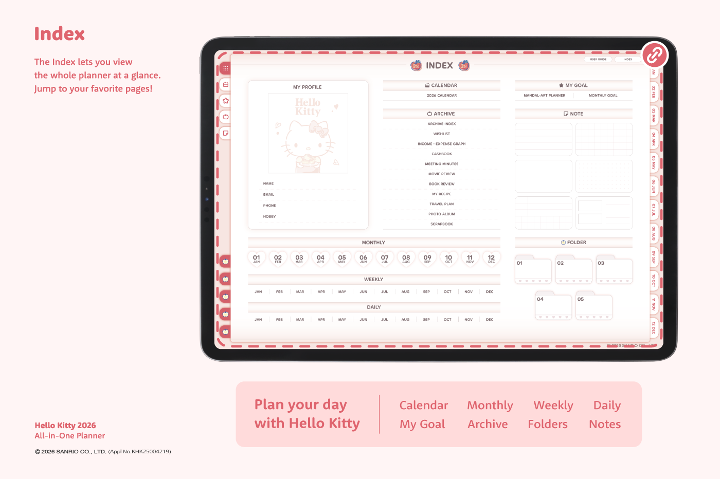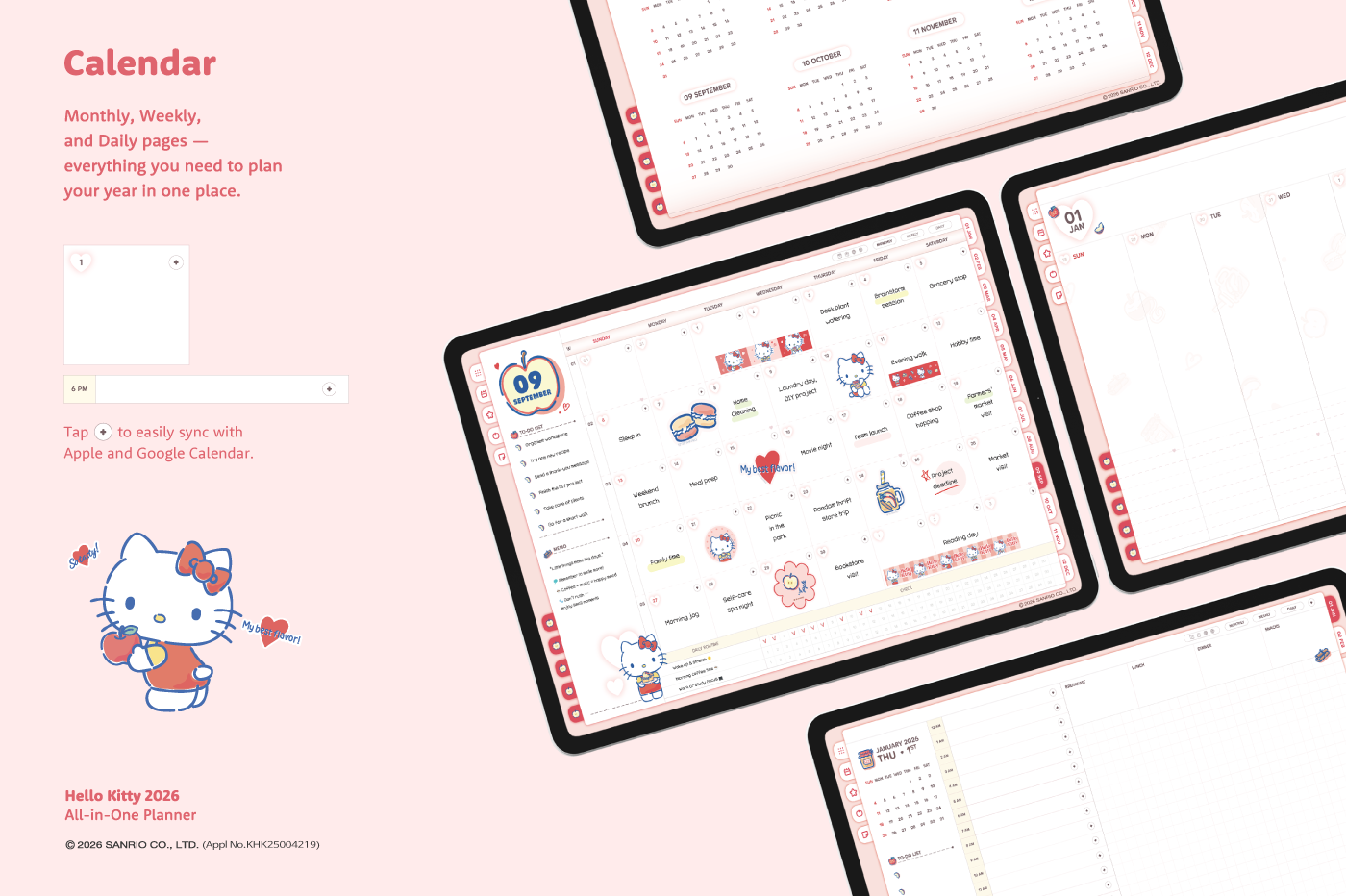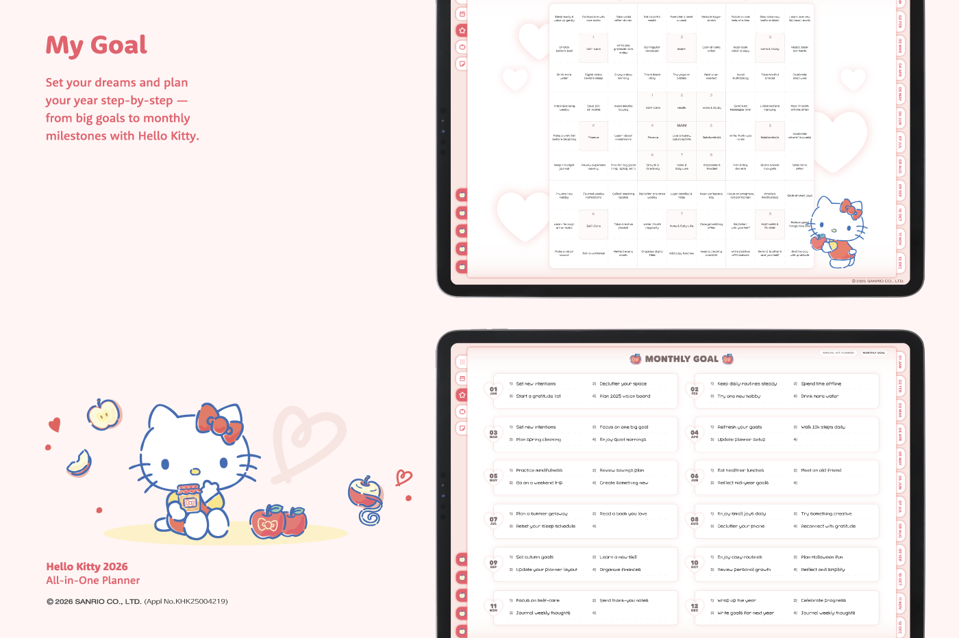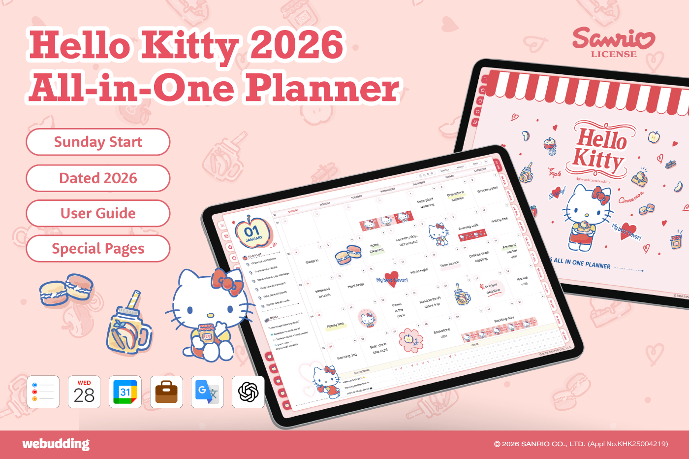 This product is for personal use only. Any unlawful use of the content may results in revoke of access. [Page Composition] - Apple & Google Calendar Integration (Apple Devices Only) - Shortcuts Integration (Calendar, Utility, Translate, ChatGPT) - Sunday start - Covers (3 types) - Calendar - Mandal-art, Monthly goals - Overview, Monthly, Weekly, Daily - 10 Archive Templates - Notes (6 types) - Folders (5 types) This product is permitted to a License agreement between Sanrio Korea Co., Ltd. and Webudding Corp., and unauthorized reproduction of this product and its characters is prohibited.