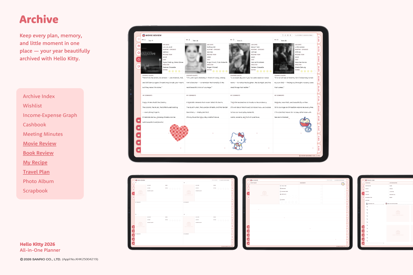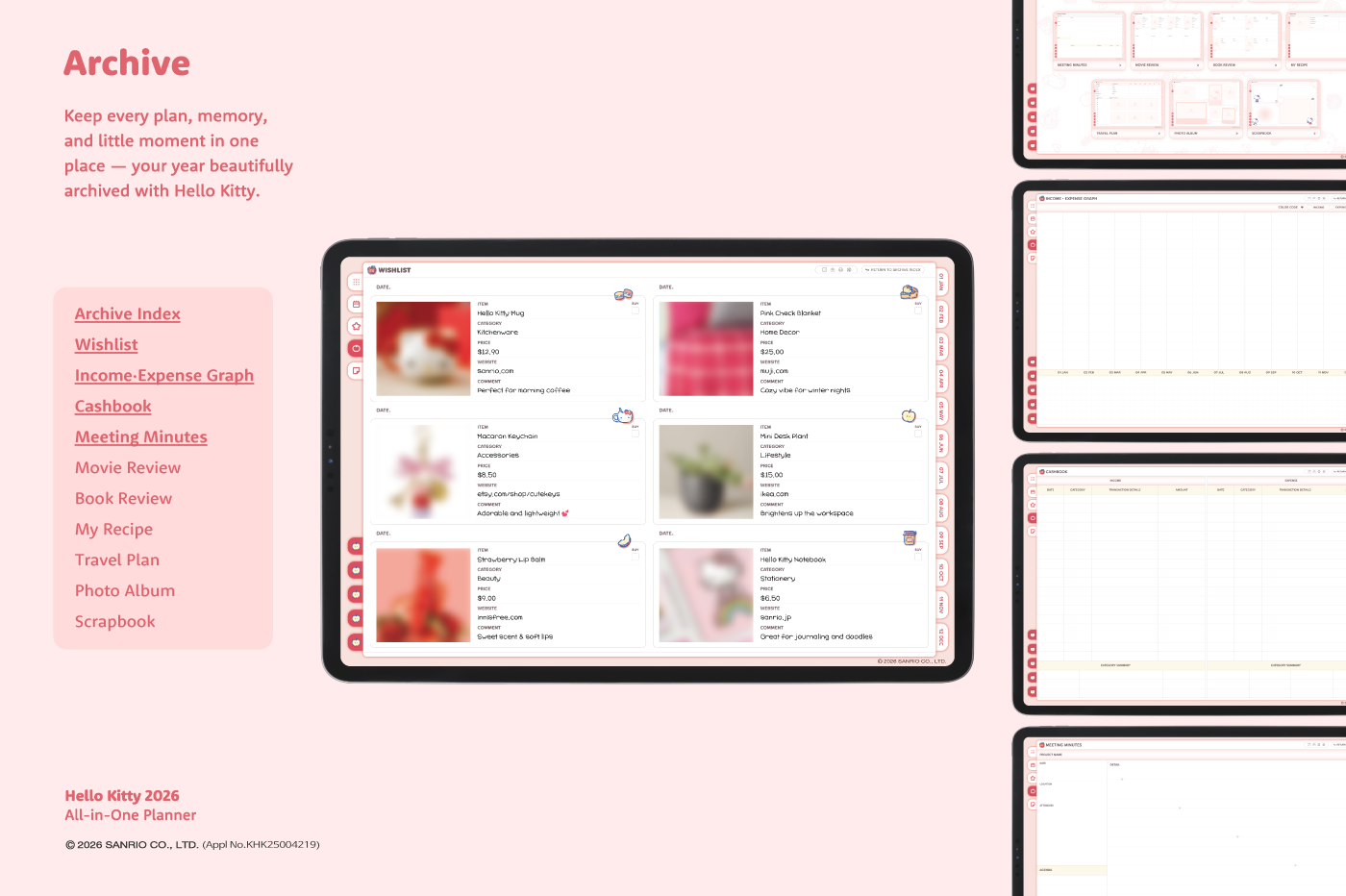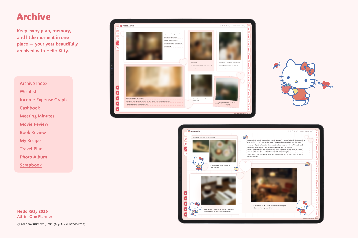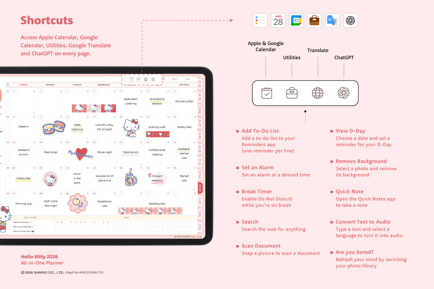 This product is for personal use only. Any unlawful use of the content may results in revoke of access. [Page Composition] - Apple & Google Calendar Integration (Apple Devices Only) - Shortcuts Integration (Calendar, Utility, Translate, ChatGPT) - Sunday start - Covers (3 types) - Calendar - Mandal-art, Monthly goals - Overview, Monthly, Weekly, Daily - 10 Archive Templates - Notes (6 types) - Folders (5 types) This product is permitted to a License agreement between Sanrio Korea Co., Ltd. and Webudding Corp., and unauthorized reproduction of this product and its characters is prohibited.