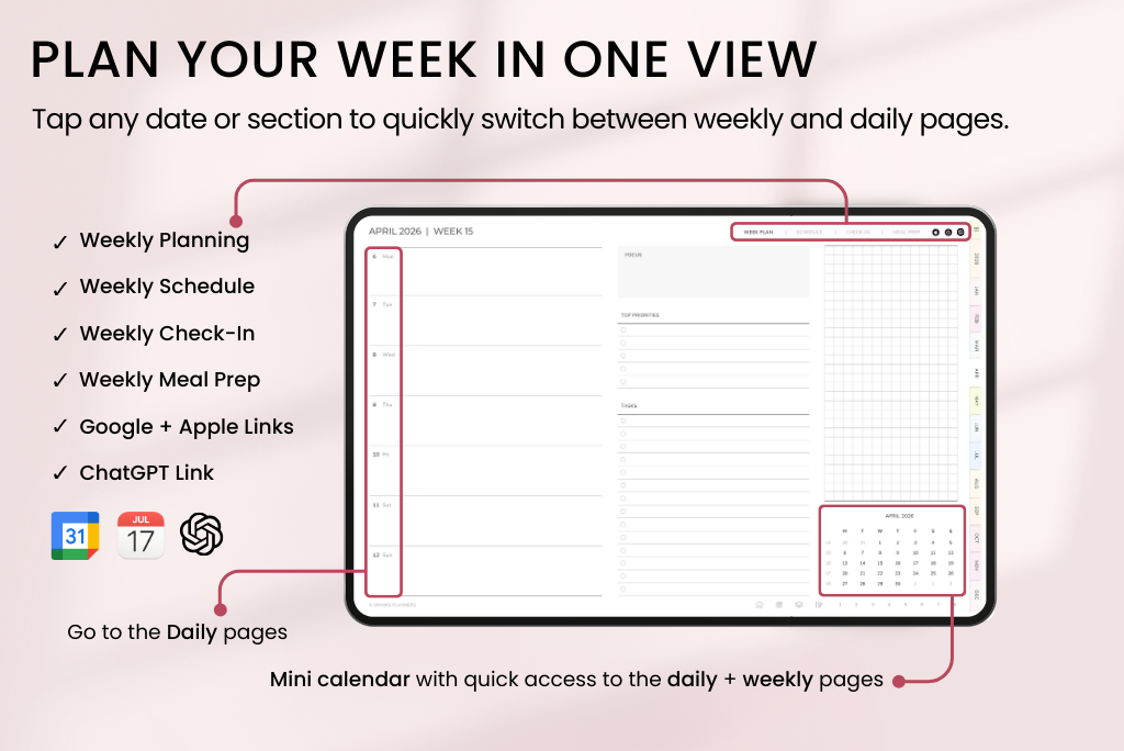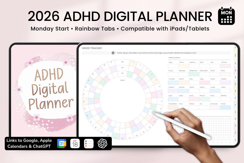 This 2026 ADHD planner helps you plan in a way that actually sticks. It’s packed with simple, supportive templates for focus, memory, and balance — all organized to keep things easy and stress-free. It comes with a Monday-start calendar, connects with Apple & Google Calendar, and includes a direct ChatGPT link for smart planning support.