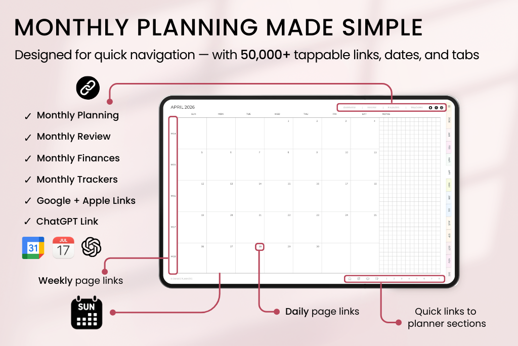 This 2026 ADHD planner helps you plan in a way that actually sticks. It’s packed with simple, supportive templates for focus, memory, and balance — all organized to keep things easy and stress-free. It comes with a Sunday-start calendar, connects with Apple & Google Calendar, and includes a direct ChatGPT link for smart planning support.