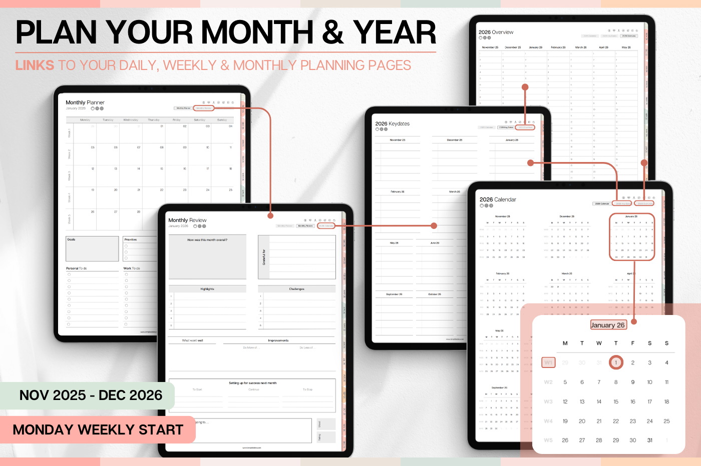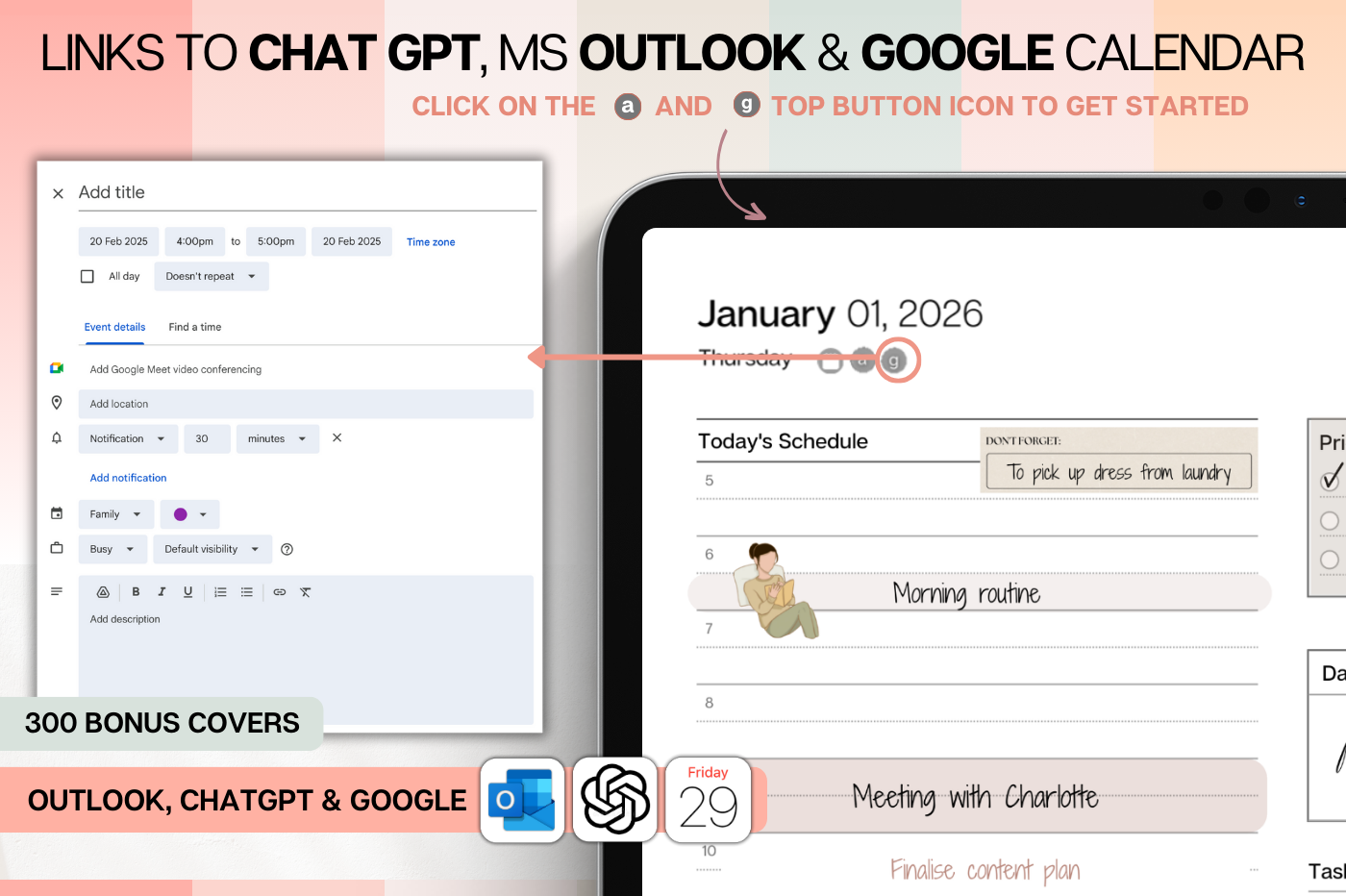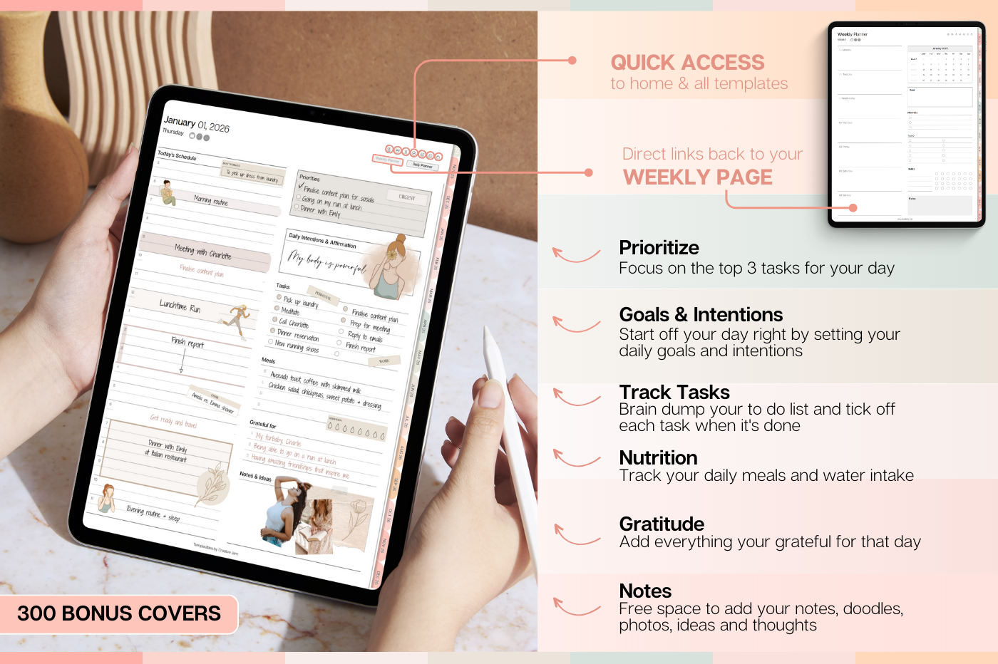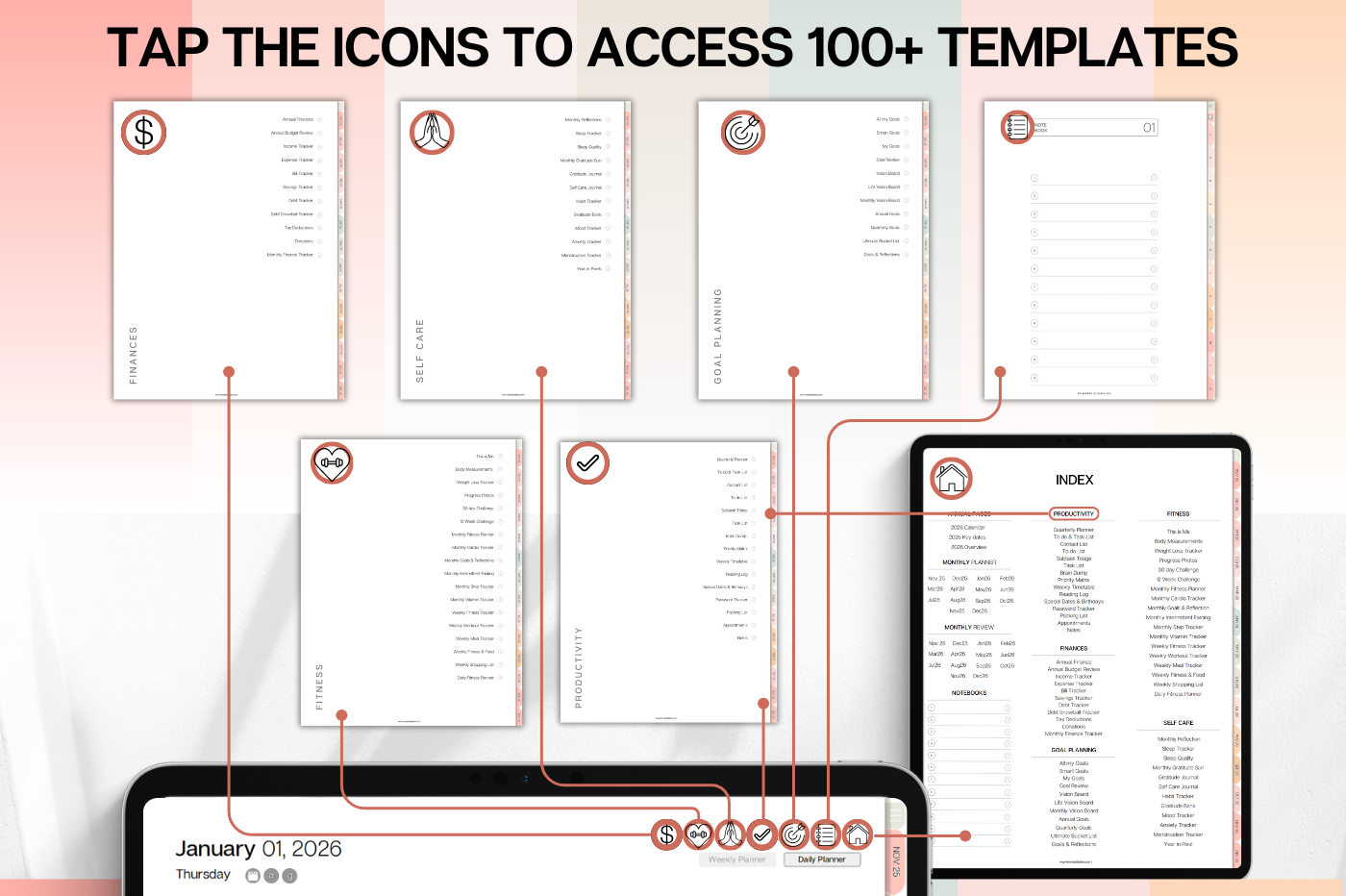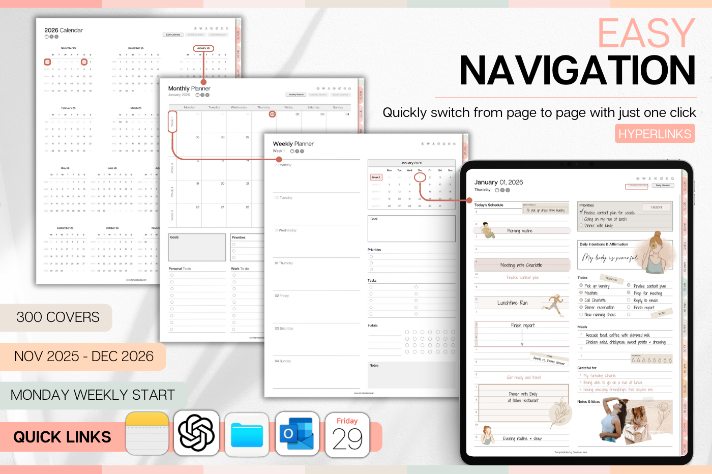 Plan smarter in 2026! This colorful Daily Planner helps you organize every part of your life with clean, functional layouts that make planning effortless. • Daily, weekly & monthly planners for structure & flow • Time blocking for productivity & balance • 100+ lifestyle planning templates, 12 notebooks and 40 page templates • 300+ bonus digital covers 🔗 Integration with Apple & Google Calendars, Chat GPT, MS Outllok, Apple Notes, Files, Mail & Reminders Plan simply. Live intentionally.