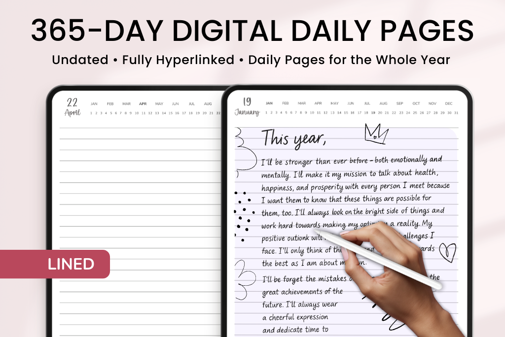 These 365-Day Digital Daily Pages are undated and fully hyperlinked, so you can jump to any day with just a tap. Use them however you like — for planning, journaling, daily reflections, gratitude, brain dumps, sketching out ideas, or just getting your thoughts into one place.