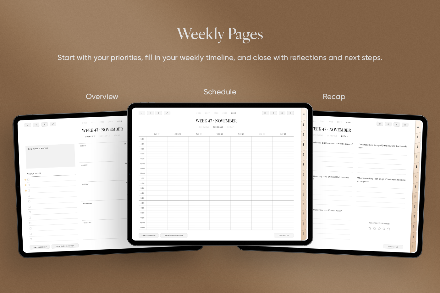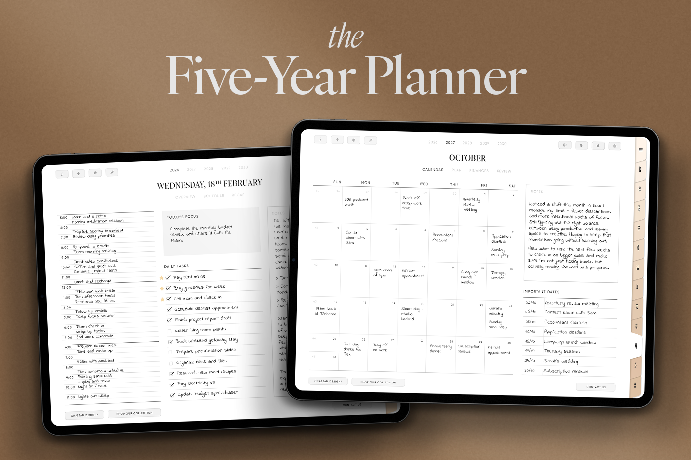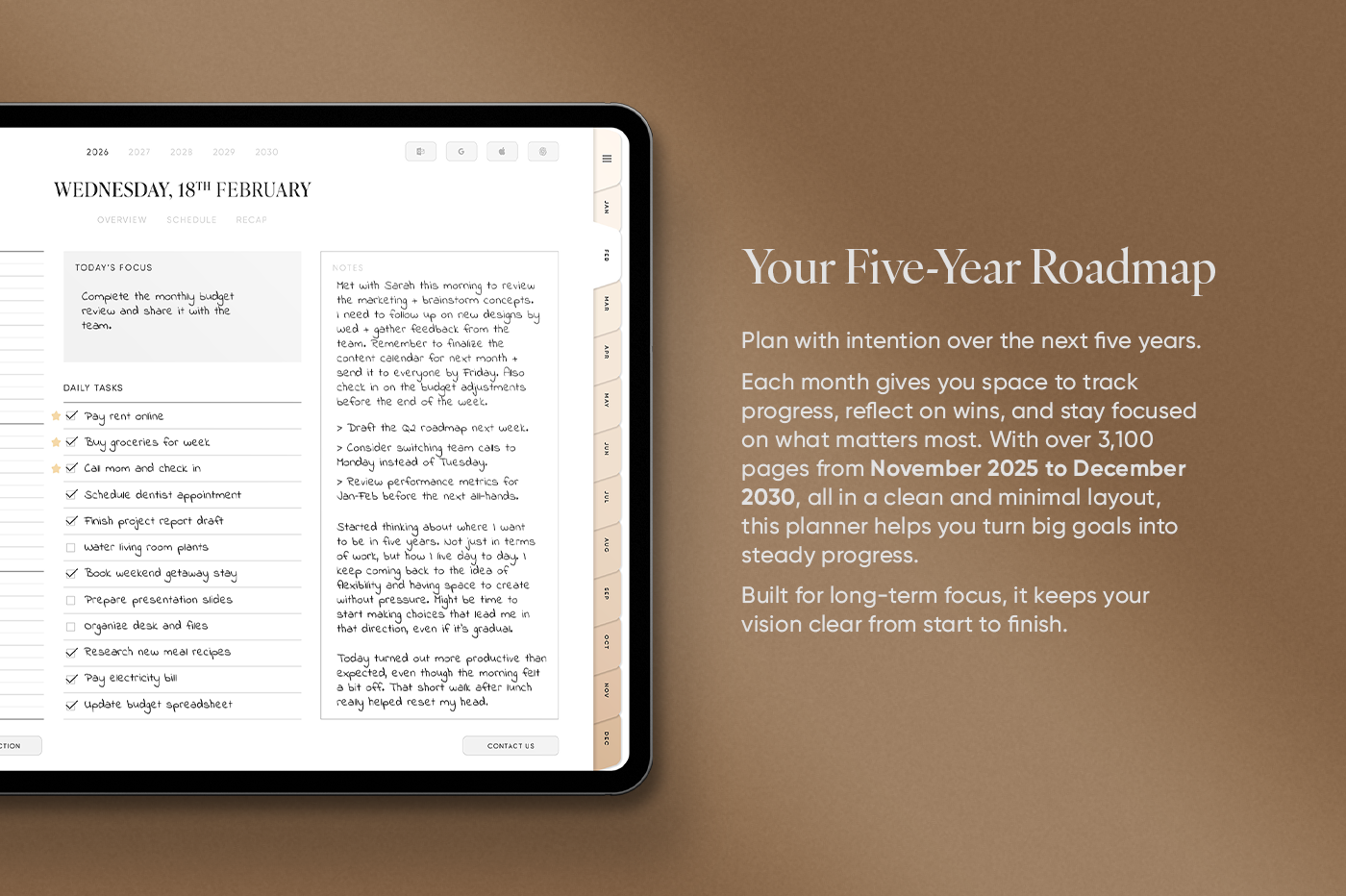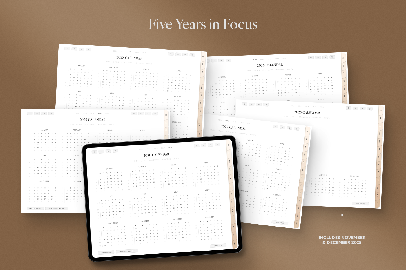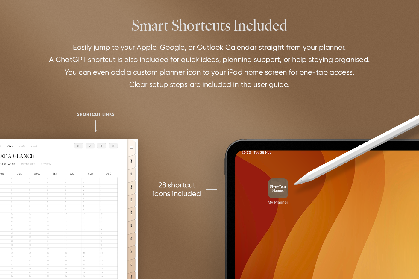The Five-Year Planner is designed to keep things simple while helping you see the bigger picture. It gives you space to plan long-term goals, stay on track month by month, and reflect at the end of each year. This planner runs from November 2025 right up to January 2031, with fully hyperlinked pages that make it easy to move anywhere instantly. You’ll also find calendar shortcuts for Apple, Google, and Outlook, along with built-in ChatGPT.