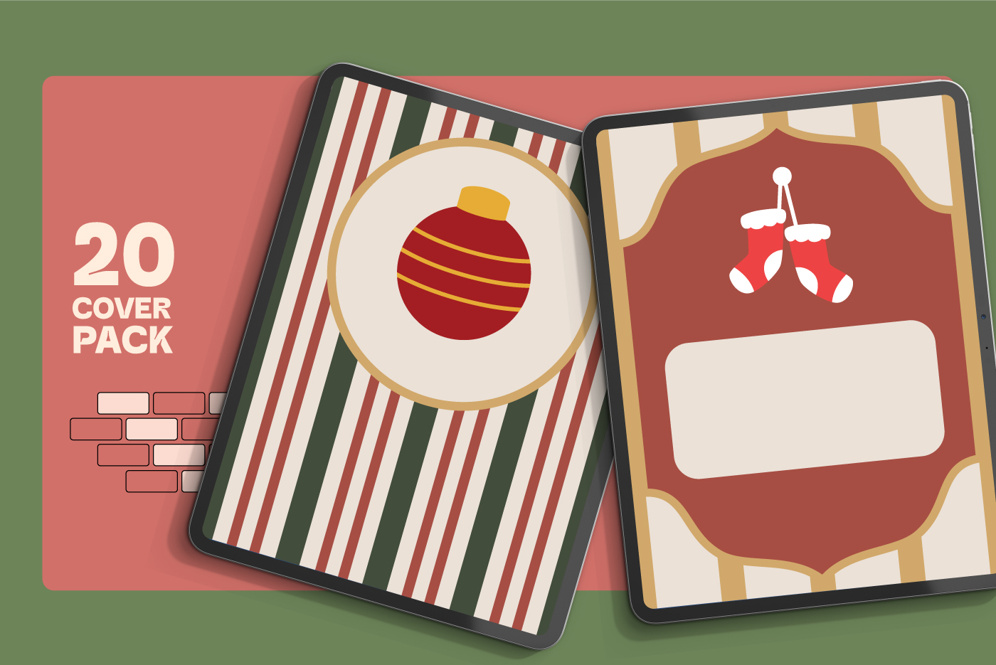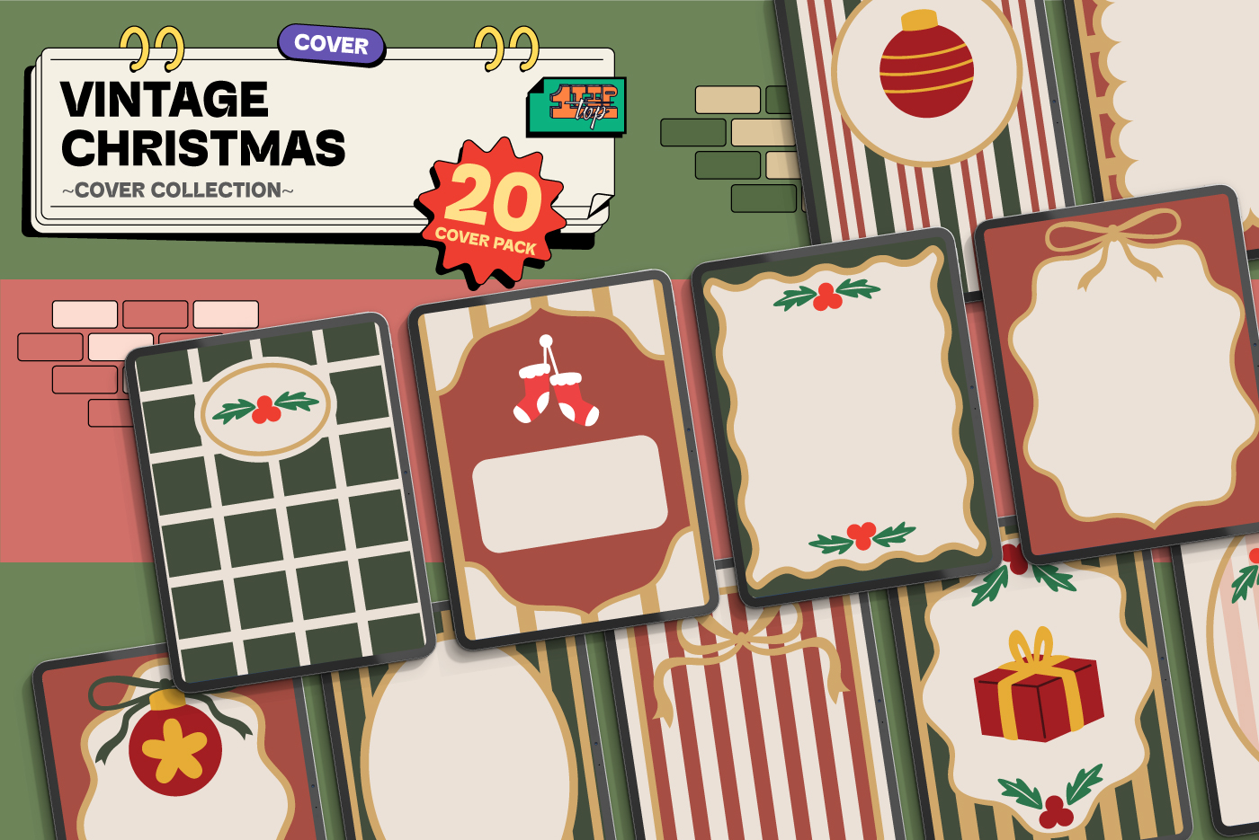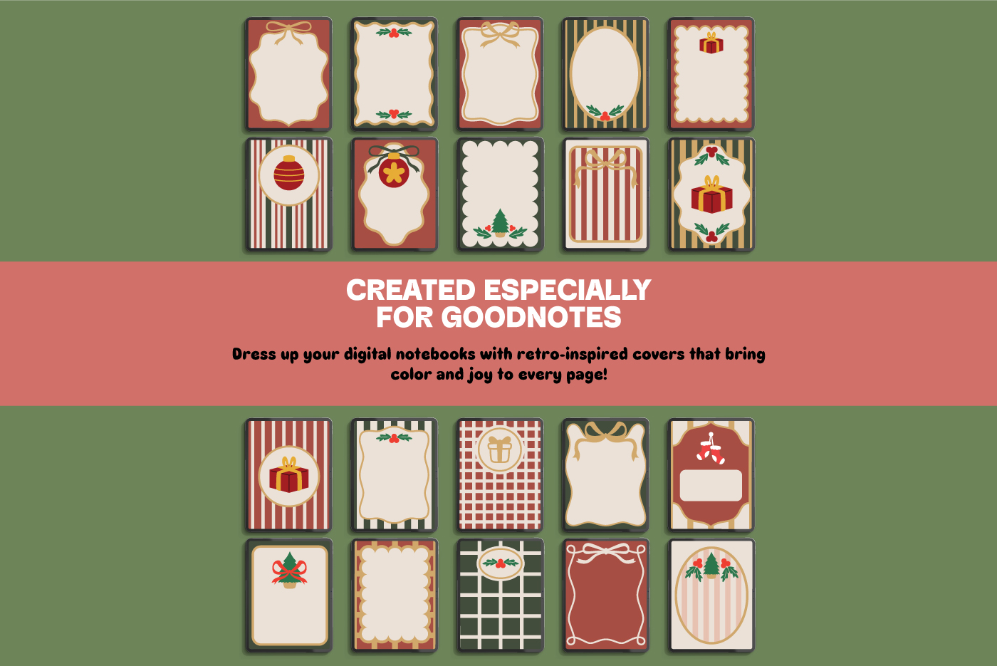A charming collection of 20 festive covers inspired by classic holiday décor. Warm colors, retro ornaments, and nostalgic patterns make this set perfect for planners, journals, and digital stationery during the Christmas season