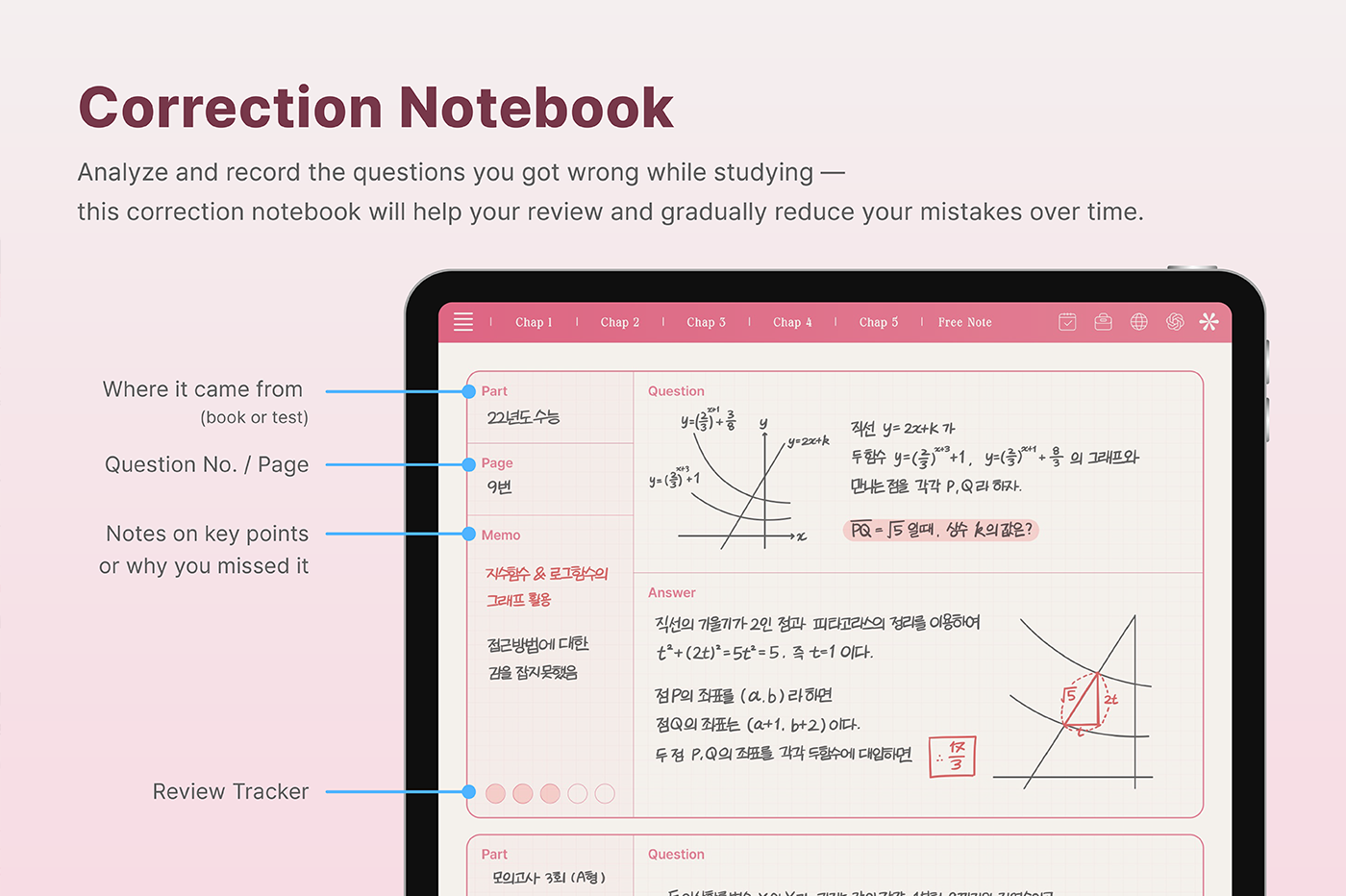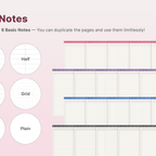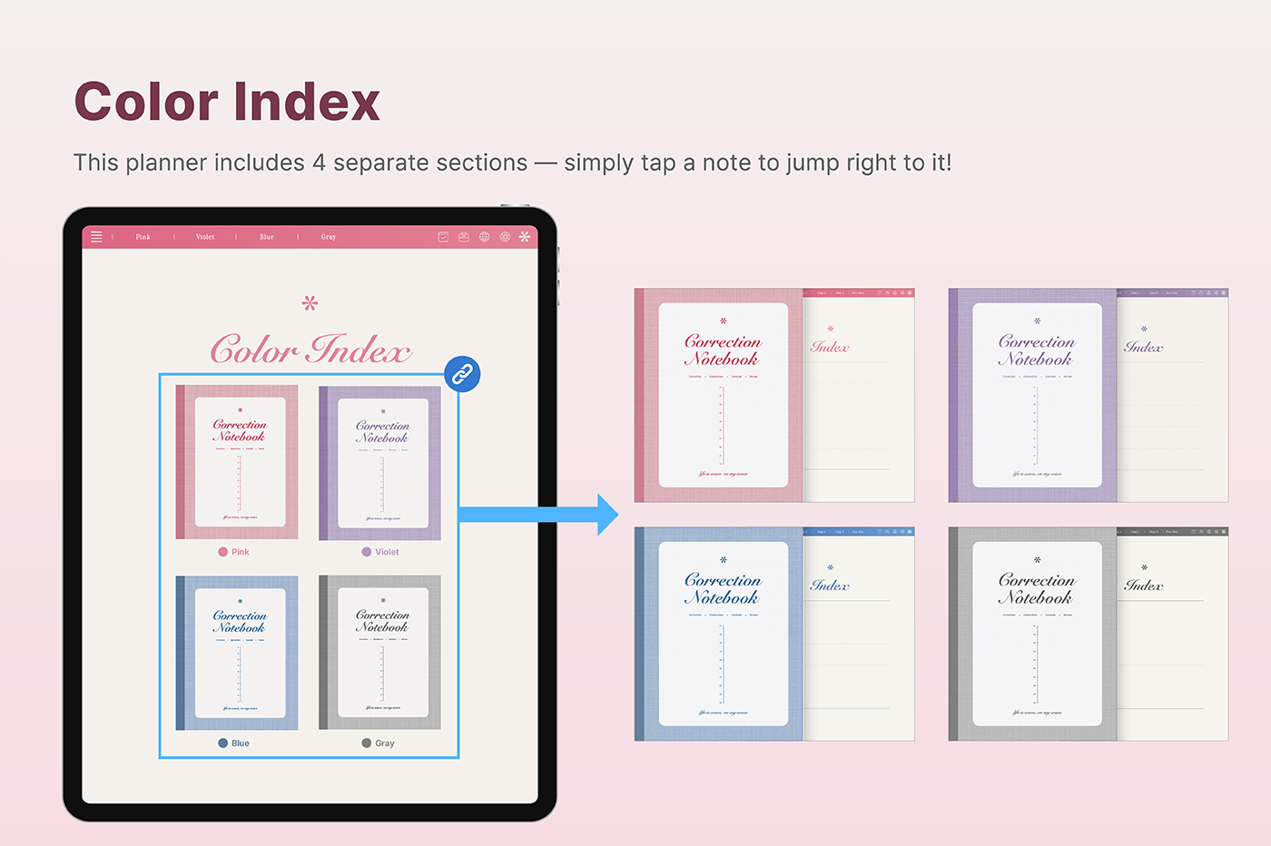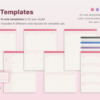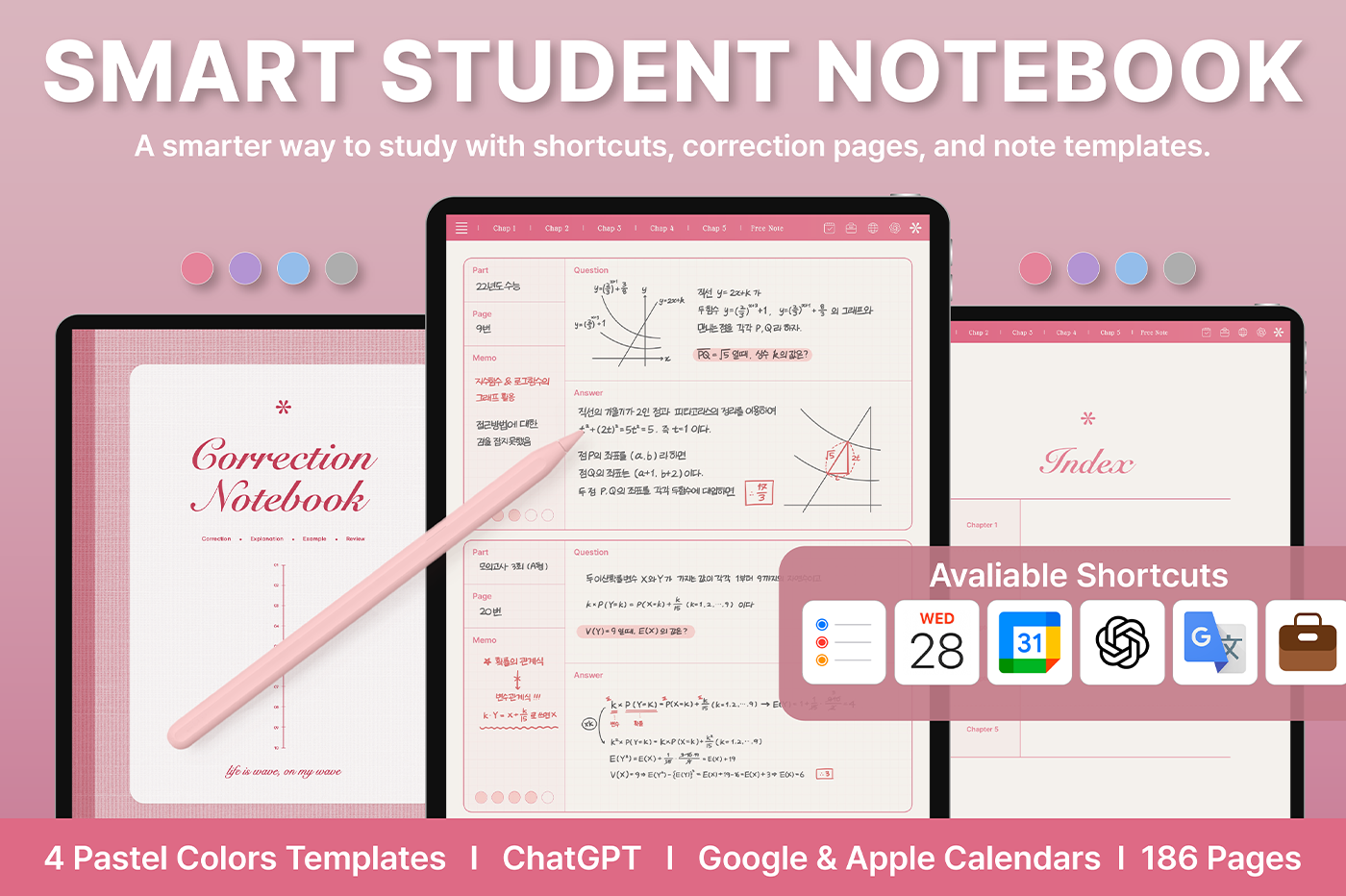 This is a correction notebook designed for structured learning. Each layout is color-coded in soft pastel tones to create an efficient and organized learning environment. [Page Composition] - User Guide - Apple & Google Calendar Integration - Shortcuts Integration (Utilities, Google Translate, ChatGPT) - Covers - Color Index - Study Notes (6 types x 4 colors) - Free Notes (6 types x 4 colors) - Binders (5)