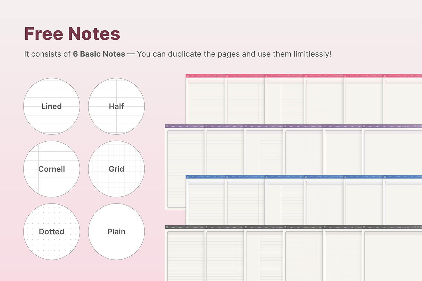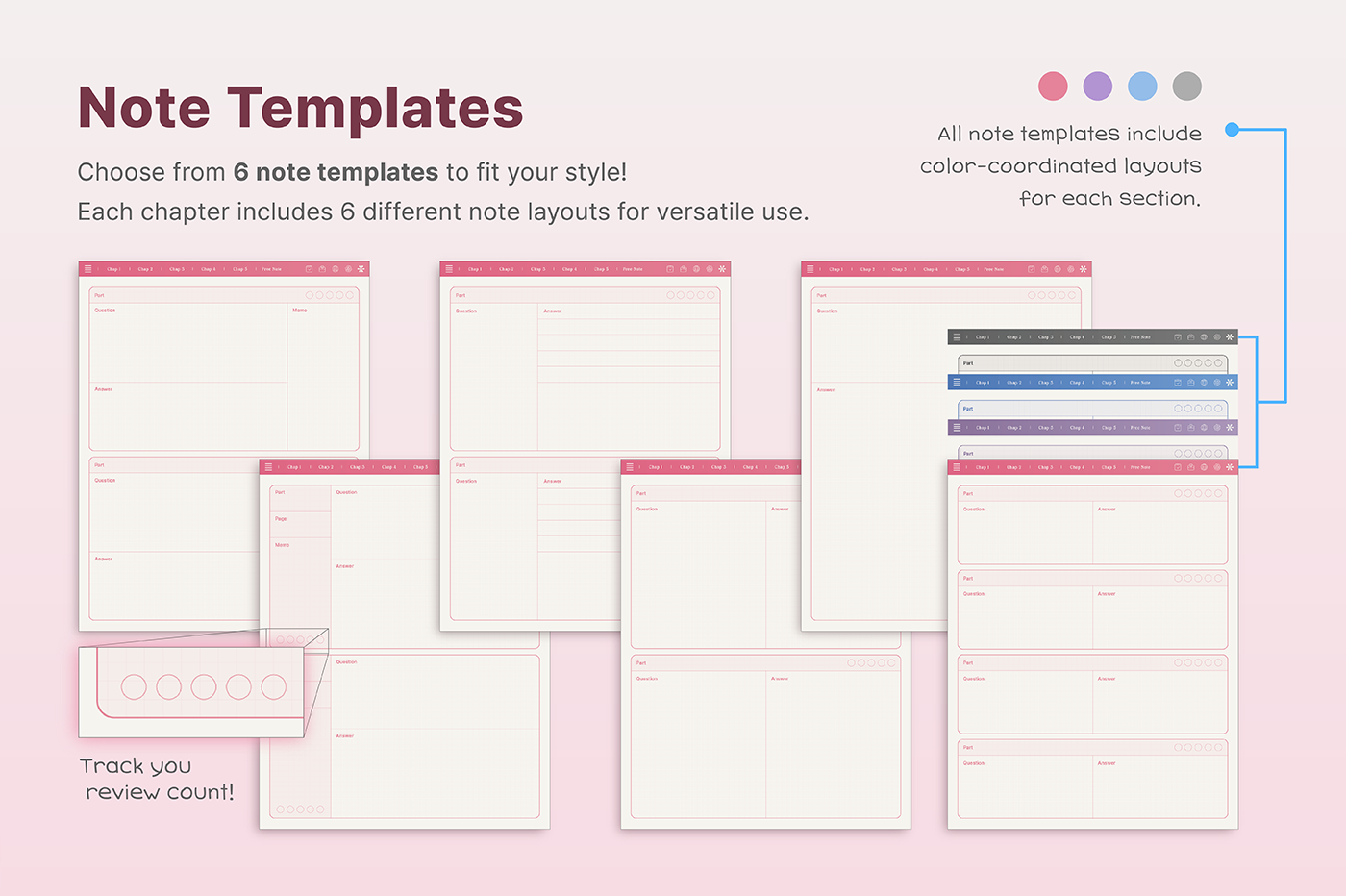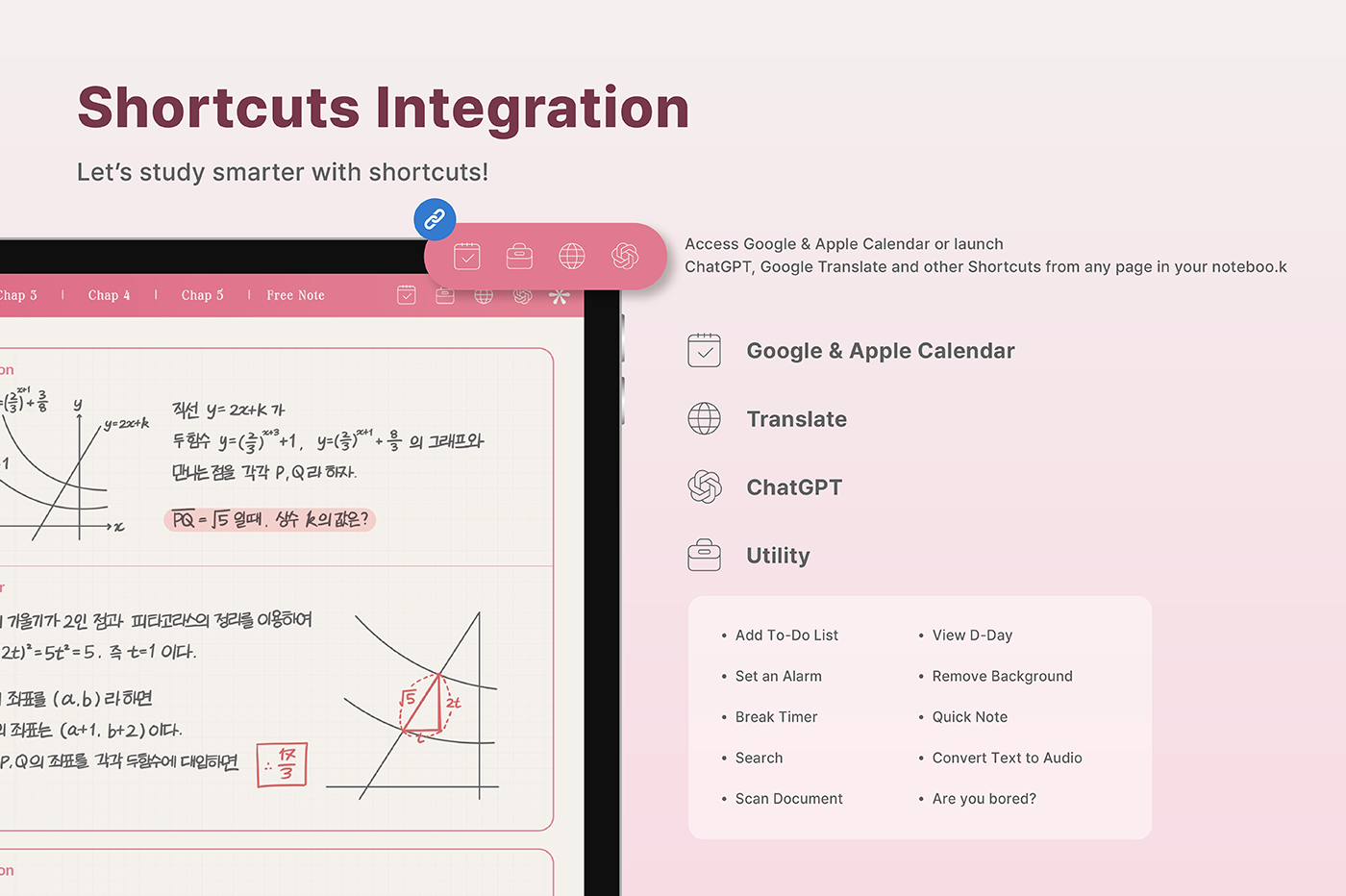 This is a correction notebook designed for structured learning. Each layout is color-coded in soft pastel tones to create an efficient and organized learning environment. [Page Composition] - User Guide - Apple & Google Calendar Integration - Shortcuts Integration (Utilities, Google Translate, ChatGPT) - Covers - Color Index - Study Notes (6 types x 4 colors) - Free Notes (6 types x 4 colors) - Binders (5)
