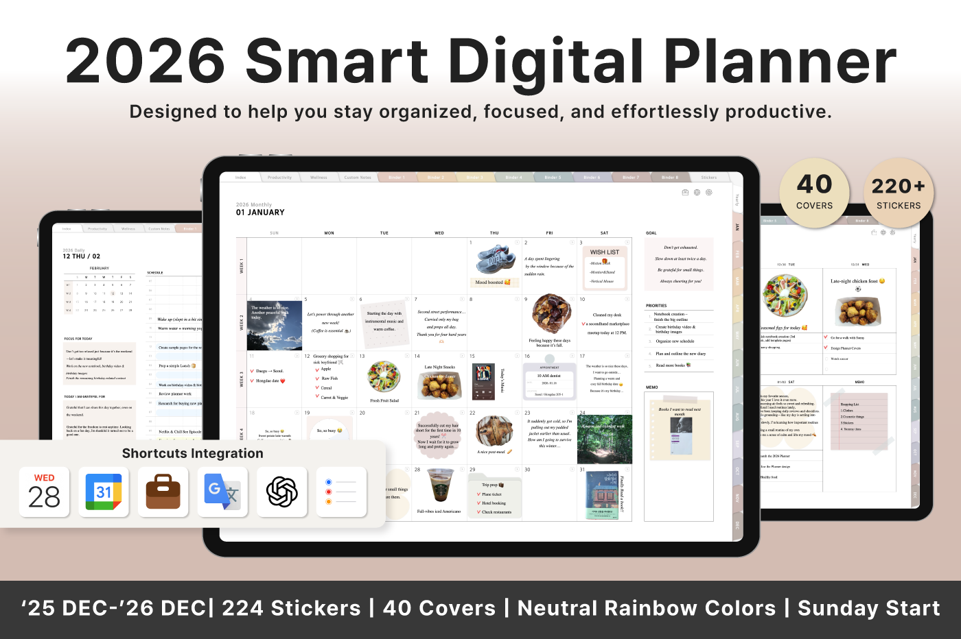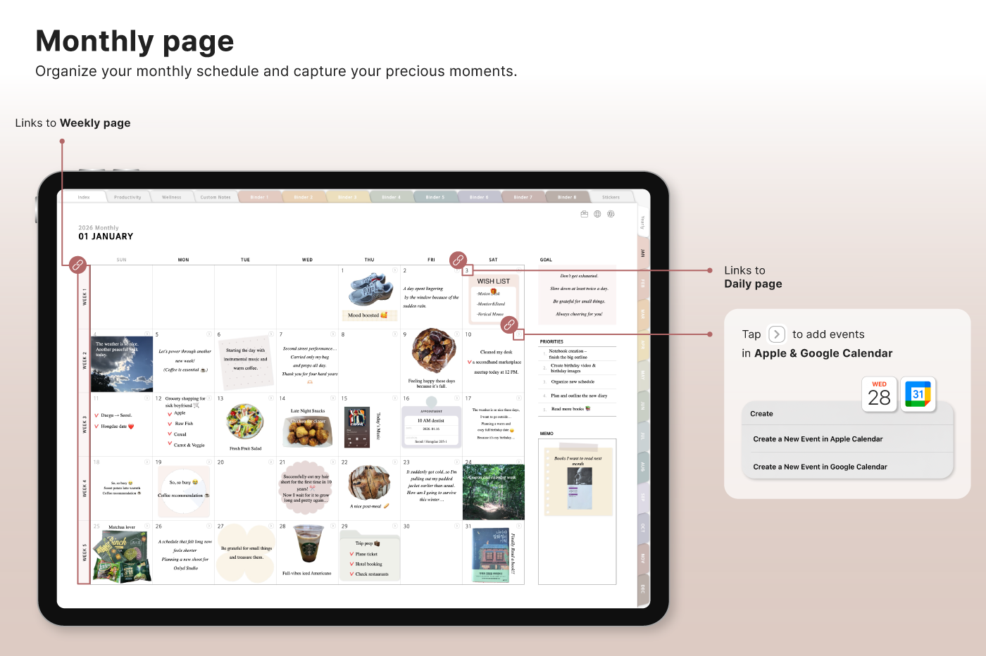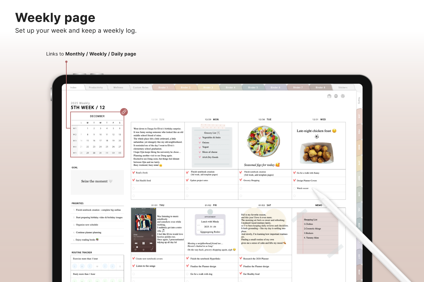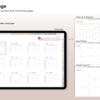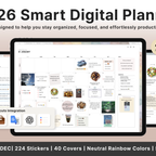 Build a convenient recording habit with an intuitive layout and hyperlink tabs that let you move easily between each page. [Page Composition] - Hyperlinks - User Guide - Apple & Google Calendar Integration - Shortcuts Integration (Utility, Google Translate, ChatGPT) - Dec '25 Included - Covers (40) - Calendar, Year at a Glance, Vision Board - Monthly / Weekly / Daily Plans - Productivity (6 types) - Wellness (7 types) - Note Binders (8) - Notes (24 types) - 220+ Stickers