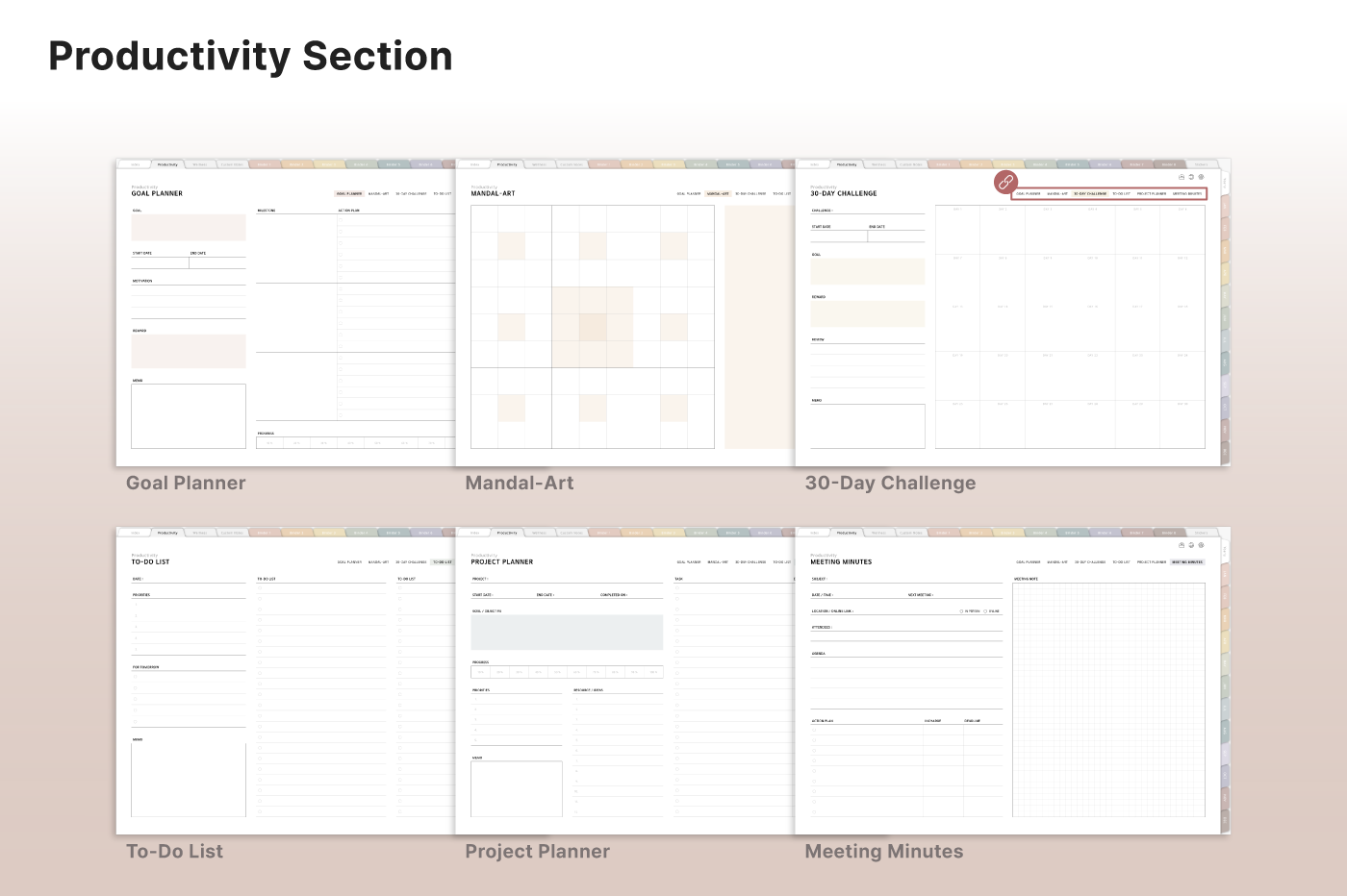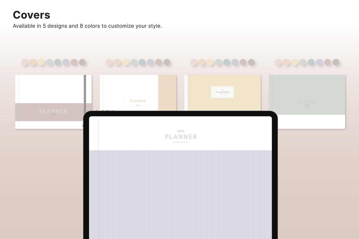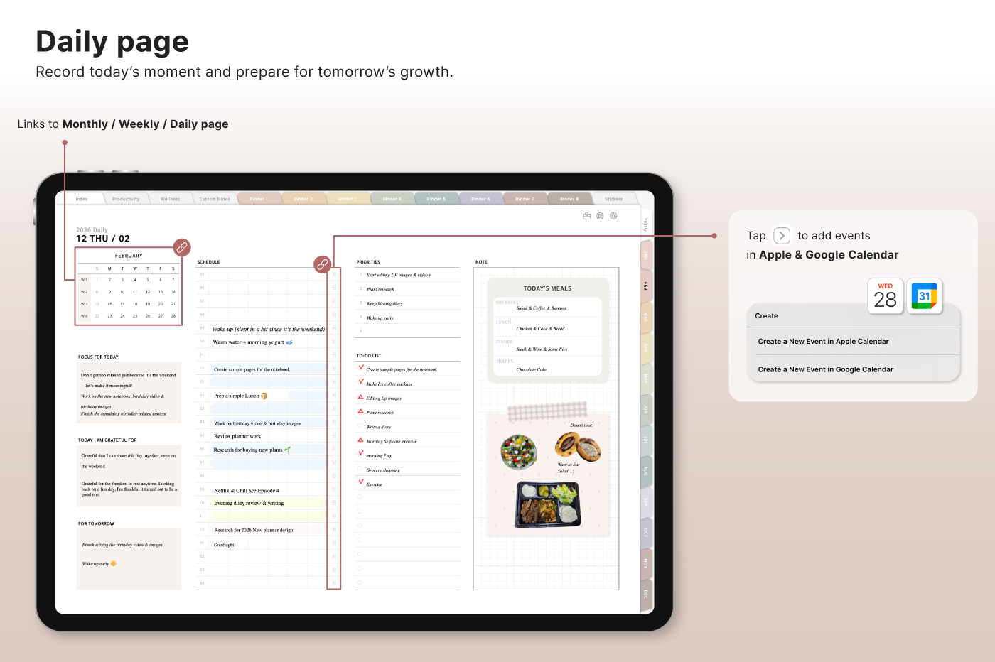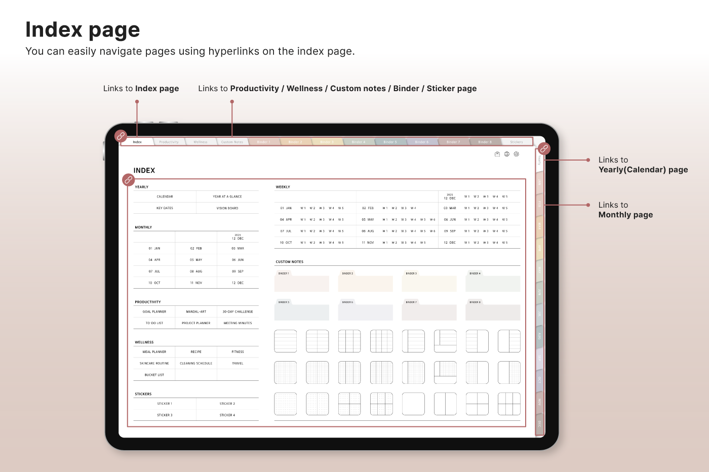 Build a convenient recording habit with an intuitive layout and hyperlink tabs that let you move easily between each page. [Page Composition] - Hyperlinks - User Guide - Apple & Google Calendar Integration - Shortcuts Integration (Utility, Google Translate, ChatGPT) - Dec '25 Included - Covers (40) - Calendar, Year at a Glance, Vision Board - Monthly / Weekly / Daily Plans - Productivity (6 types) - Wellness (7 types) - Note Binders (8) - Notes (24 types) - 220+ Stickers