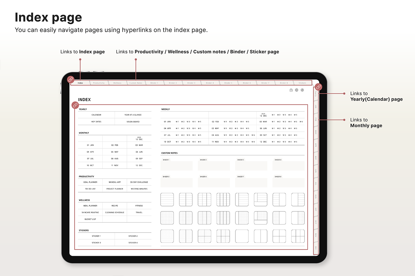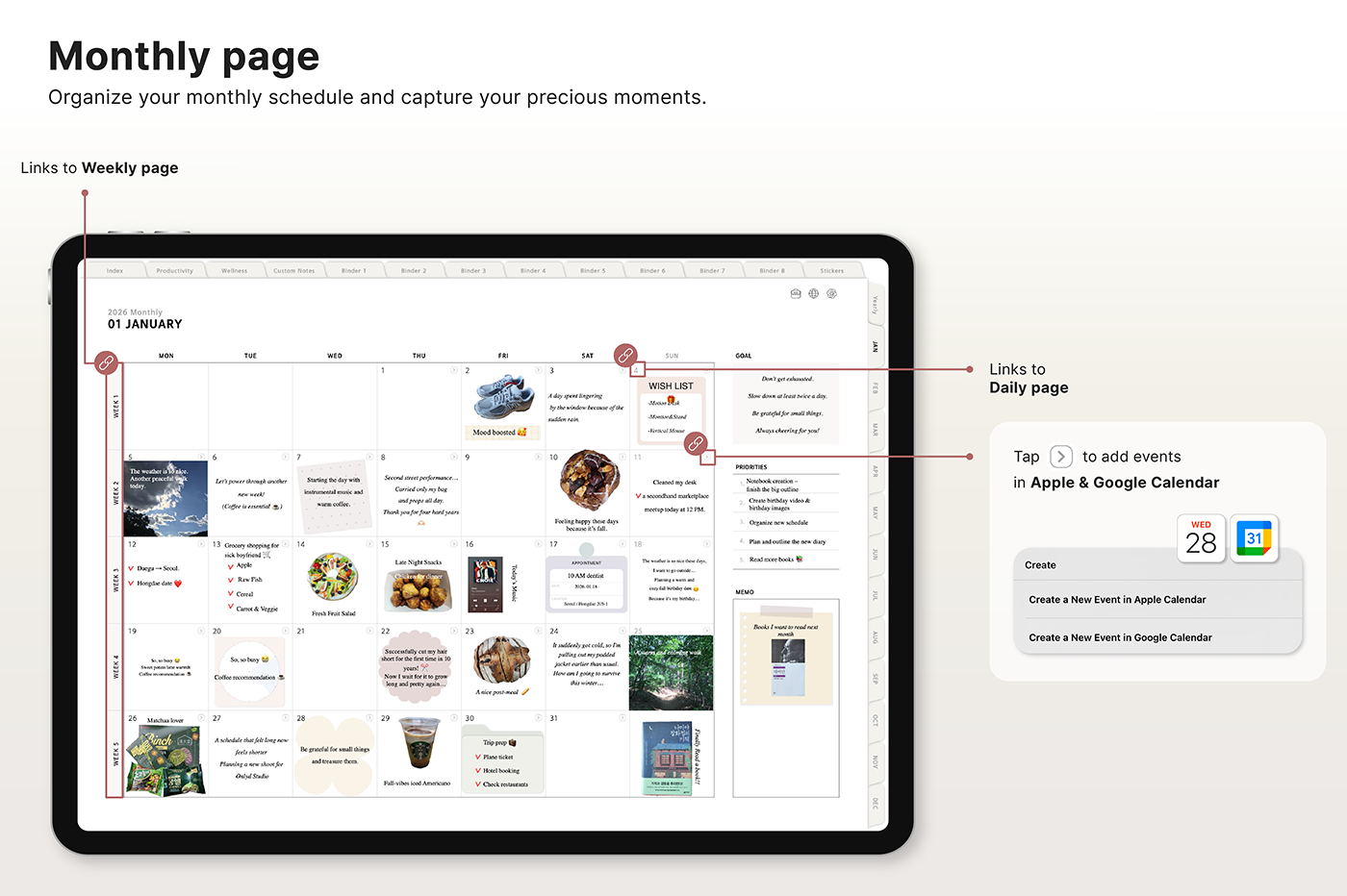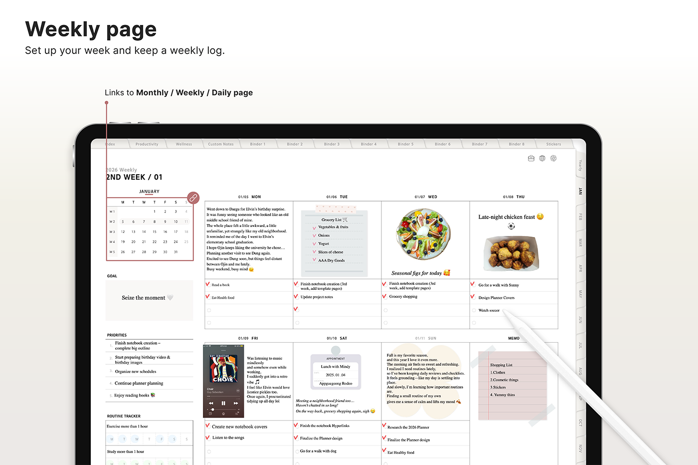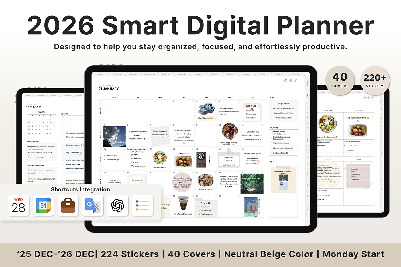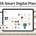 Build a convenient recording habit with an intuitive layout and hyperlink tabs that let you move easily between each page. [Page Composition] - Hyperlinks - User Guide - Apple & Google Calendar Integration - Shortcuts Integration (Utility, Google Translate, ChatGPT) - Dec '25 Included - Covers (40) - Calendar, Year at a Glance, Vision Board - Monthly / Weekly / Daily Plans - Productivity (6 types) - Wellness (7 types) - Note Binders (8) - Notes (24 types) - 220+ Stickers