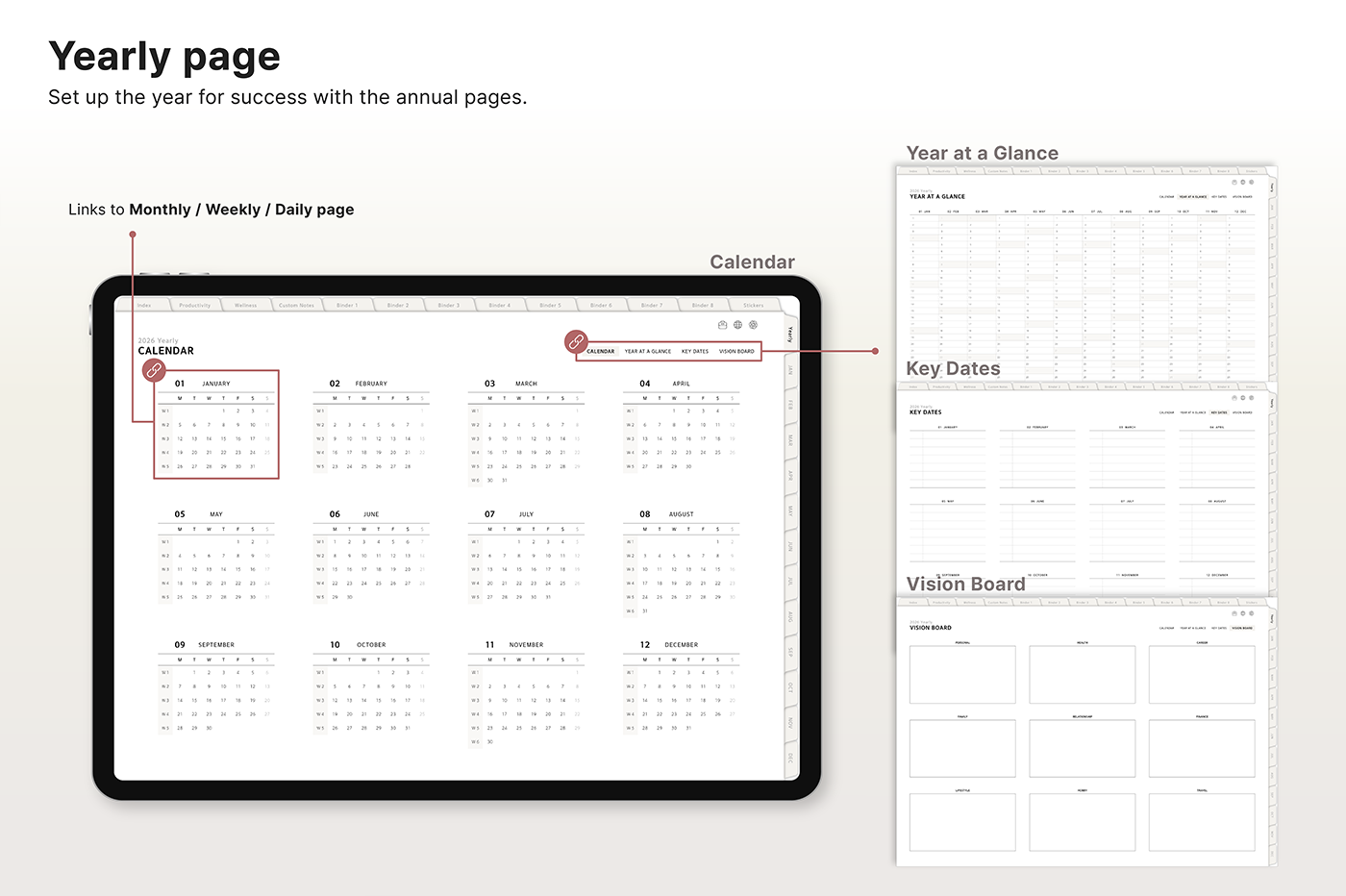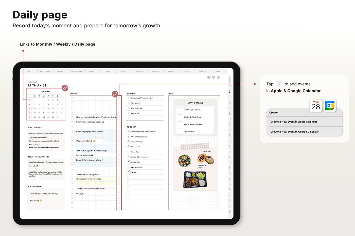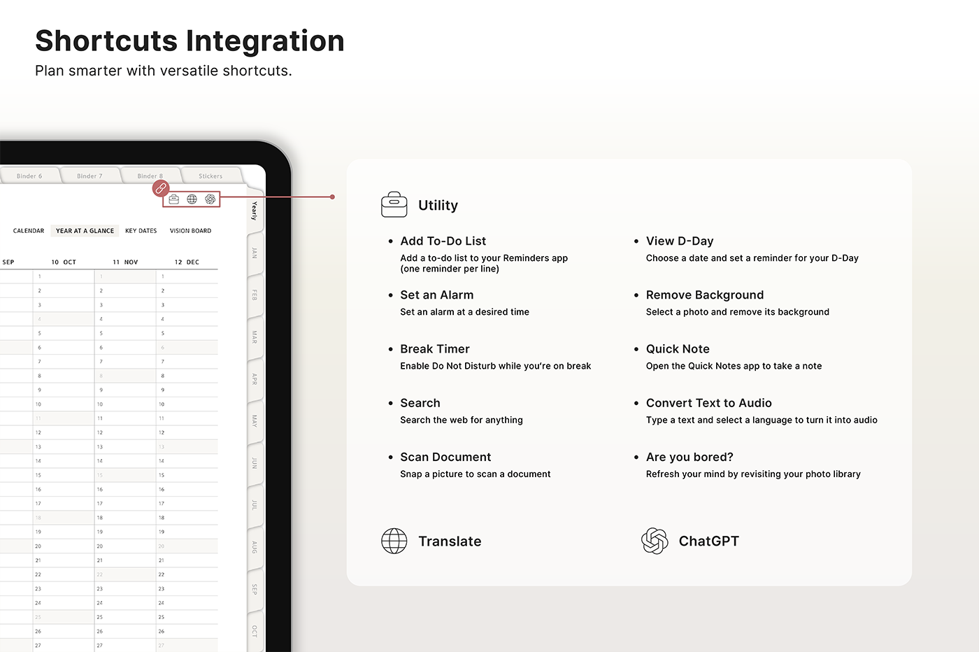 Build a convenient recording habit with an intuitive layout and hyperlink tabs that let you move easily between each page. [Page Composition] - Hyperlinks - User Guide - Apple & Google Calendar Integration - Shortcuts Integration (Utility, Google Translate, ChatGPT) - Dec '25 Included - Covers (40) - Calendar, Year at a Glance, Vision Board - Monthly / Weekly / Daily Plans - Productivity (6 types) - Wellness (7 types) - Note Binders (8) - Notes (24 types) - 220+ Stickers
