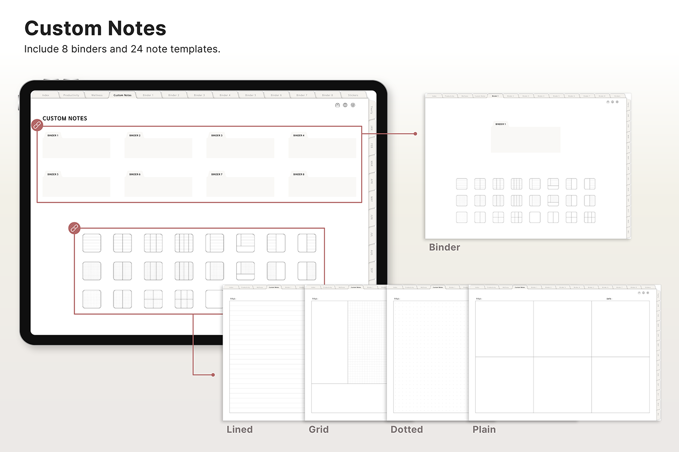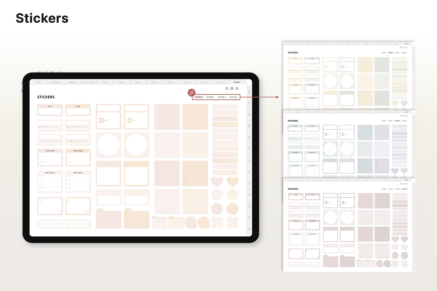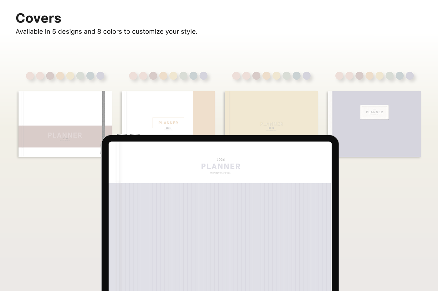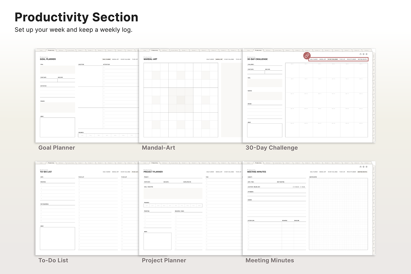 Build a convenient recording habit with an intuitive layout and hyperlink tabs that let you move easily between each page. [Page Composition] - Hyperlinks - User Guide - Apple & Google Calendar Integration - Shortcuts Integration (Utility, Google Translate, ChatGPT) - Dec '25 Included - Covers (40) - Calendar, Year at a Glance, Vision Board - Monthly / Weekly / Daily Plans - Productivity (6 types) - Wellness (7 types) - Note Binders (8) - Notes (24 types) - 220+ Stickers