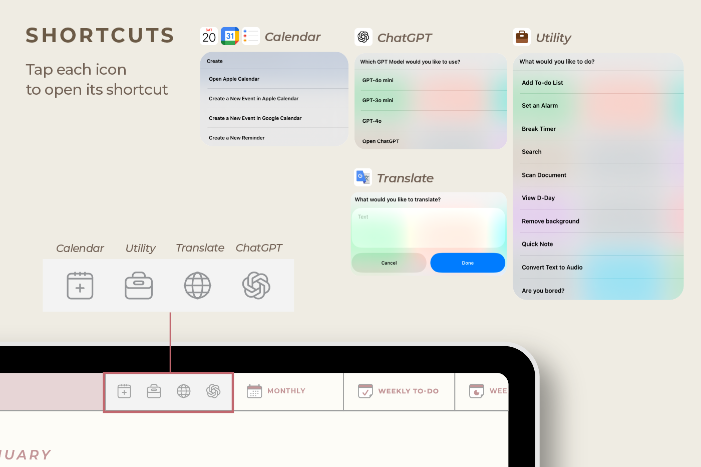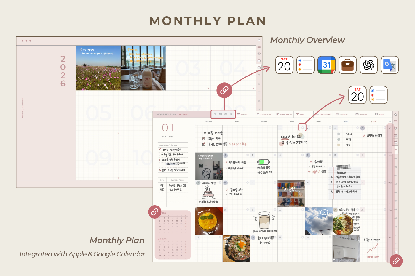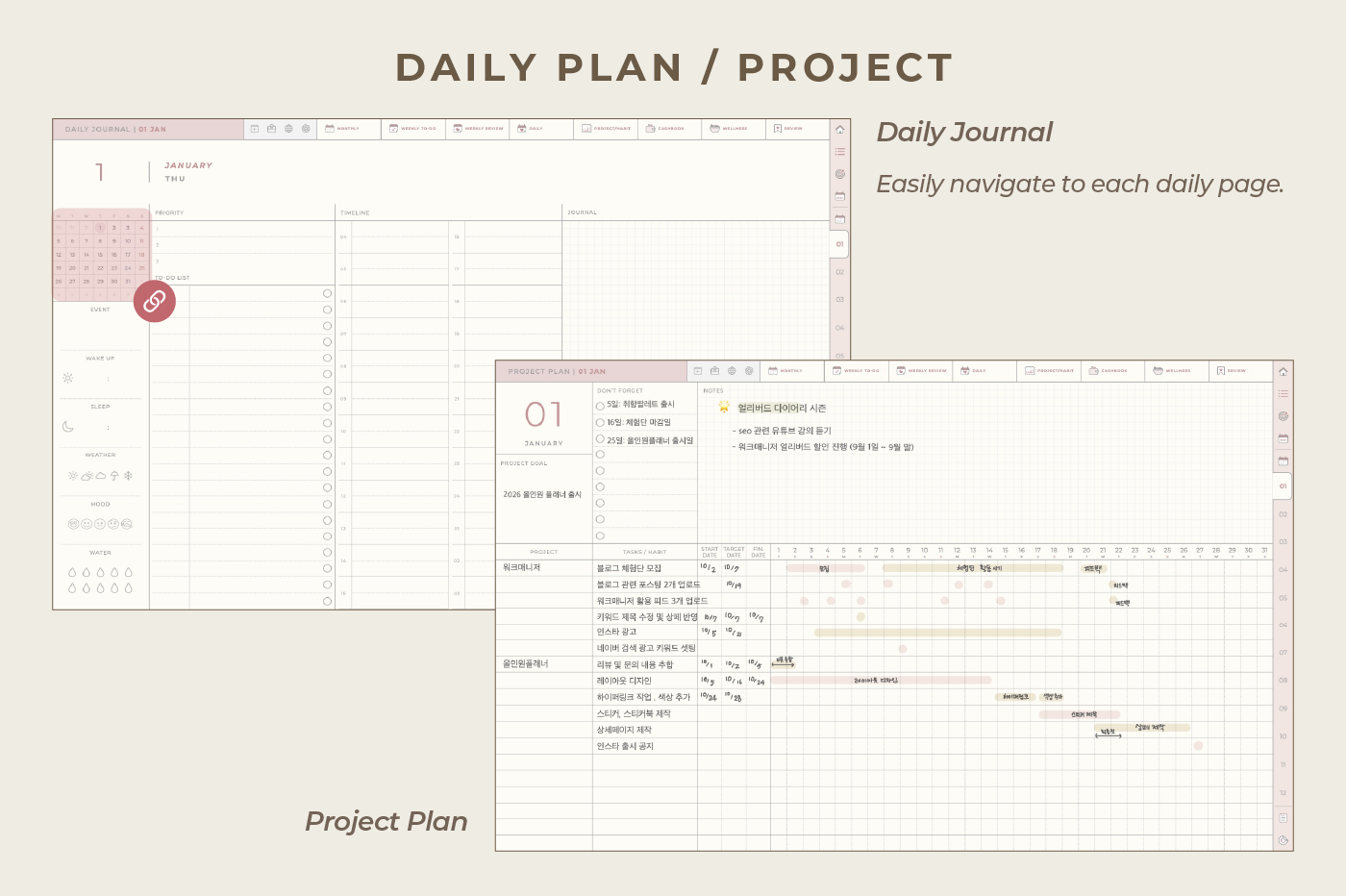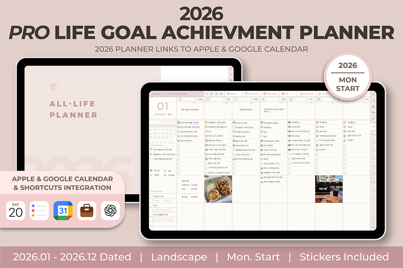 [Page Composition] - Hyperlinks - User Guide - Apple & Google Calendar Integration - Shortcuts Integration (Utility, Google Translate, ChatGPT) - Cover - Index - OKR Goal Setting - Yearly / Monthly Plans - Weekly To-do List / Riview - Daily Journal - Cashbook - Wellness Care - Notes (24 types) - Stickers - Color Code
