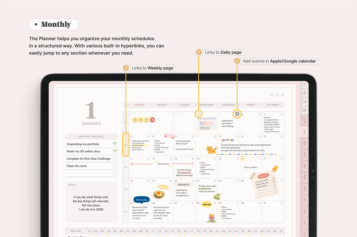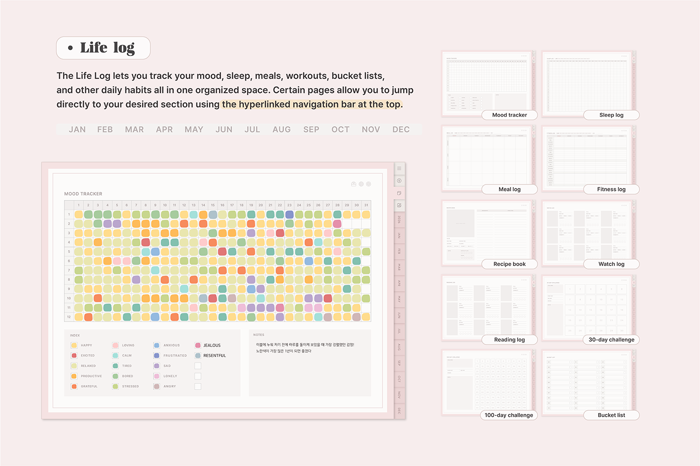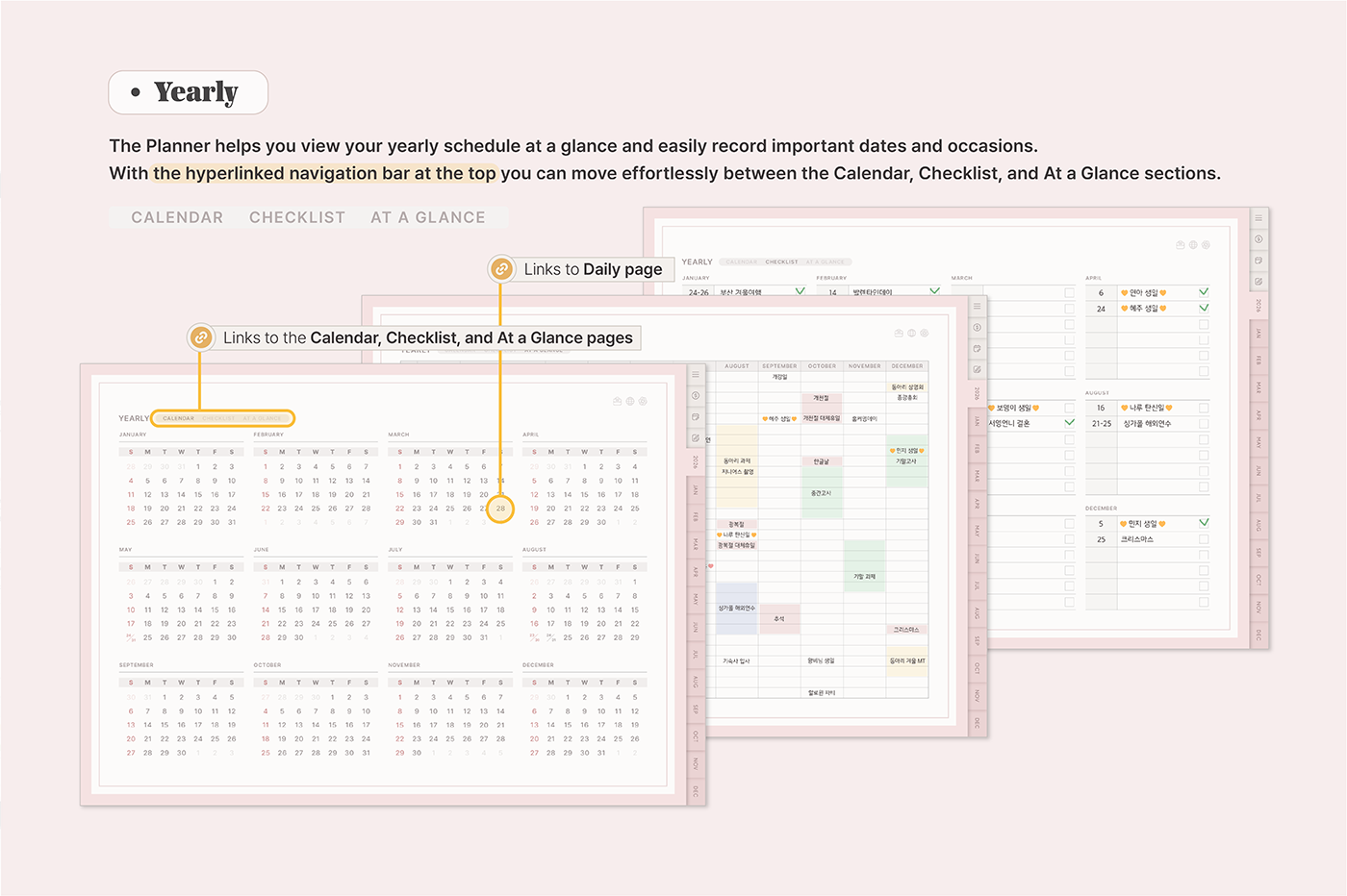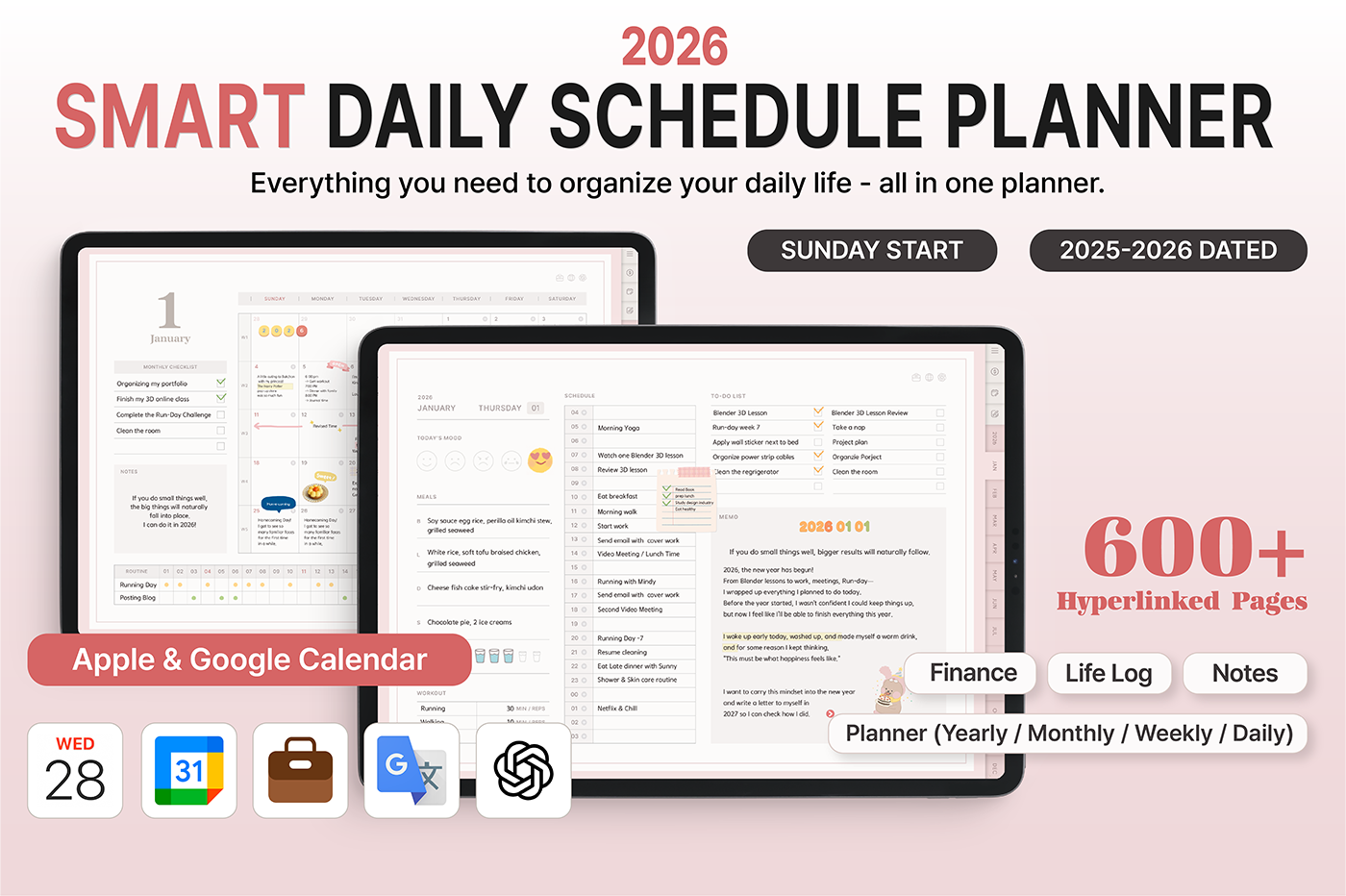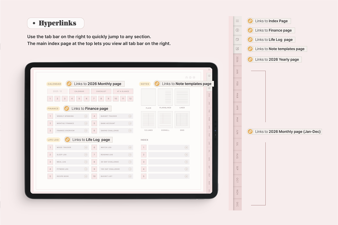 [Page Composition] - Hyperlinks - User Guide - Apple & Google Calendar Integration - Shortcuts Integration (Utility, Google Translate, ChatGPT) - Dec '25 Included - Cover - Index - Yearly : Calendar, Checklist, At a Glance - Monthly / Weekly / Daily Plans - Finance (6 types) - Life Log (10 types) - Note Binders (5) - Notes (6 types)