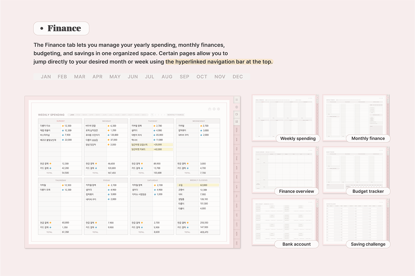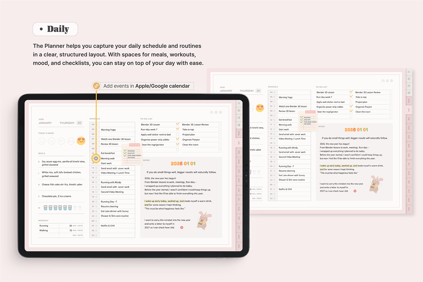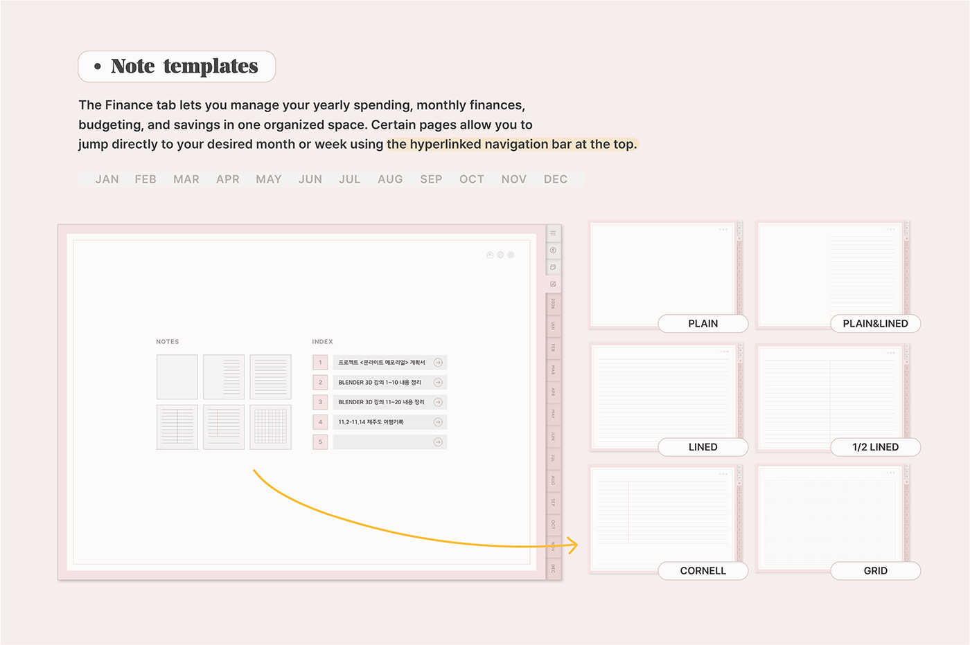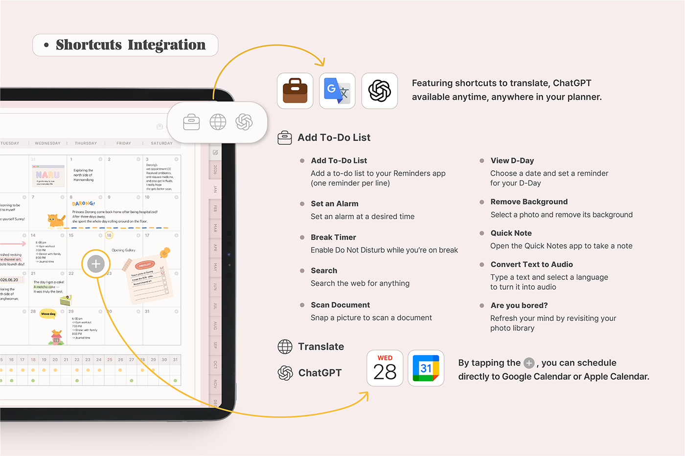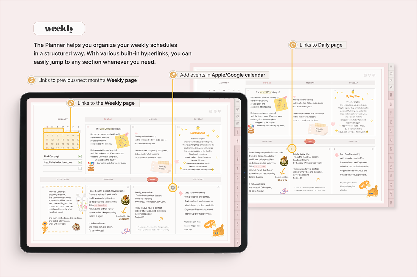 [Page Composition] - Hyperlinks - User Guide - Apple & Google Calendar Integration - Shortcuts Integration (Utility, Google Translate, ChatGPT) - Dec '25 Included - Cover - Index - Yearly : Calendar, Checklist, At a Glance - Monthly / Weekly / Daily Plans - Finance (6 types) - Life Log (10 types) - Note Binders (5) - Notes (6 types)